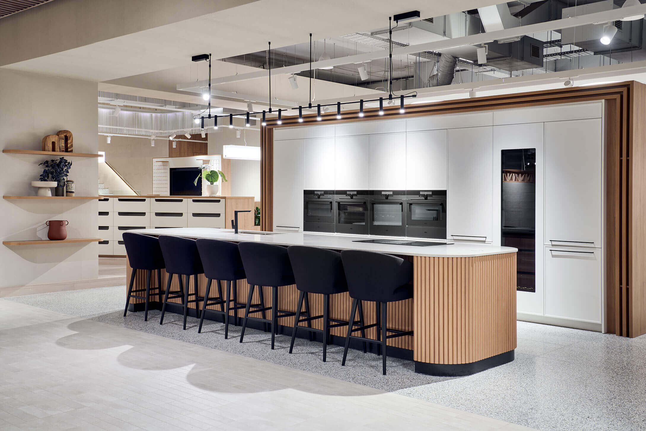 Polytec Steccawood is another great way to add feature sections to a kitchen. Its individual prefinished decorative battens can be applied in a vertical or horizontal manner. Steccawood is also a great choice if you prefer curved ends to your kitchen island.