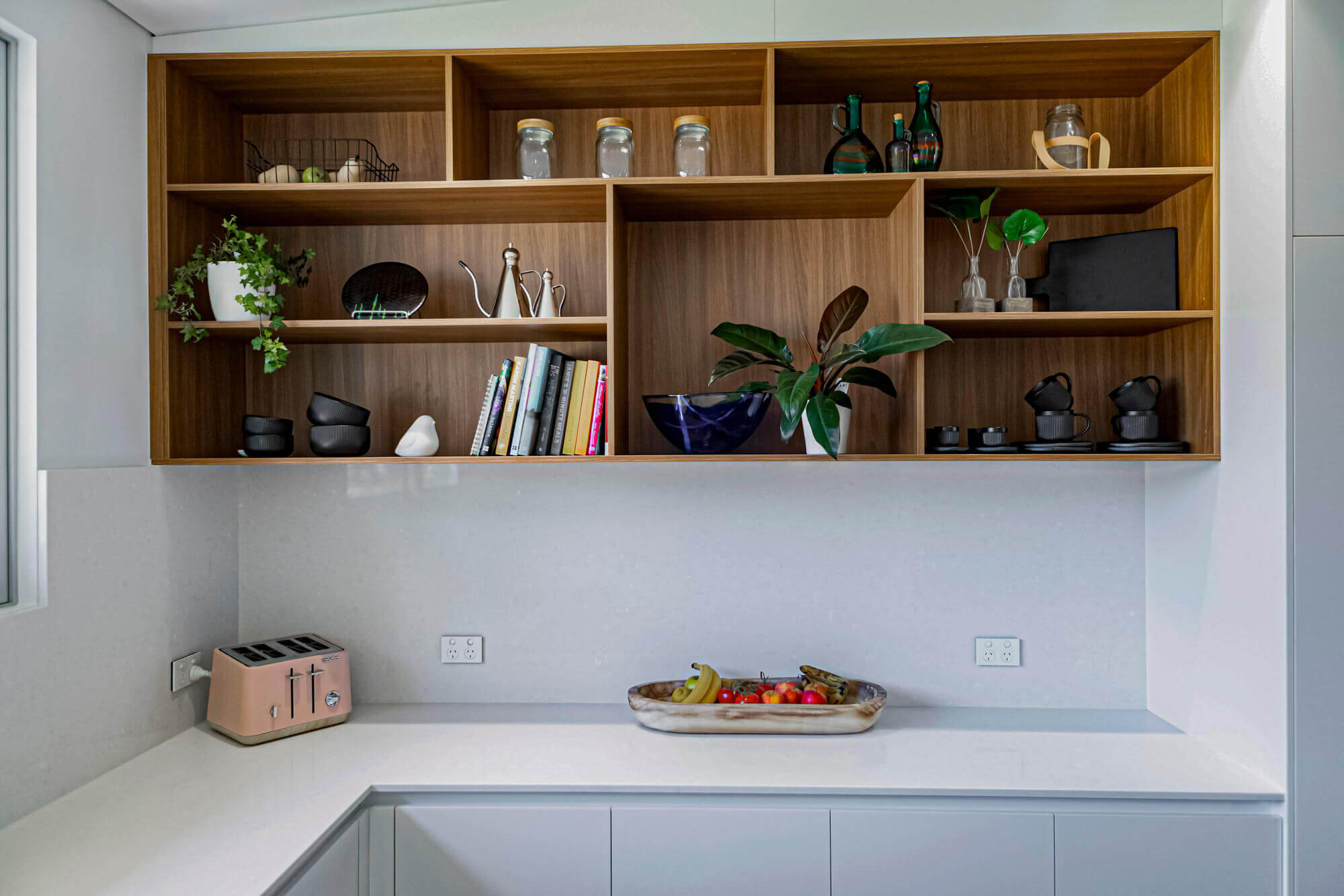 Feature shelving is a fantastic way of utilising wall space in your kitchen, and can serve as a visual feature point in your overall design. You can opt for open shelving, streamlined floating or boxed style shelves. Open shelving is an ever increasing choice in modern kitchens to create a more unique design. It has started replacing overhead cabinetry in many designs and can also be used to create asymmetrical designs.