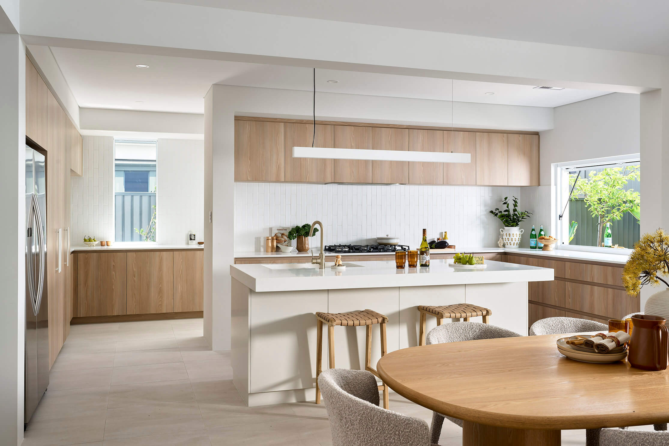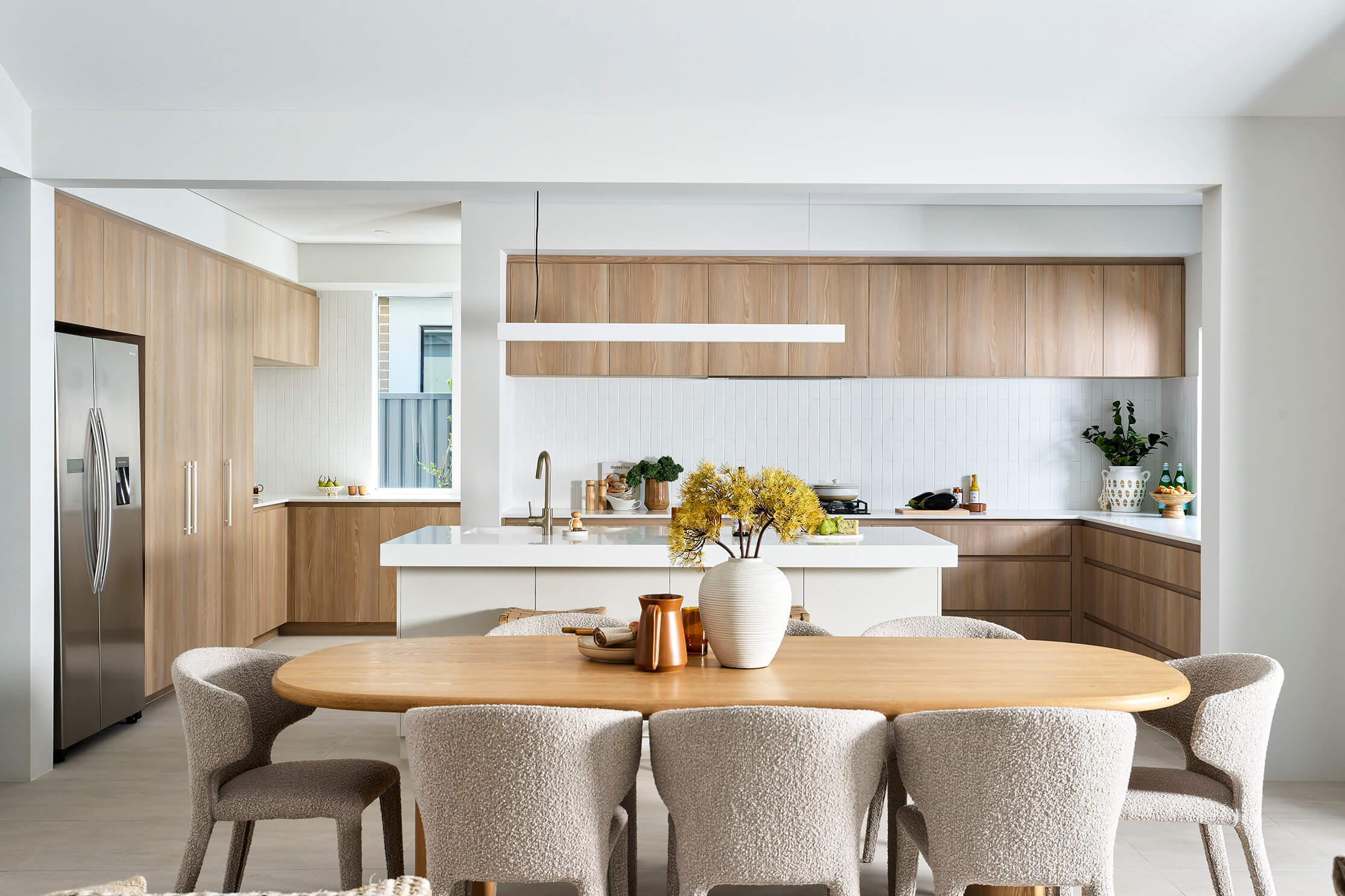 This Contemporary Coastal kitchen we created for Dale Alcock Homes is light, bright, and warm. Timber-tone cabinetry paired with crisp white surfaces creates an airy, inviting feel, while the open layout makes it perfect for everyday living and entertaining.