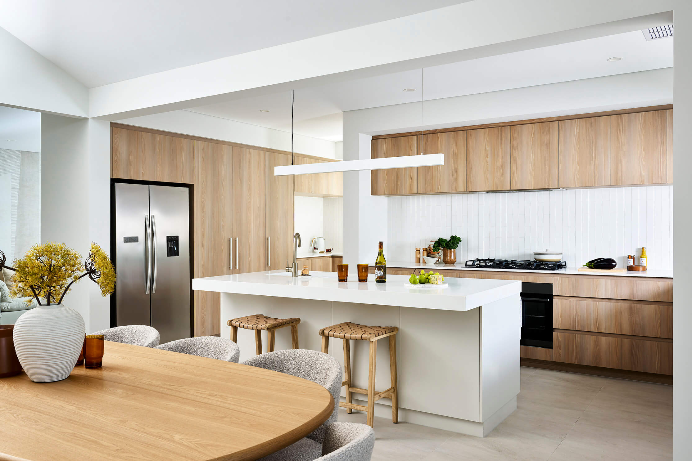 The cabinetry is Polytec’s Casentino Beech Woodmatt, a warm mid-tone timber with soft grey undertones. The island bench contrasts in Poyltec’s Gossamer White, a soft, warm white that complements the timber.