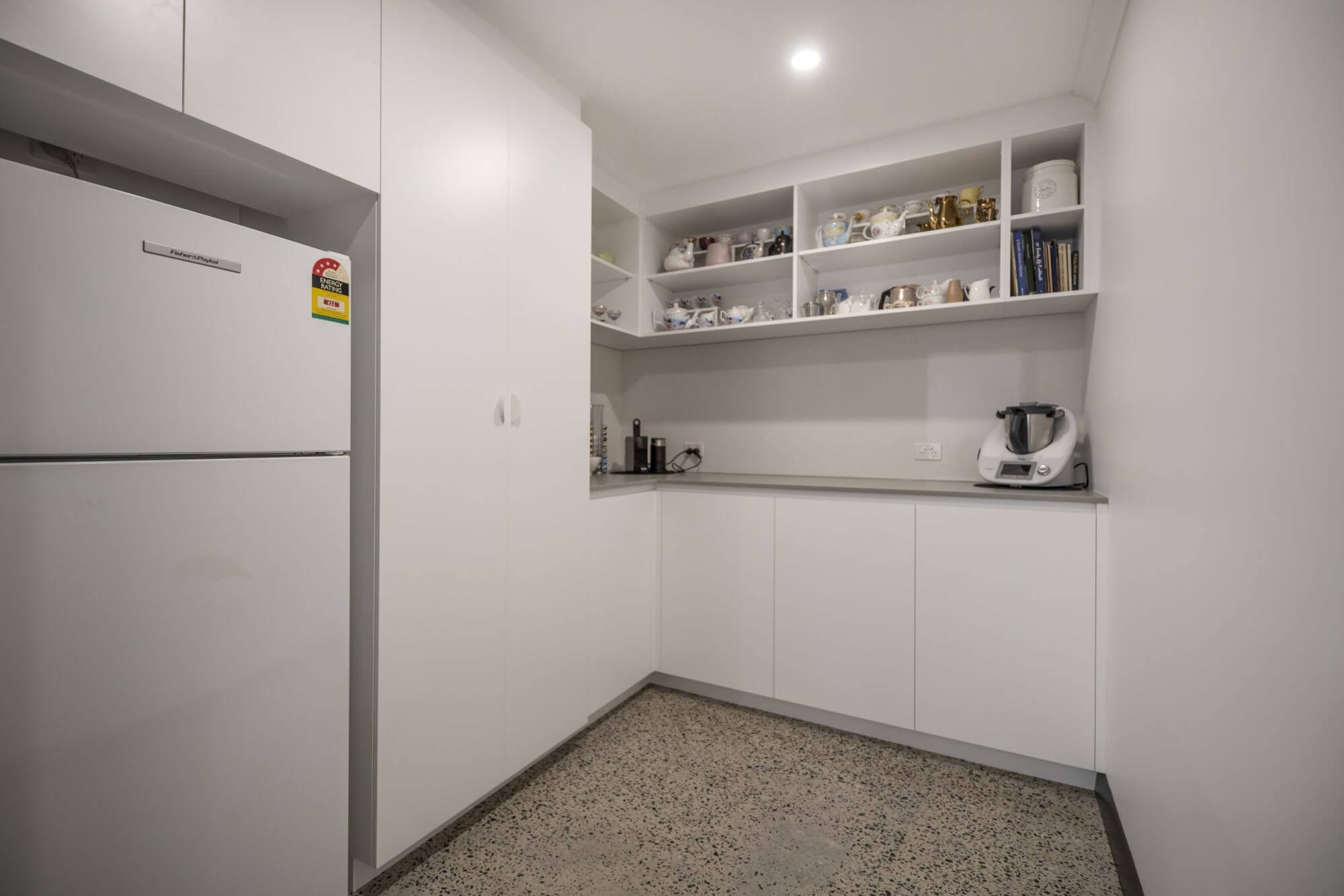 Kitchen storage was high on the priority list for these clients. This kitchen has banks of drawers throughout to maximise storage options. There is also a separate butlers pantry with loads of cupboard space including a large pantry and open box shelving to display and store a beautiful collection of tea sets.