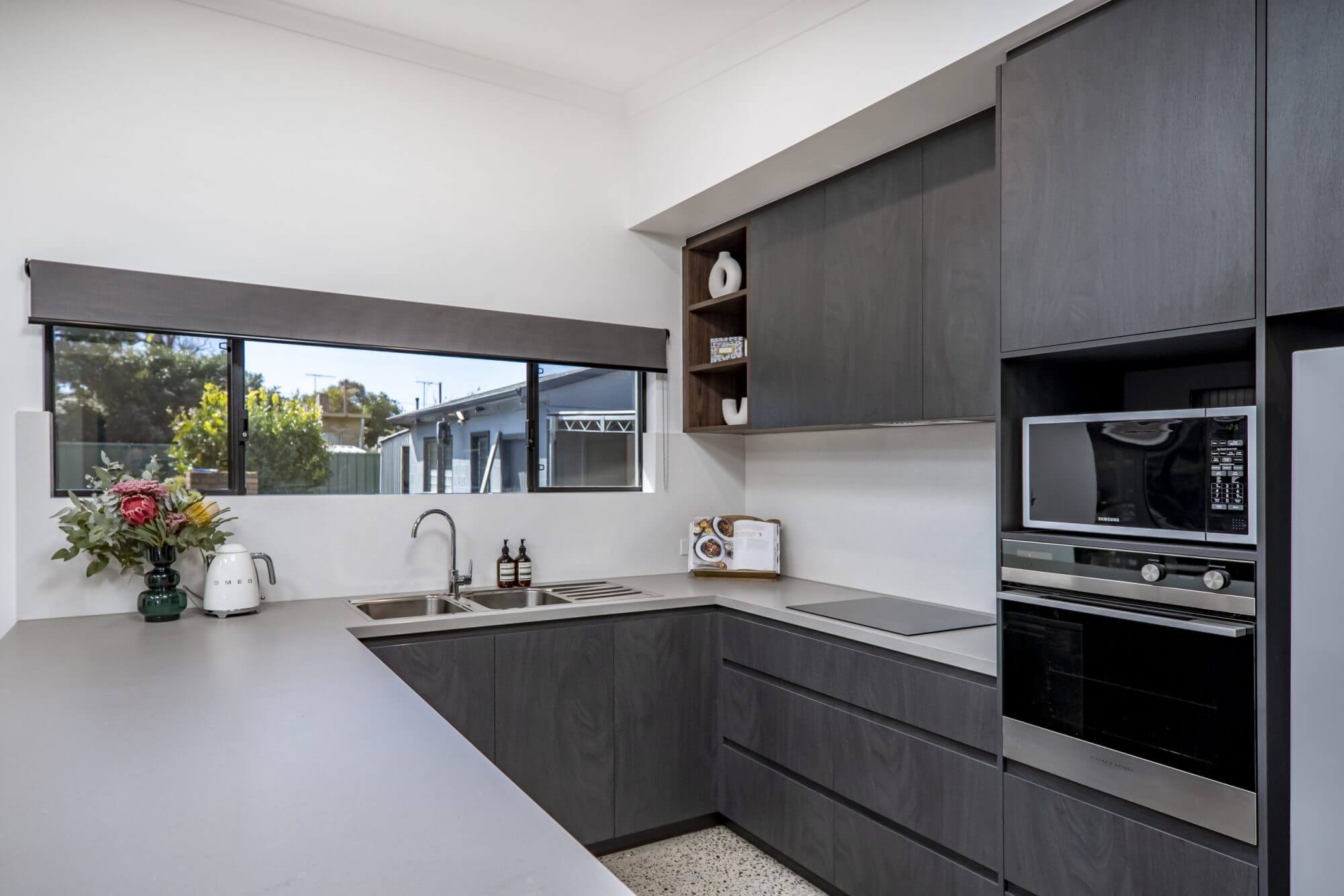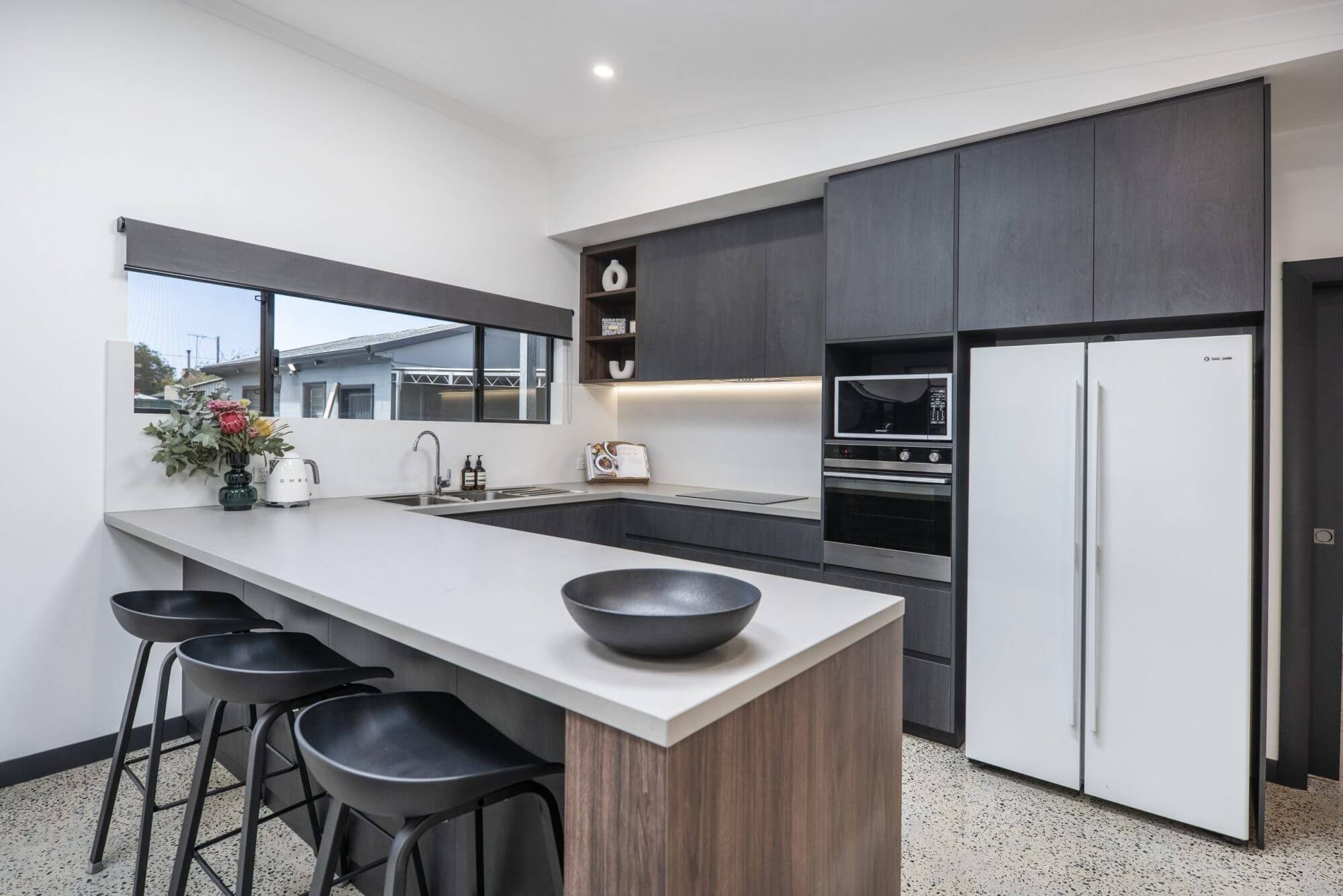 The kitchen design in this home was intentionally designed to accentuate the sleek and clean lines in this home. The Polytec Black Ply cabinetry is handleless and we have used finger rails for the banks of drawers throughout. There is a touch of Jarrah look laminate applied to the feature shelving and kitchen peninsula to tie in the colours of the Jarrah flooring in the original parts of this home.