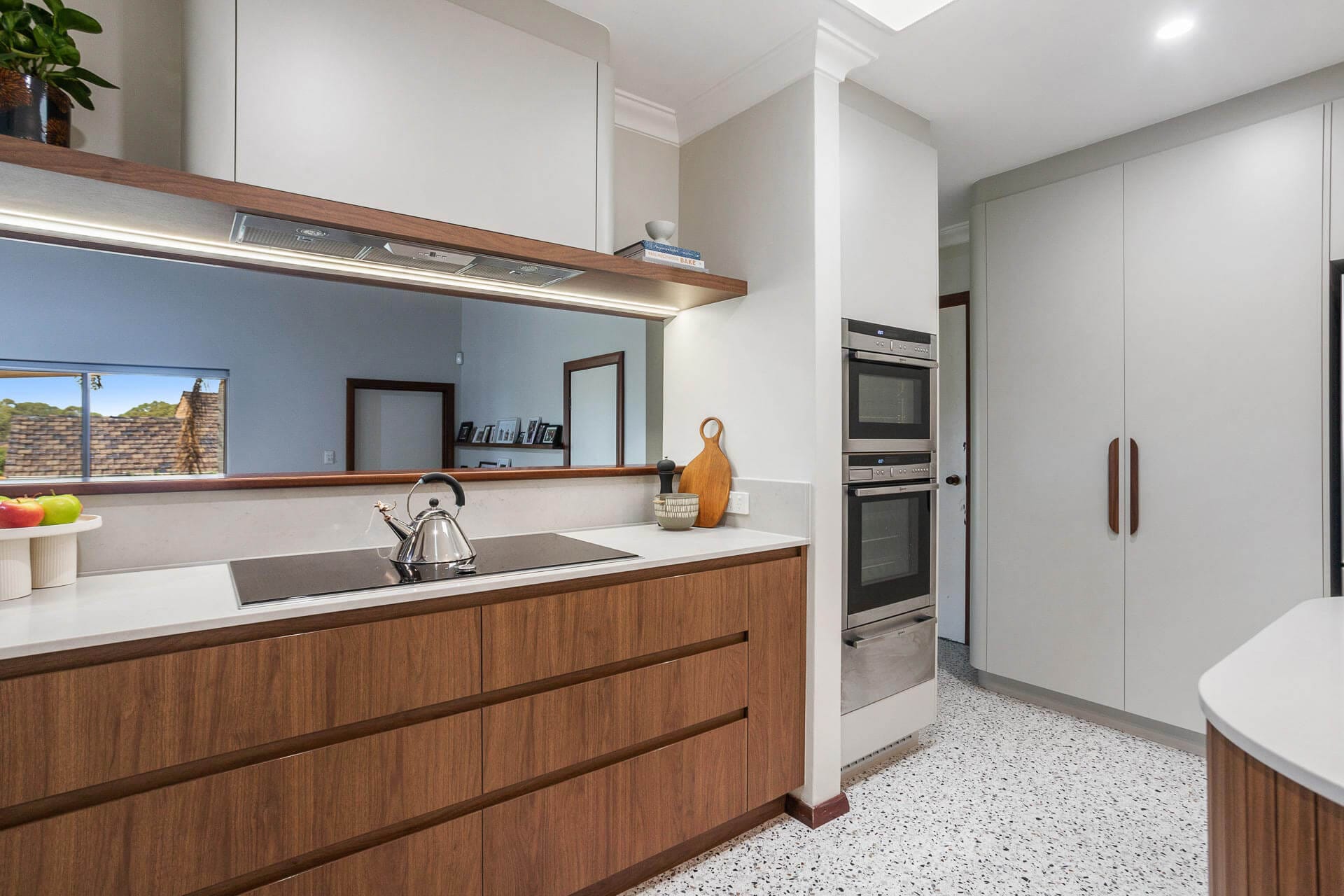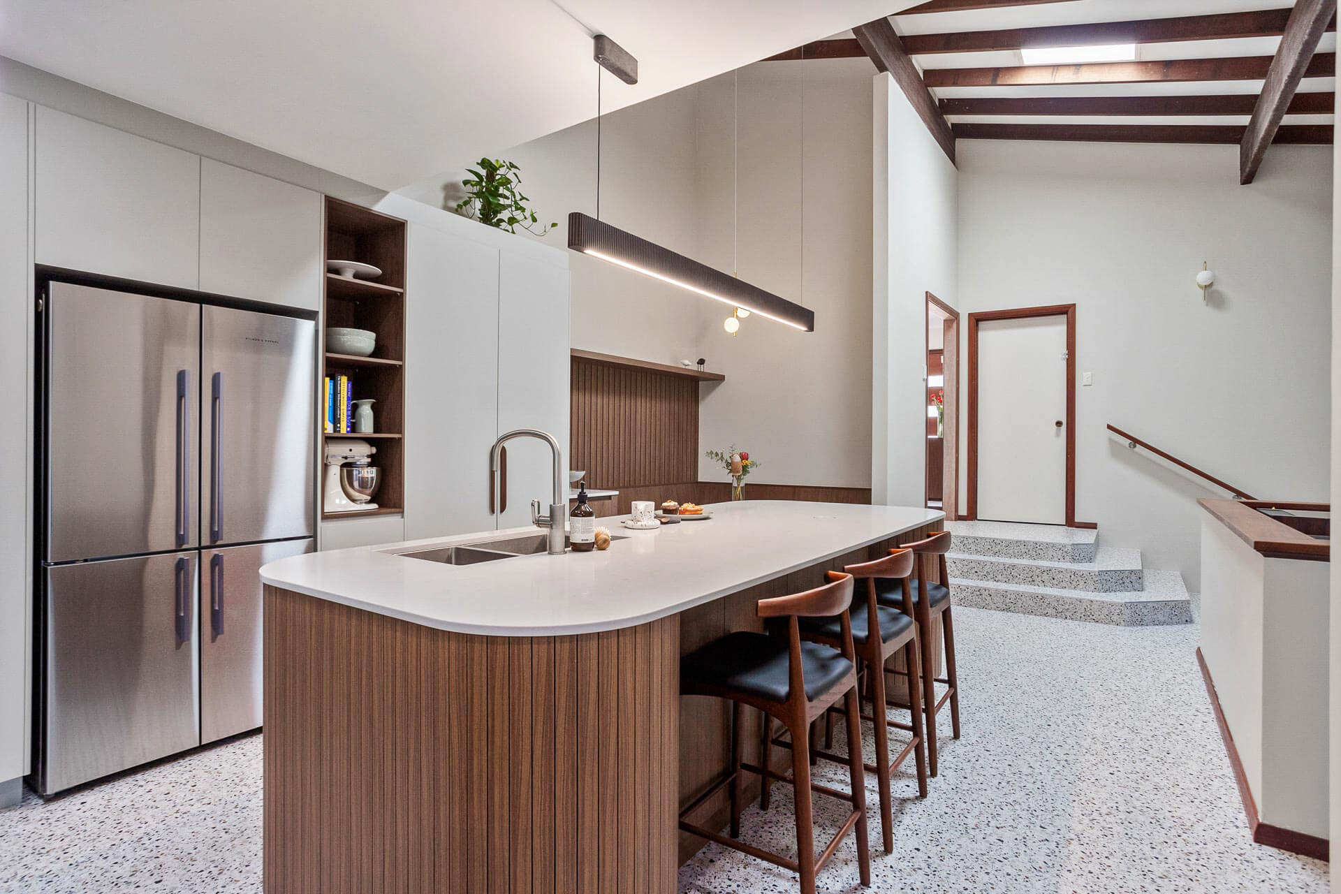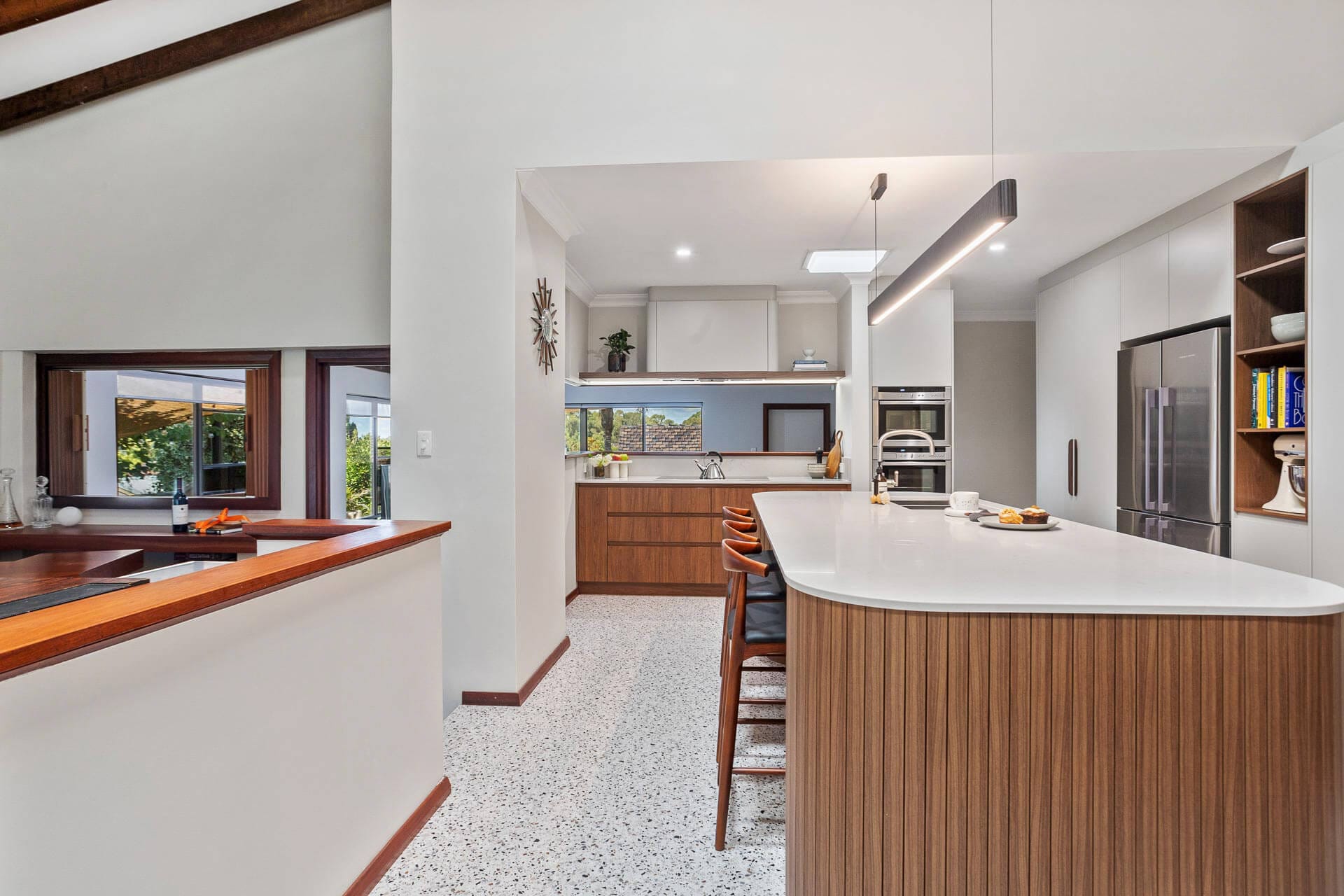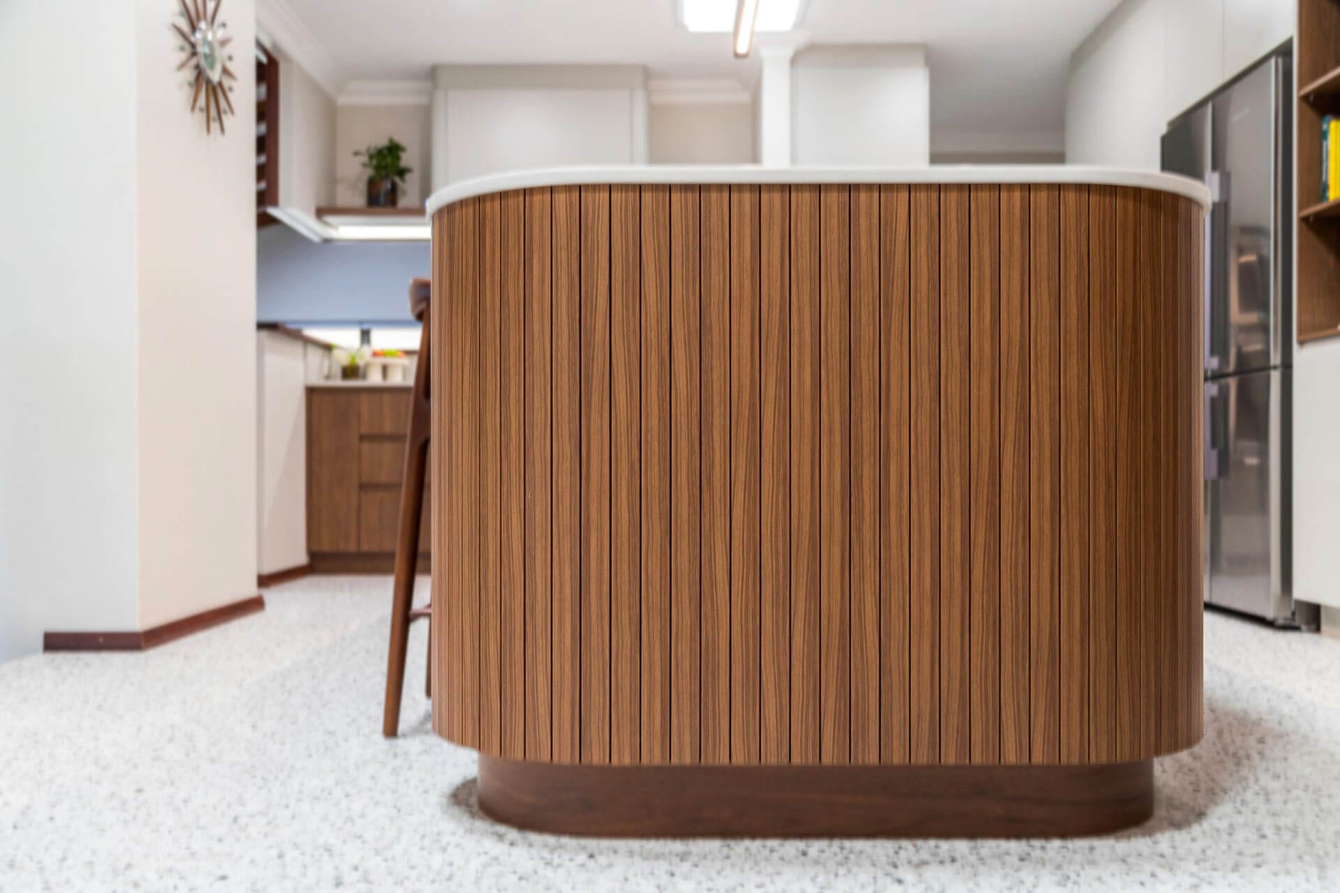 Polytec Florentine Walnut cabinetry and STECCAWOOD battens on the island and wall panels coordinate beautifully with the existing wooden panelling in the ceiling, skirting and wall capping. Working in with existing elements like this is typical of modern Mid-Century design kitchens.