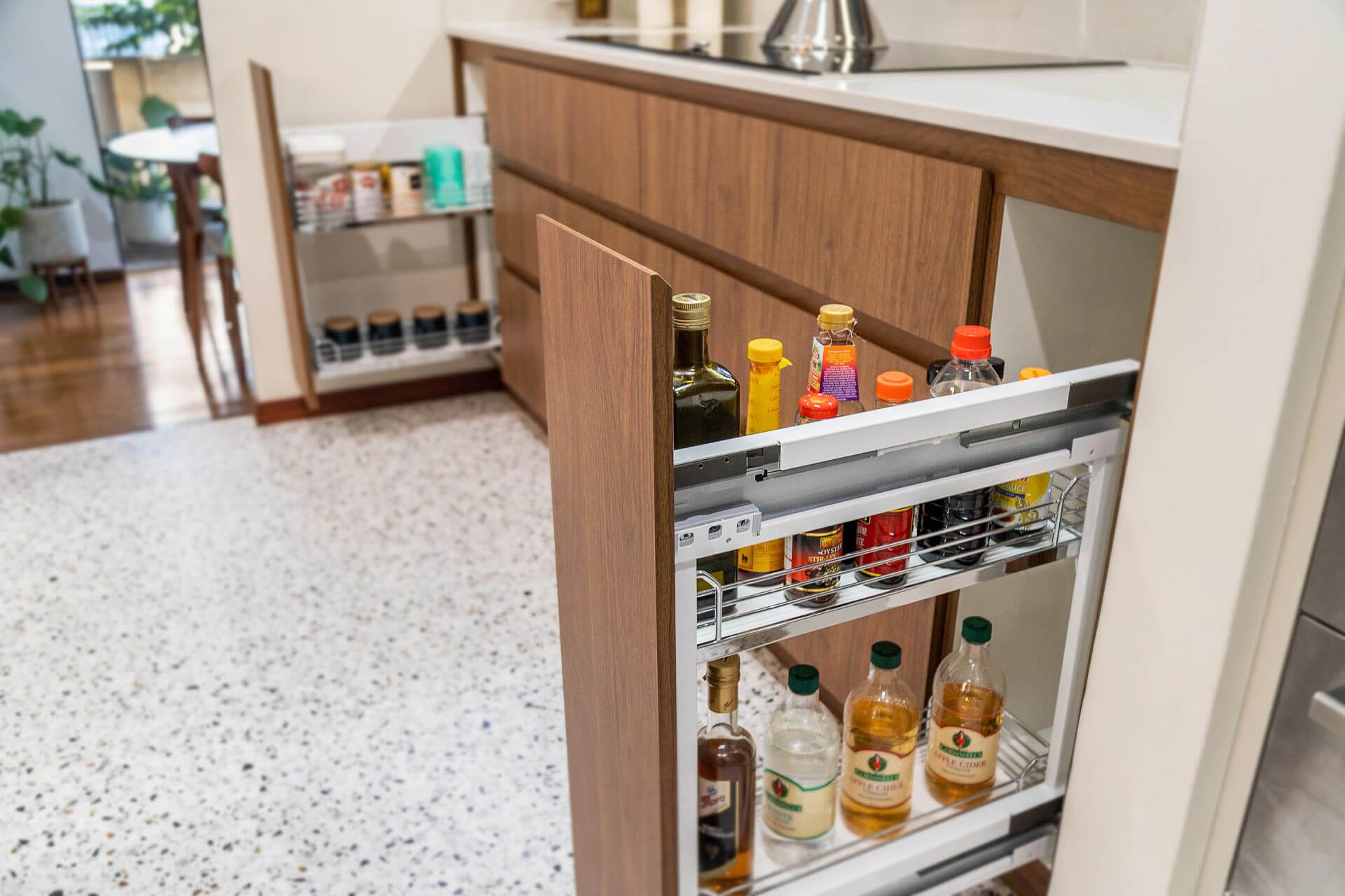 Even though this kitchen is inspired by design elements of the past; it is jam packed with modern kitchen technology concealed seamlessly behind custom cabinetry. Under the surface in this kitchen is a custom integrated pantry design combining the Hafele Tandem Pantry with a shelf and drawer design.