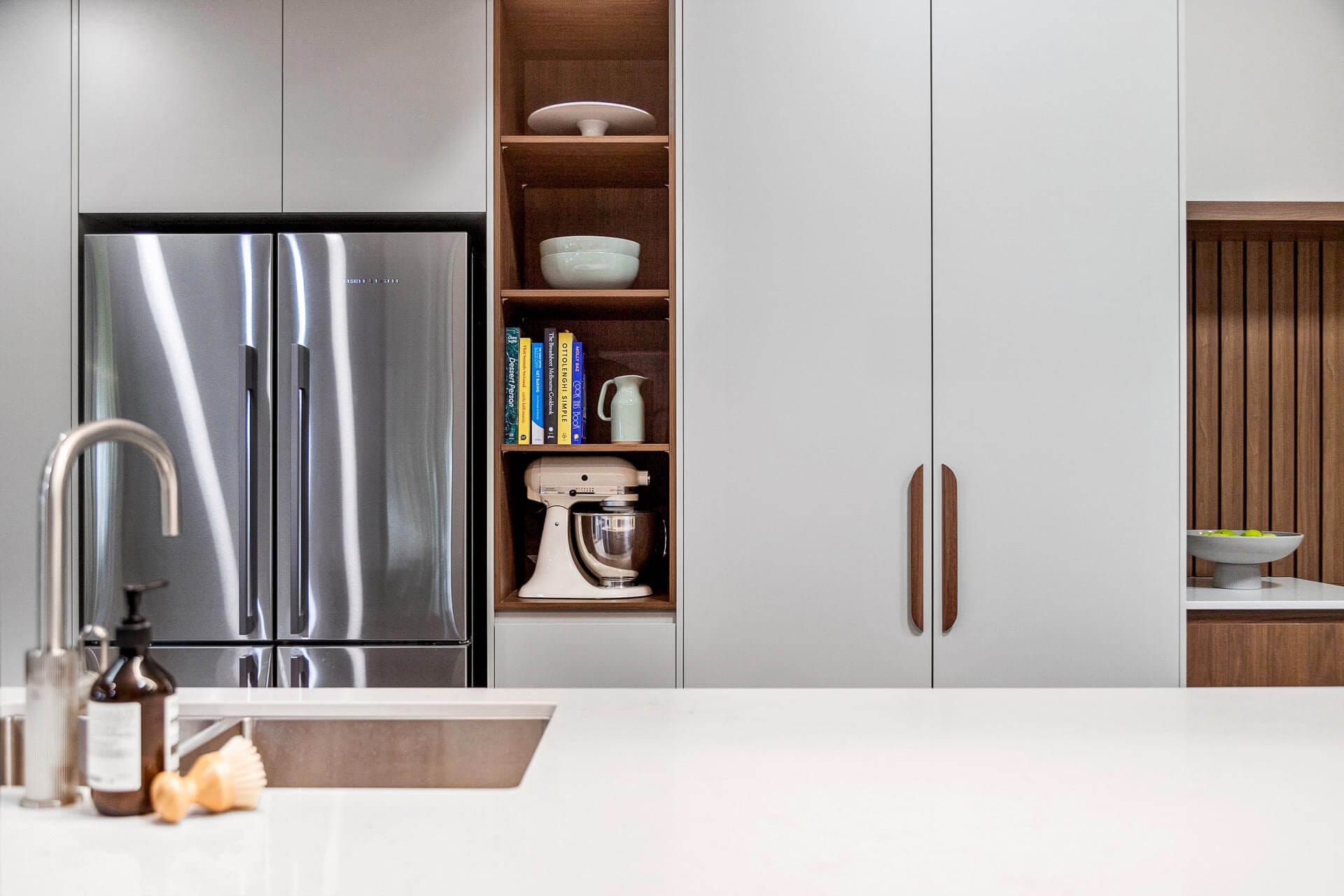 Cabinetry throughout this kitchen is handleless with the exception of the pantry and appliance cupboard which feature beautiful Kethy Archive wooden handles bringing a retro and nostalgic look and feel.