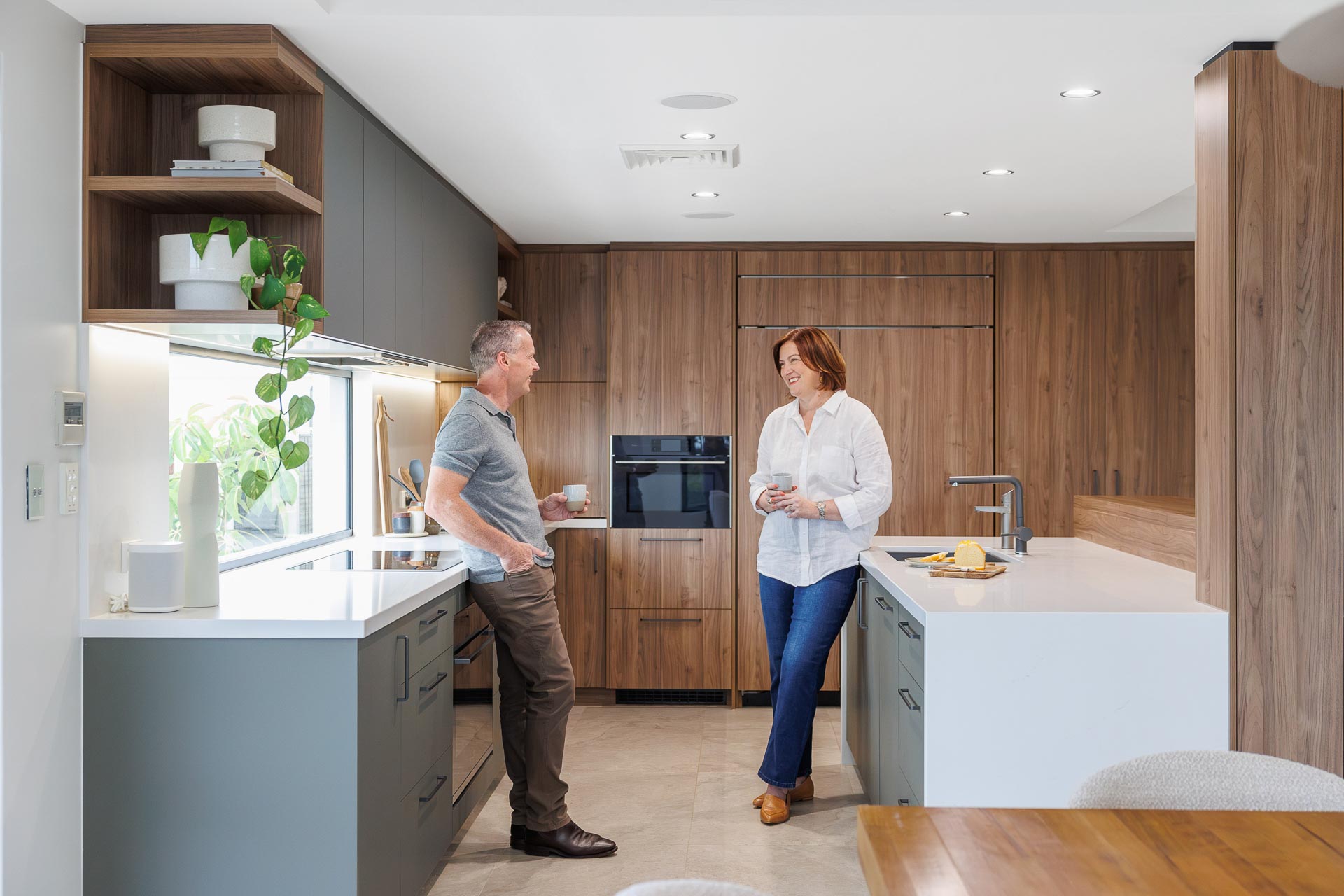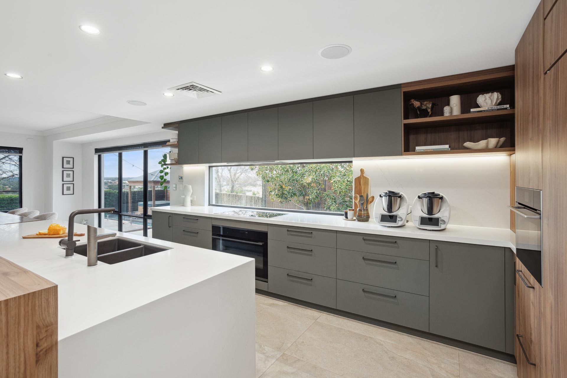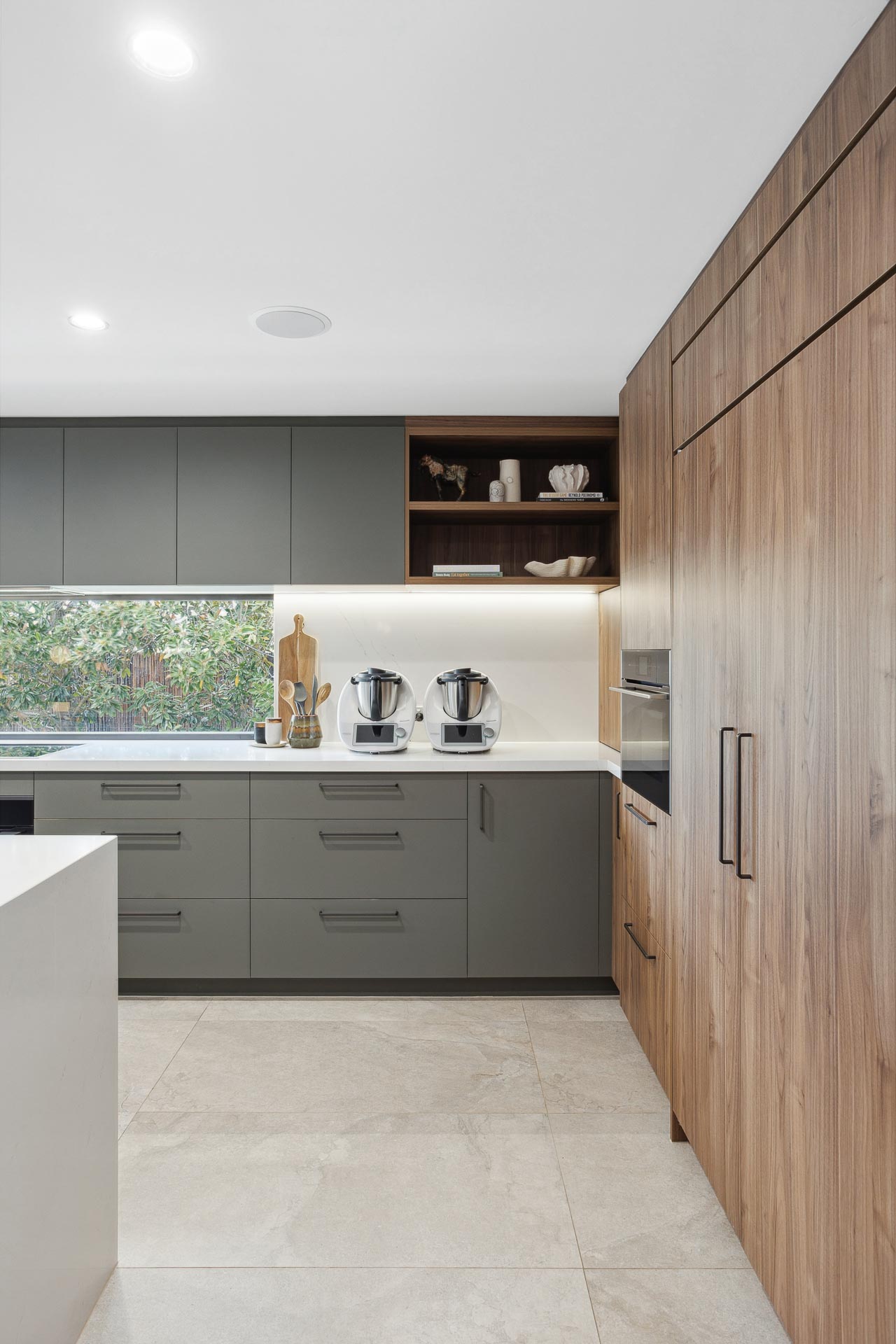 Having previously had a white kitchen; Tamara was inspired by a warm earthy palette of colours. The cabinetry selections in this kitchen are Polytec Forage VENETTE and Notaio Walnut Woodmatt. The Forage VENETTE offers a striking mid-tone khaki green and is luxury in it’s appearance with it’s pure matt finish and fingerprint resistant surface which is perfect for the handleless overhead cabinetry