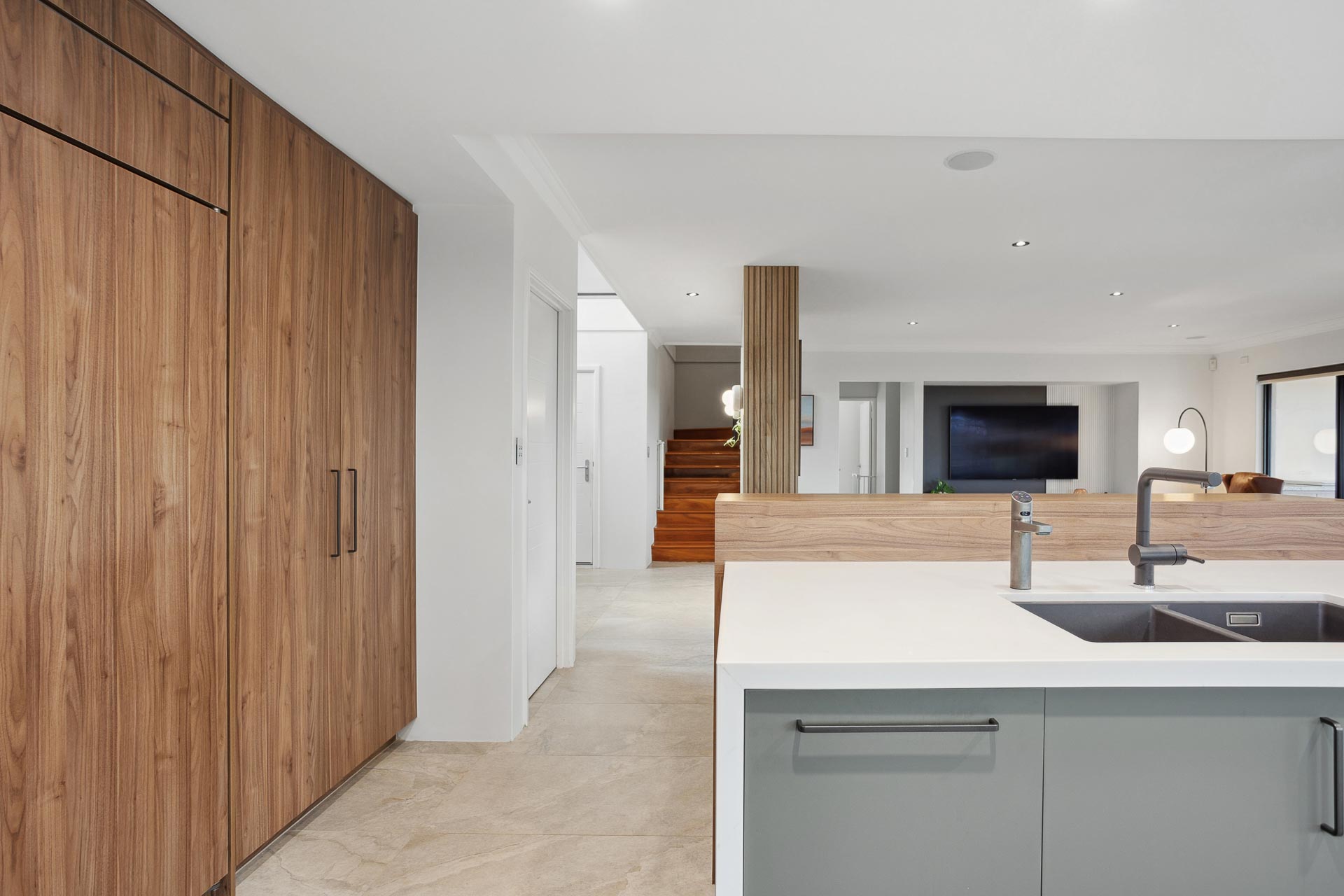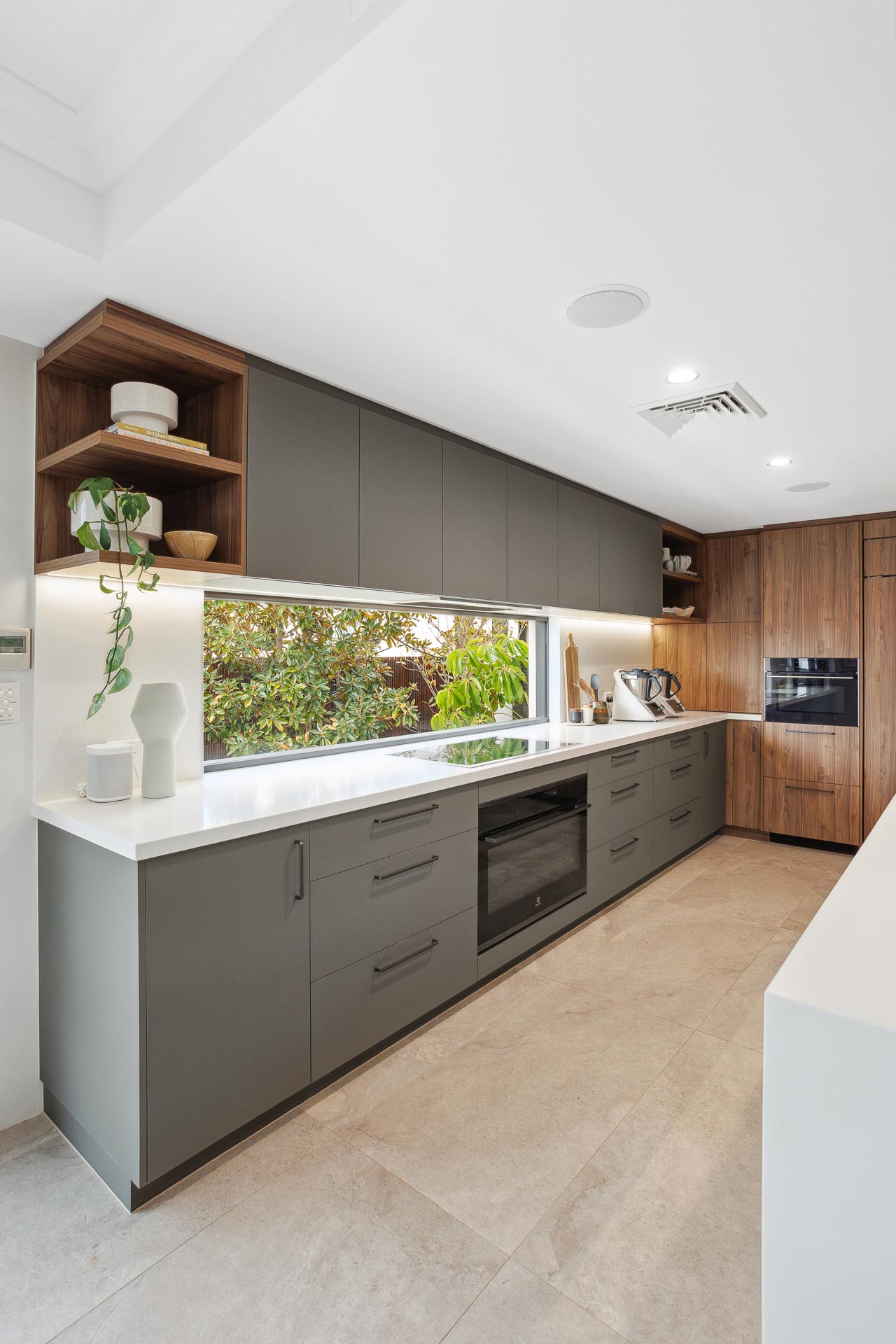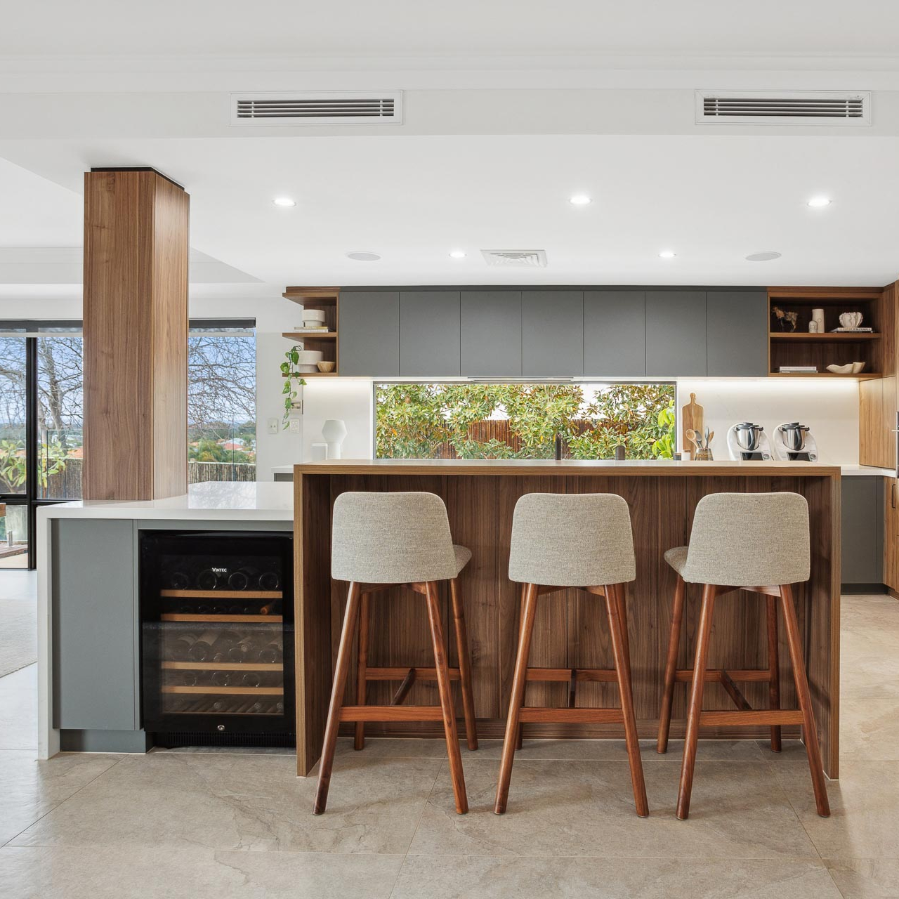 Having previously had a white kitchen; Tamara was inspired by a warm earthy palette of colours. The cabinetry selections in this kitchen are Polytec Forage VENETTE and Notaio Walnut Woodmatt. The Forage VENETTE offers a striking mid-tone khaki green and is luxury in it’s appearance with it’s pure matt finish and fingerprint resistant surface which is perfect for the handleless overhead cabinetry