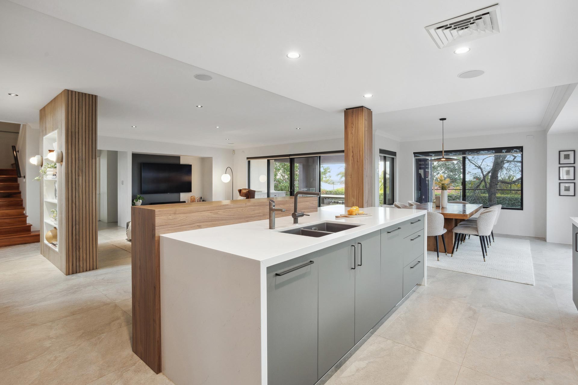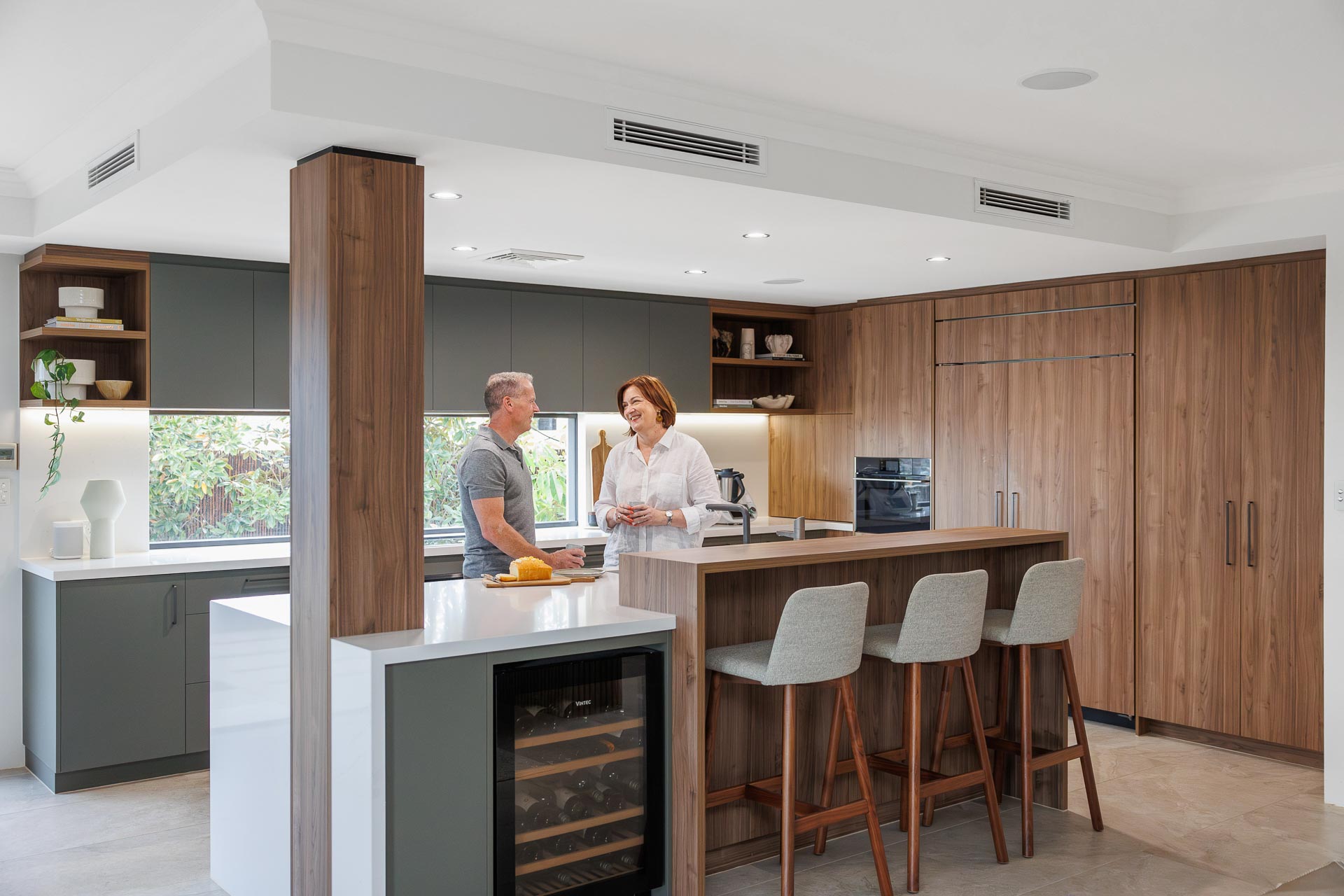 Their old white kitchen was tired and dated. Our brief was to create a new kitchen that included more bench space, more storage, concealed appliances; and was more social when entertaining. A more contemporary kitchen design with the latest colours, features and trends, and that also improved the presentation of a circular structural roof column that couldn’t be removed as part of this kitchen renovation.