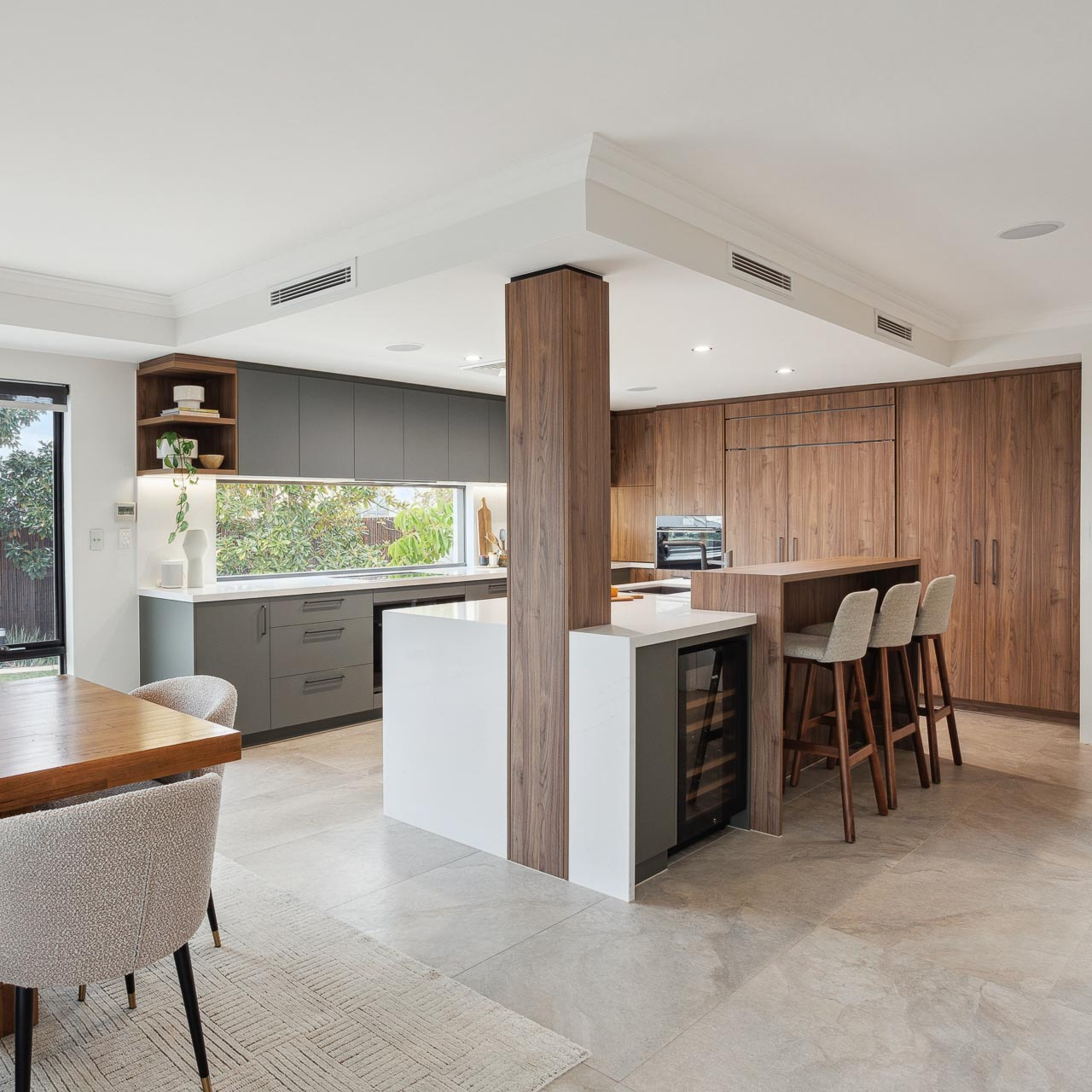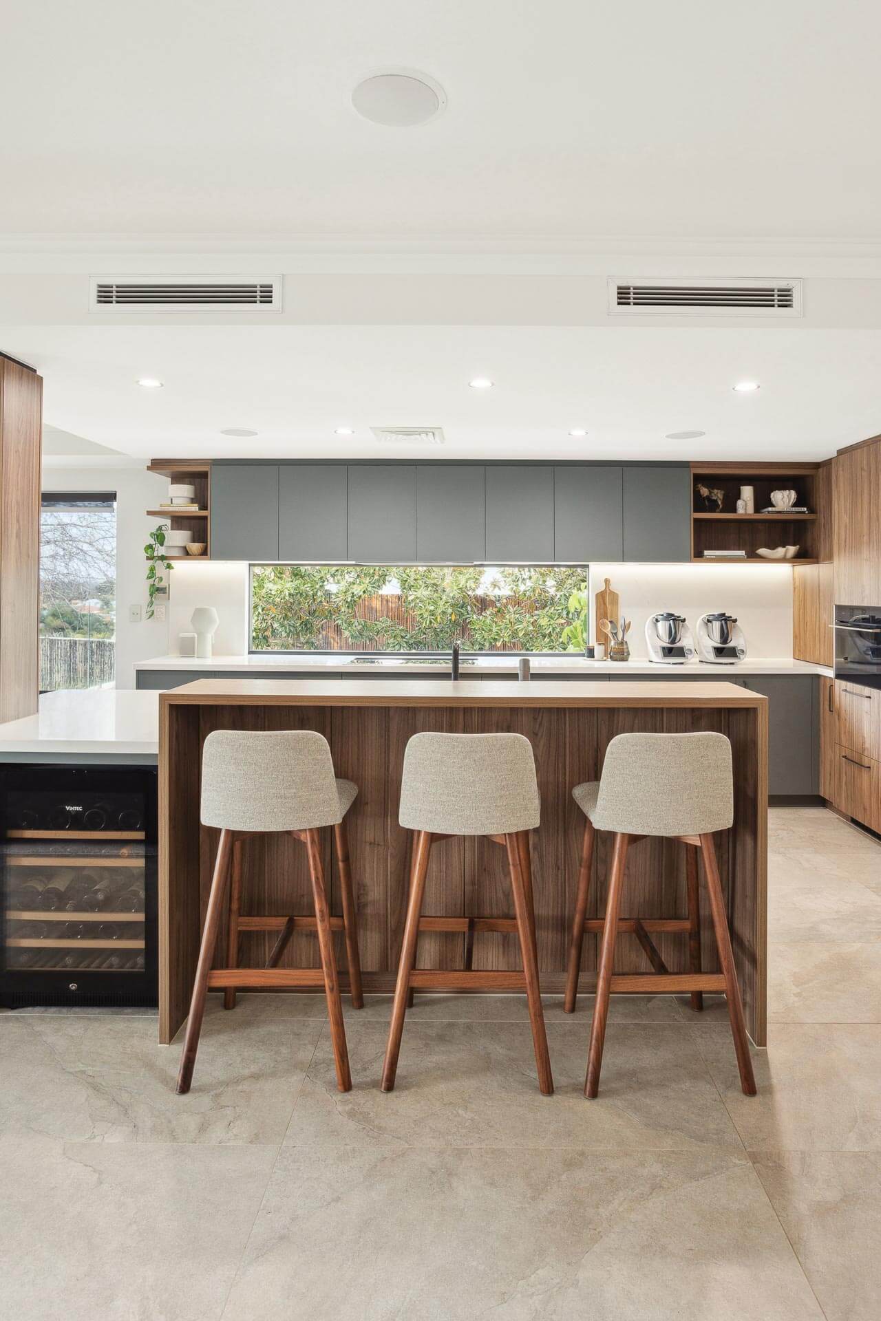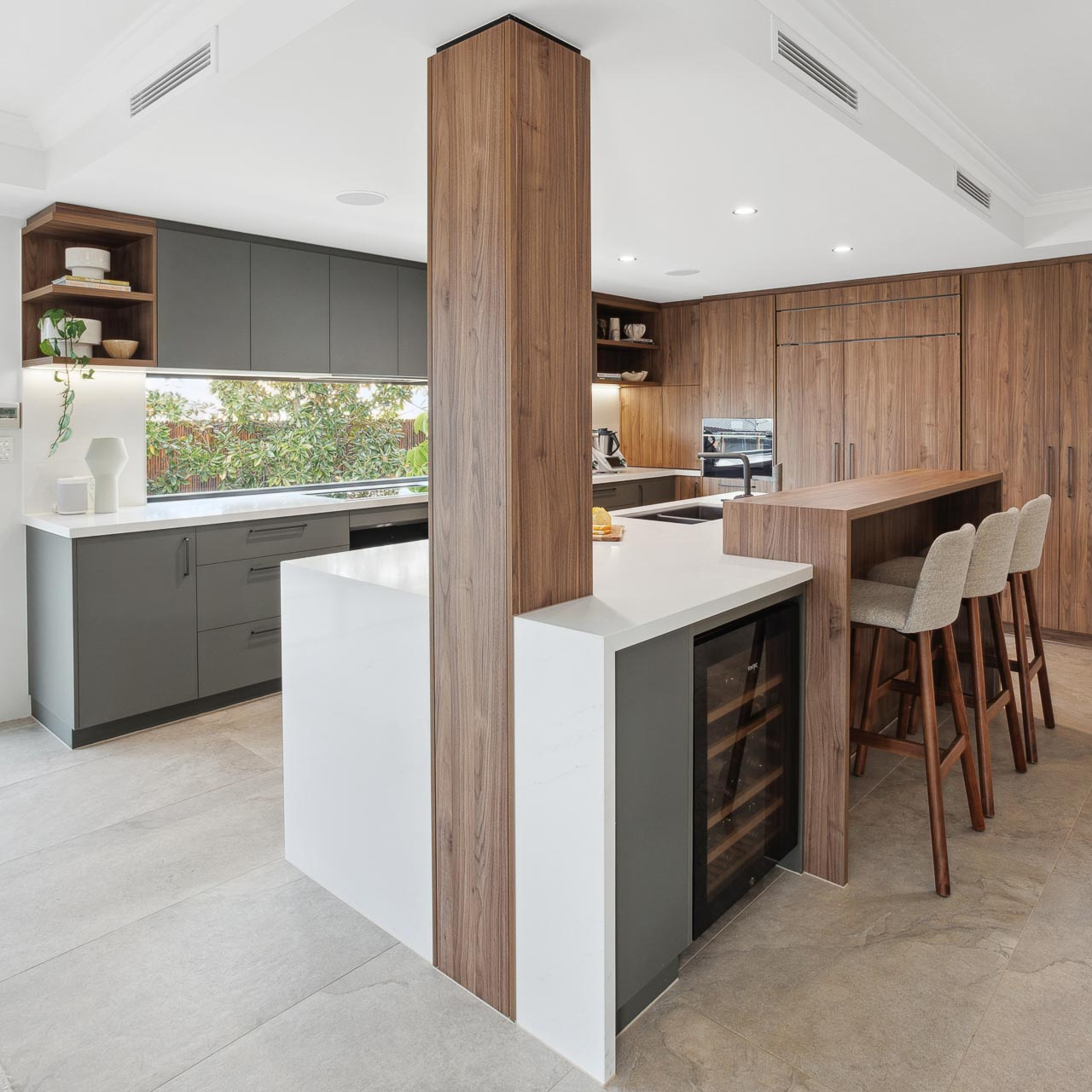 The new island design for this kitchen renovation completely transforms the appearance and usability of the kitchen island in this home. To conceal the structural column we have encased it in a rectangular tall cabinetry design feature that runs floor to ceiling through the islands waterfall edge. The island now also includes an upstand design with seating, an integrated wine fridge, concealed storage, double waterfall stone edges and a creative colour application of laminate and stone.