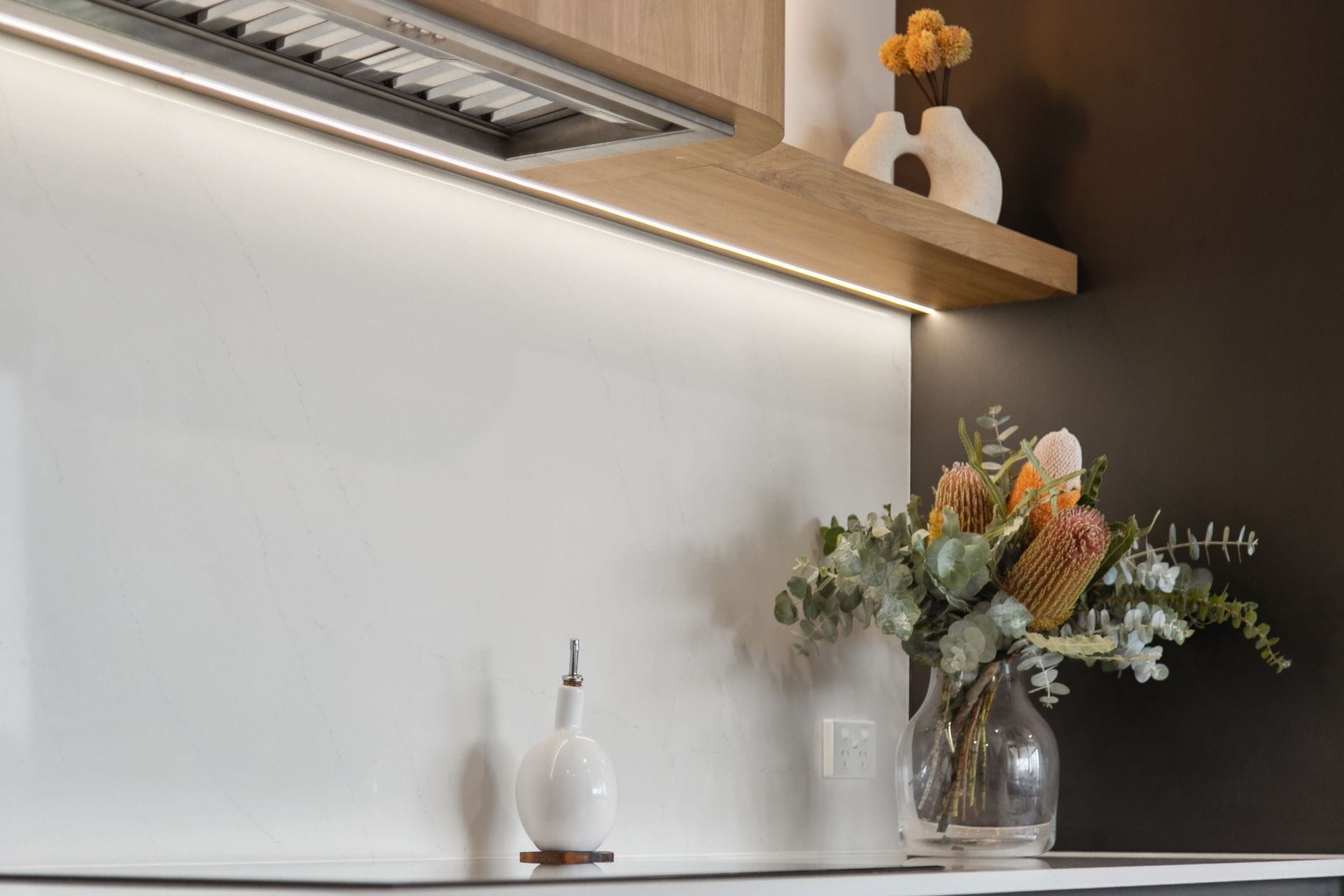 Integrated LED strip lighting runs beneath the rangehood and continues along the back of the kitchen, providing soft ambient lighting while statement wall sconces add character and enhance the contemporary look.