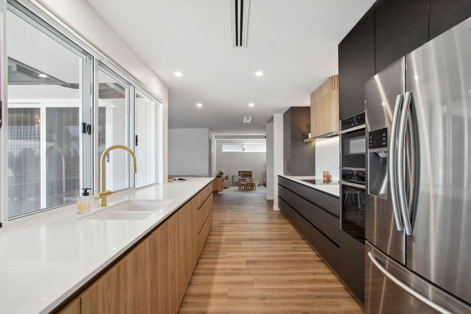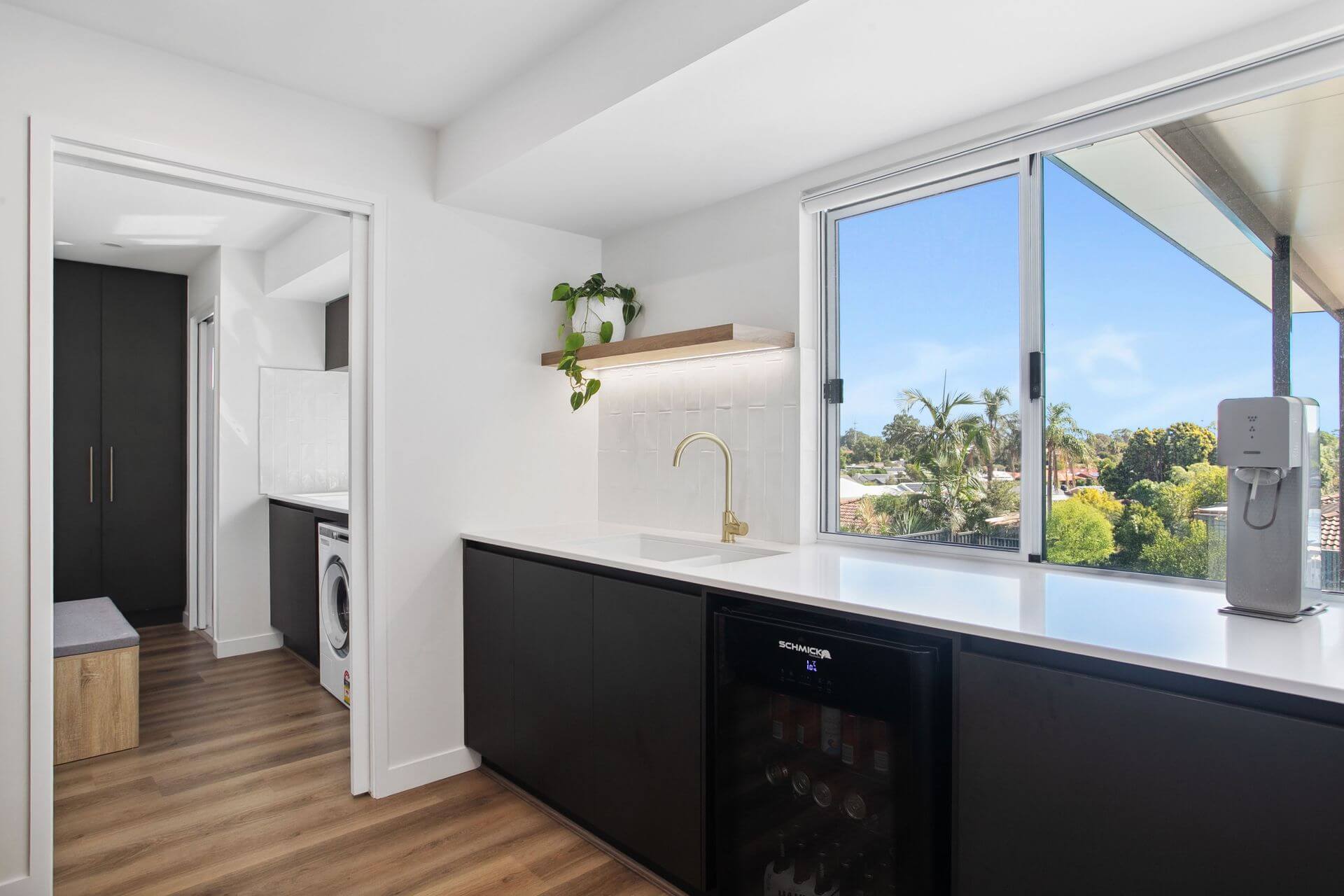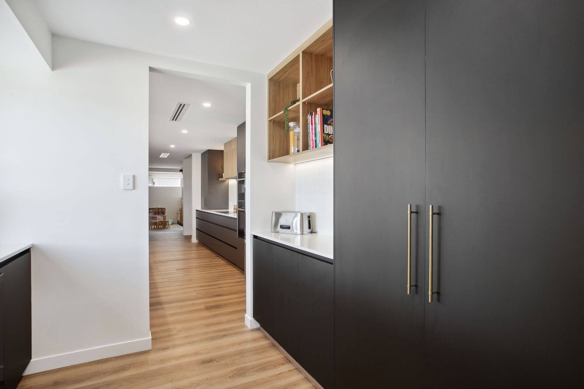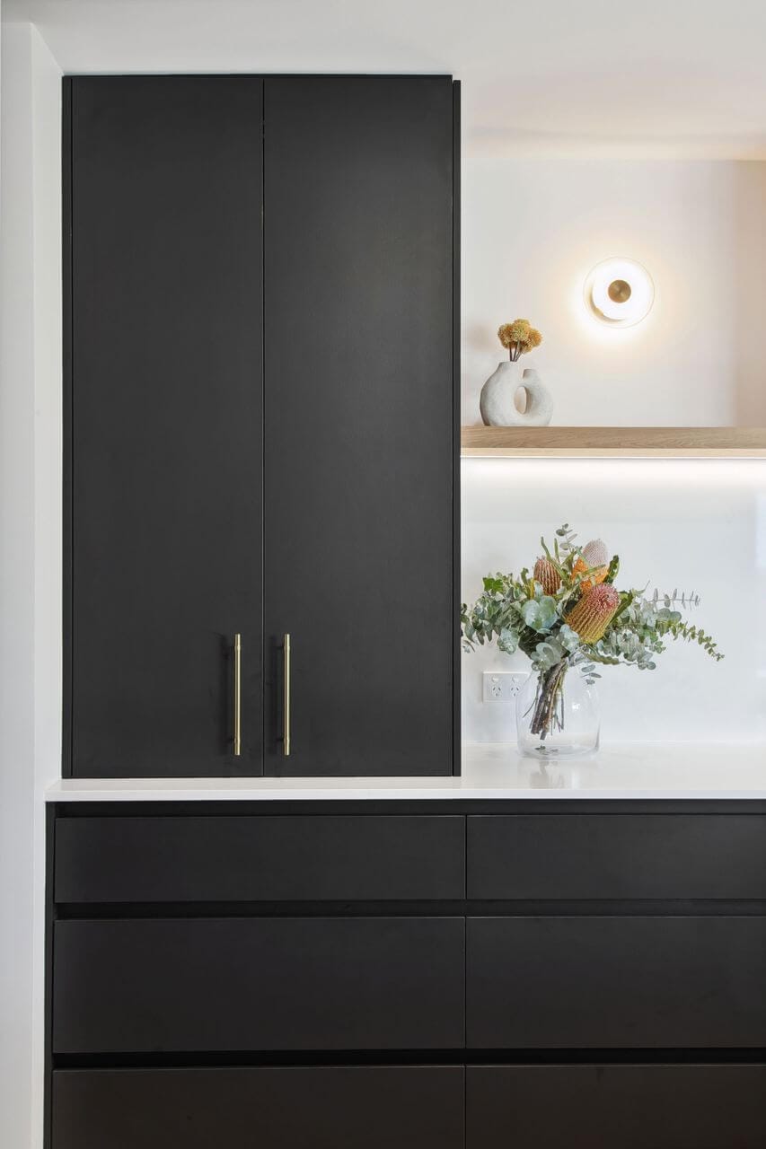 The renovation extends beyond the kitchen to include a scullery and laundry; both designed with the same cohesive finishes. The galley-style layout maximises storage and functionality, creating efficient work zones with the same sophisticated feel as the kitchen.
