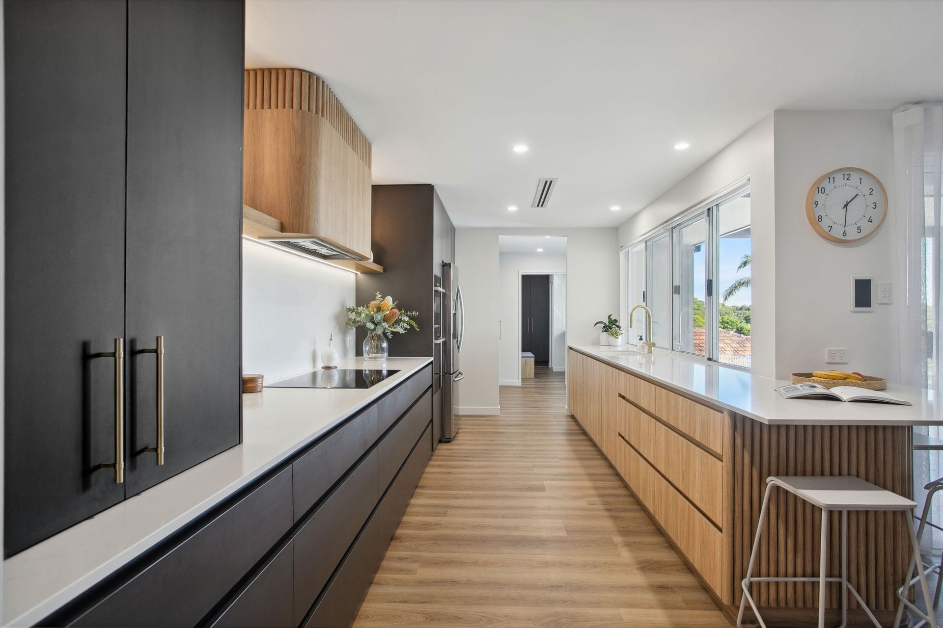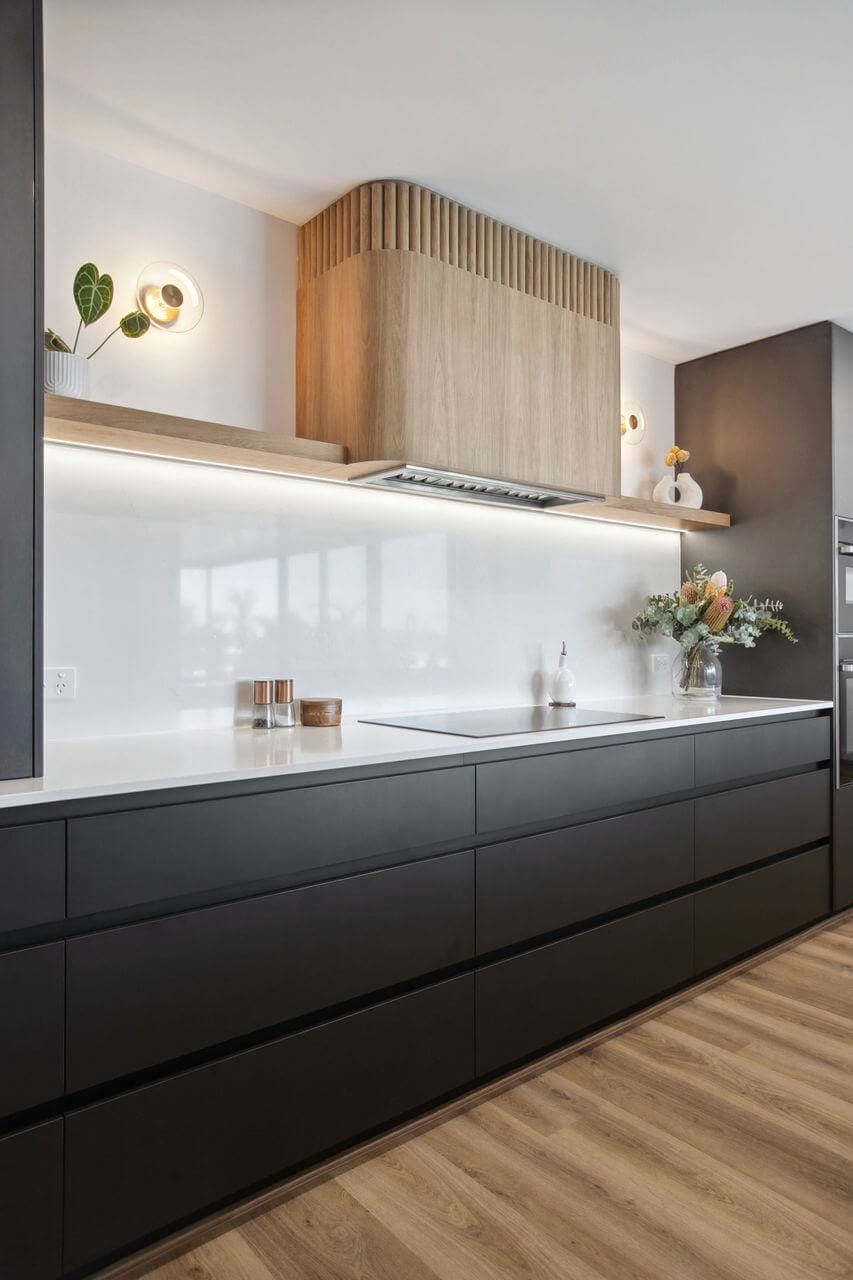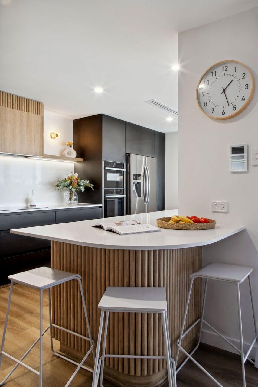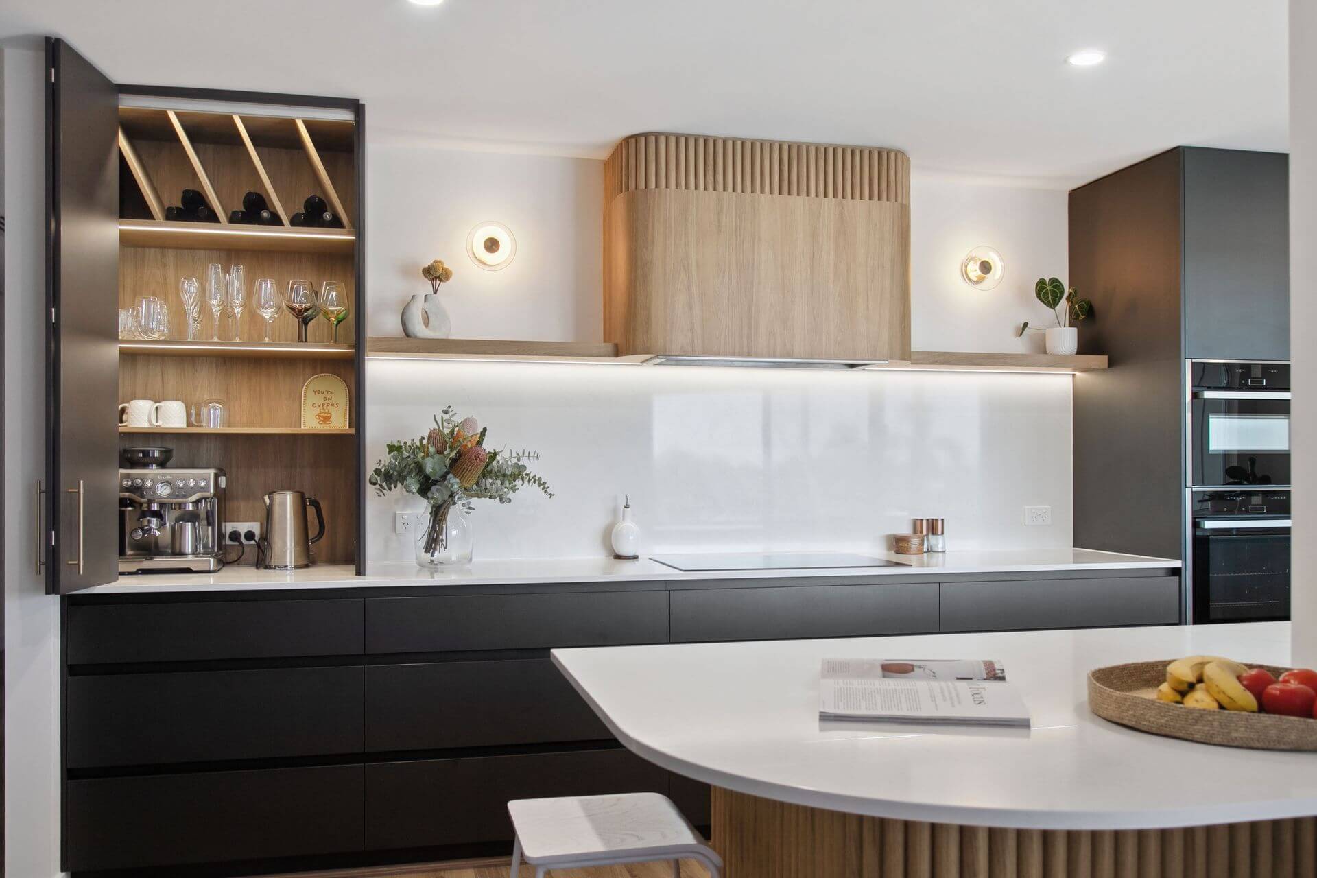A standout feature of this kitchen is the peninsula island with a sweeping curve, which leads the eye toward the curved rangehood, echoing its design and enhancing the visual flow of the space. Steccawood detailing on both the rangehood and island bench introduces subtle texture and depth, reinforcing the modern aesthetic.