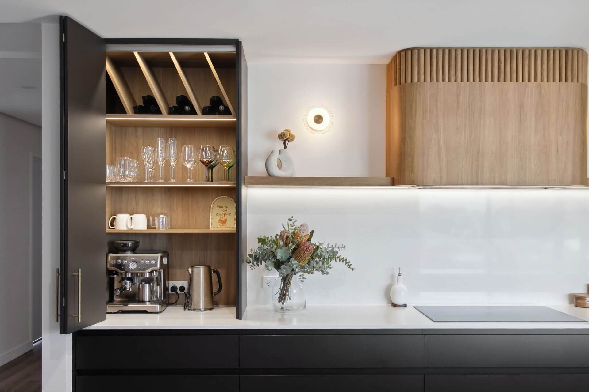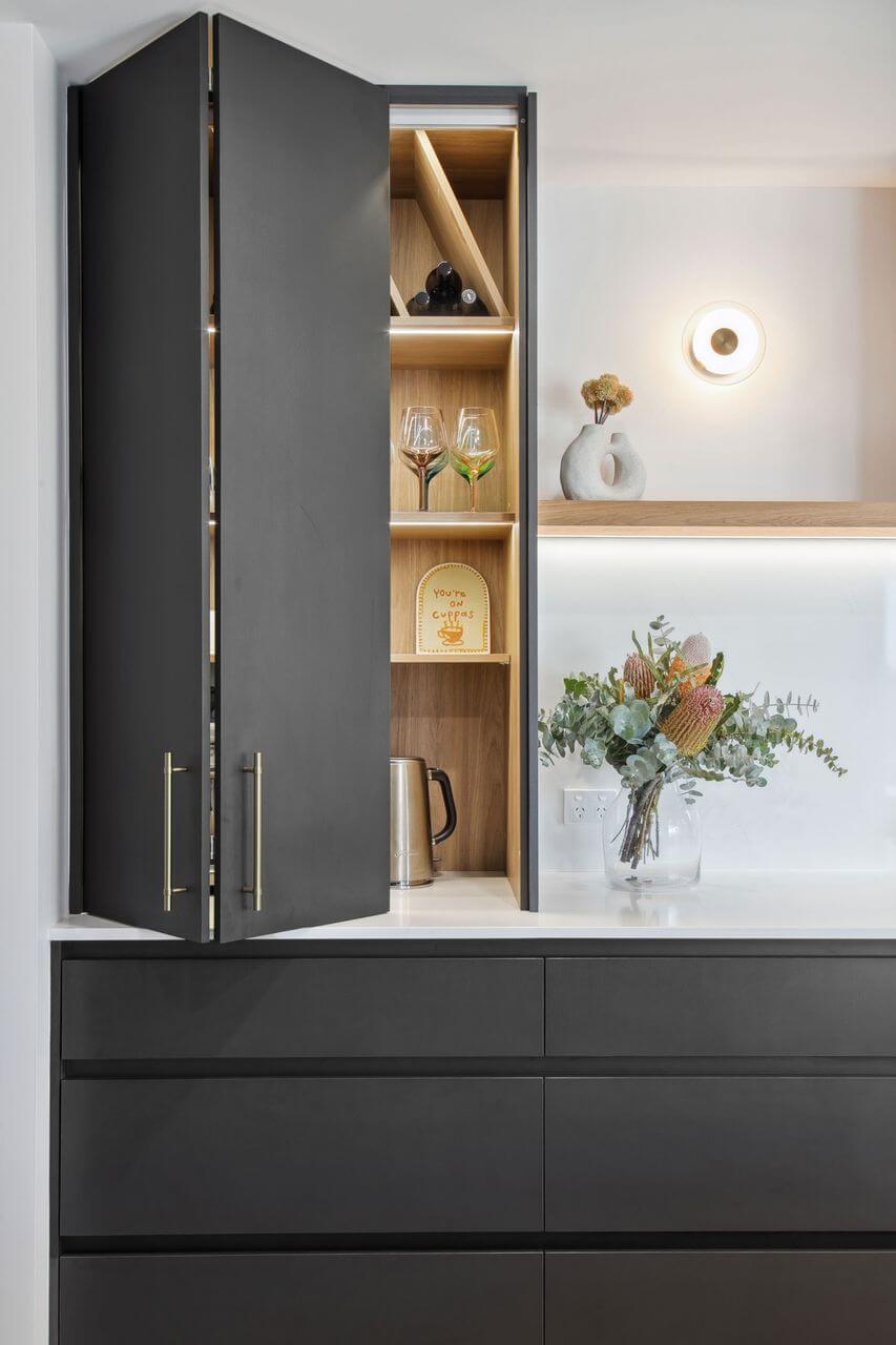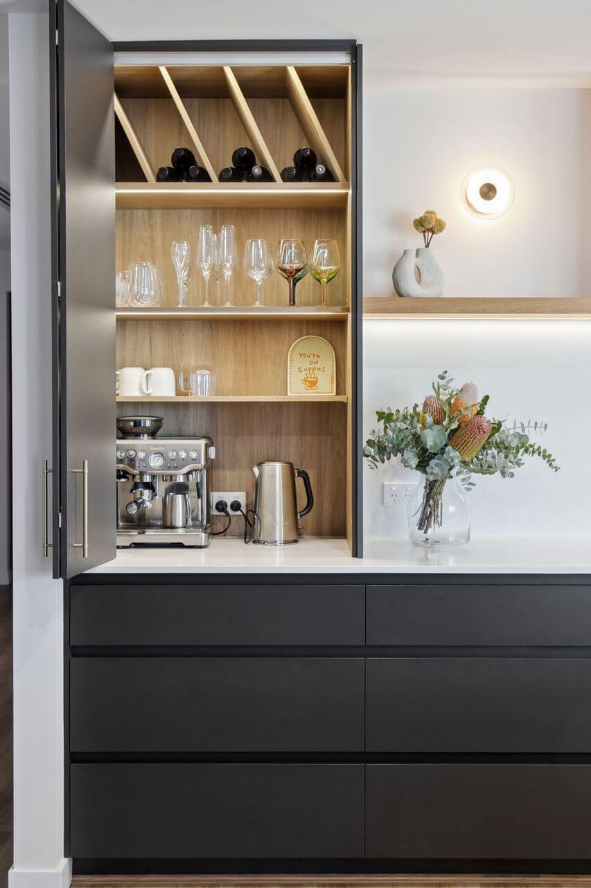 The appliance cabinet is thoughtfully designed for multi-functional use, providing a hidden space for appliances and glassware – keeping the area tidy and out of sight when not in use.