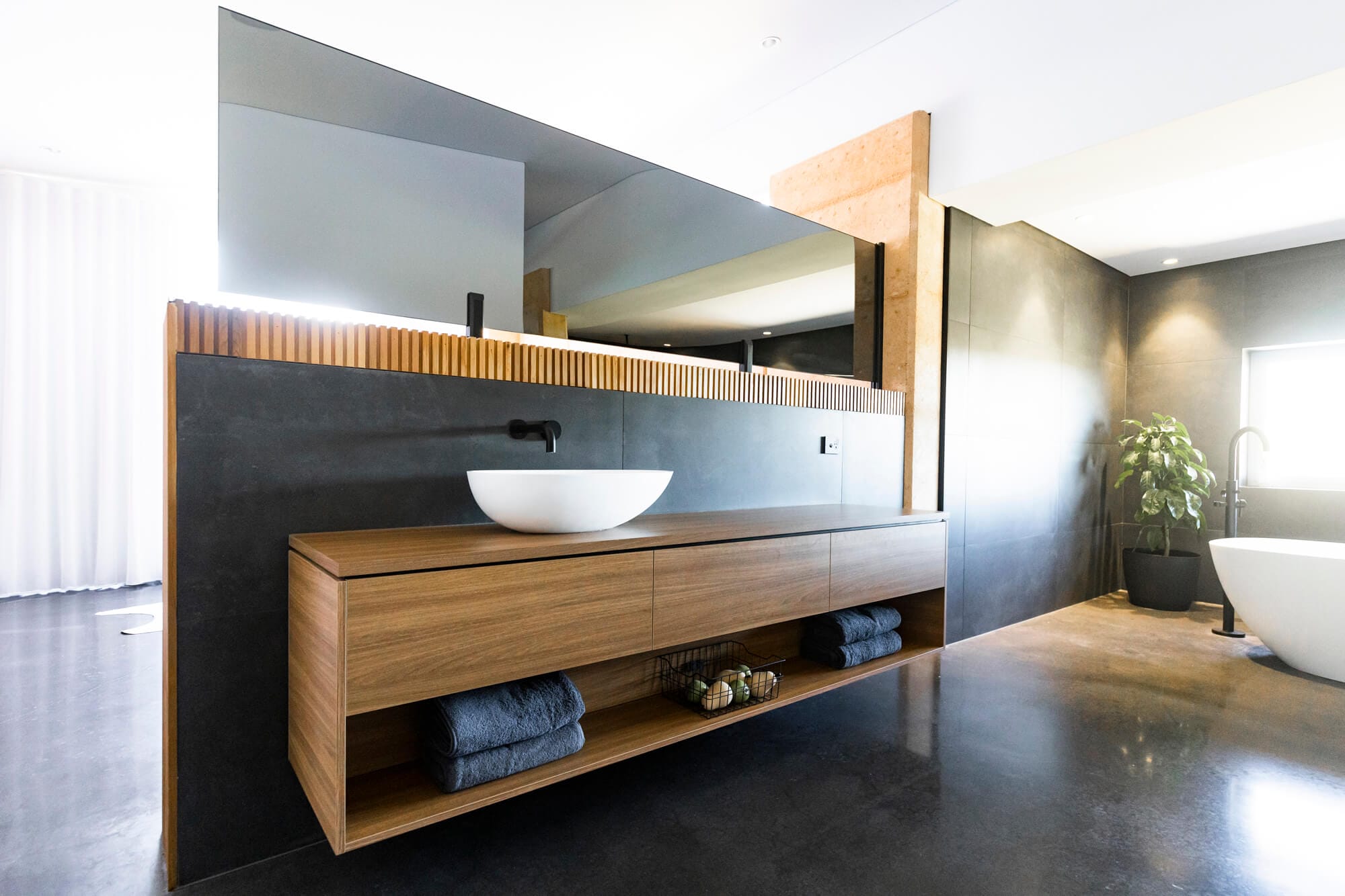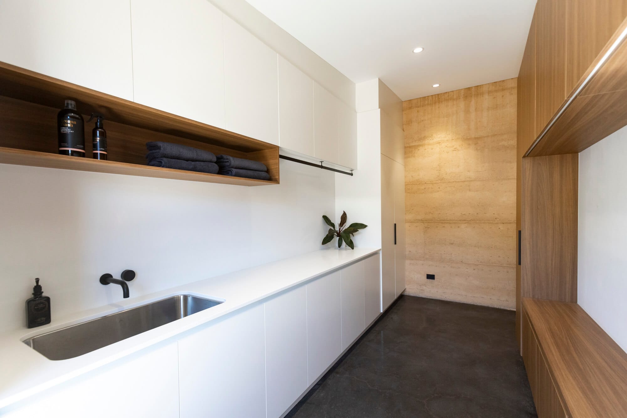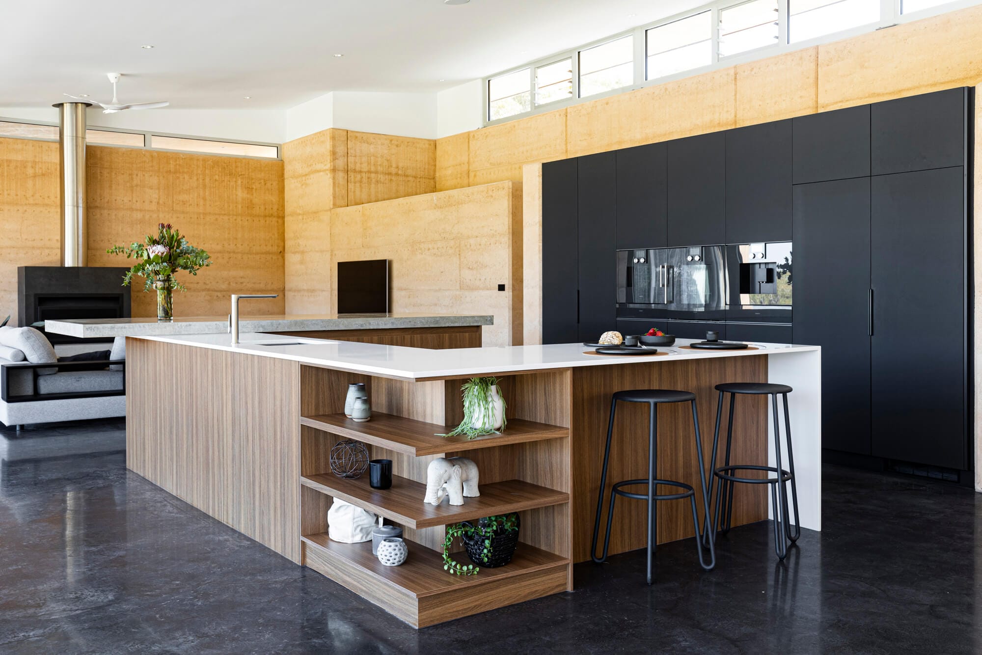 The silky smooth pure matte finish of the VENETTE cabinetry compliments the stunning rammed earth walls in this home. Prime Oak cabinetry on the island enhances the kitchen with natural grain features and the Caesarstone Pure White benchtops create a striking feature against the dark concrete floors. This space lets in a ton of natural light, so the dark flooring and cabinetry are beautiful contrast points in this kitchen.