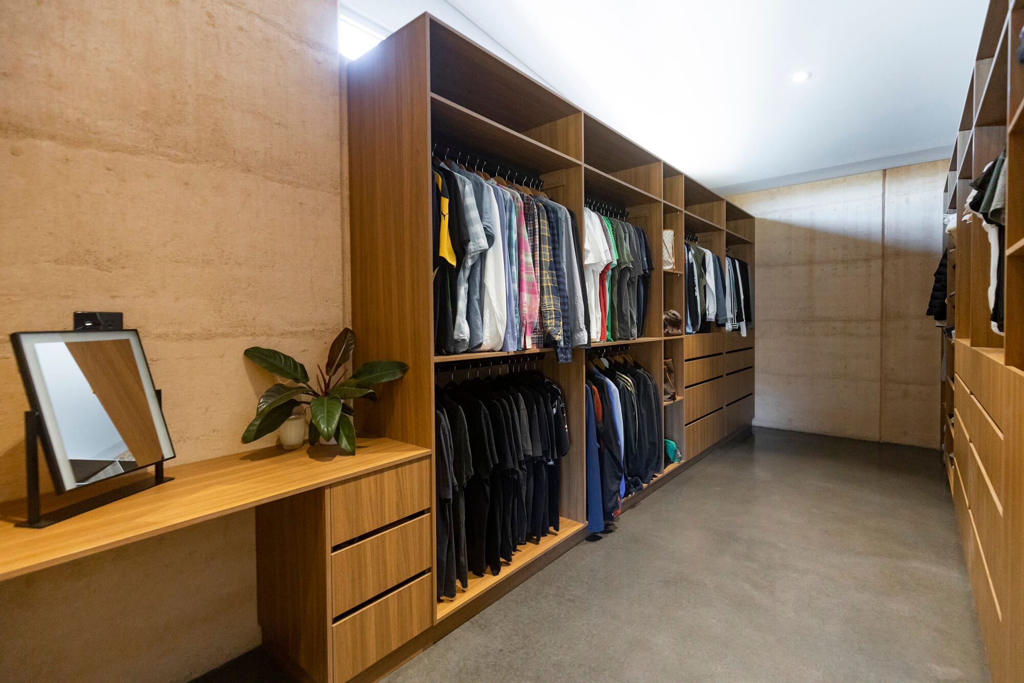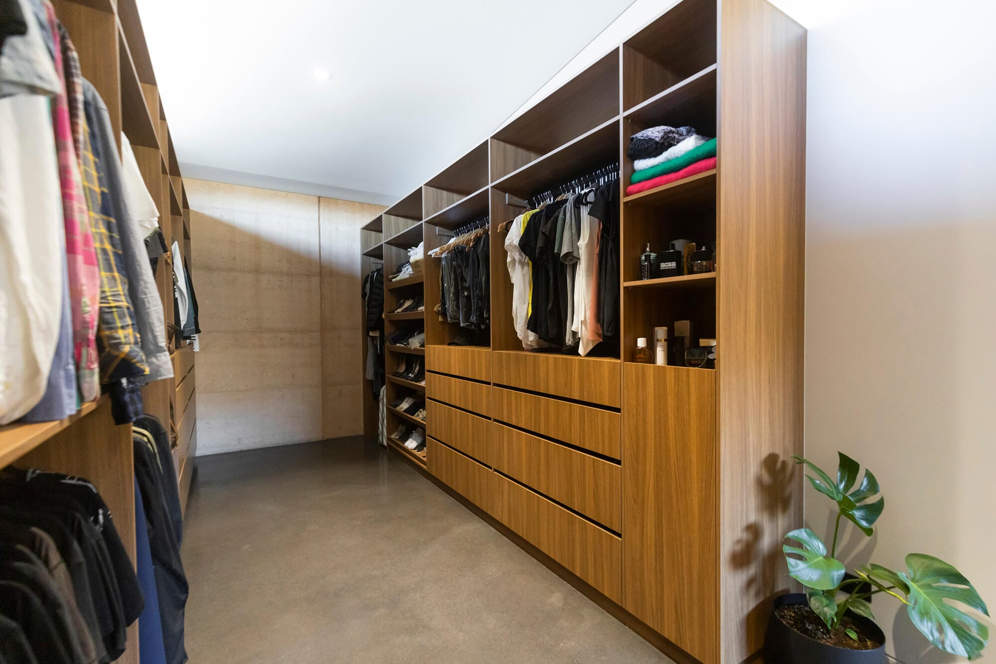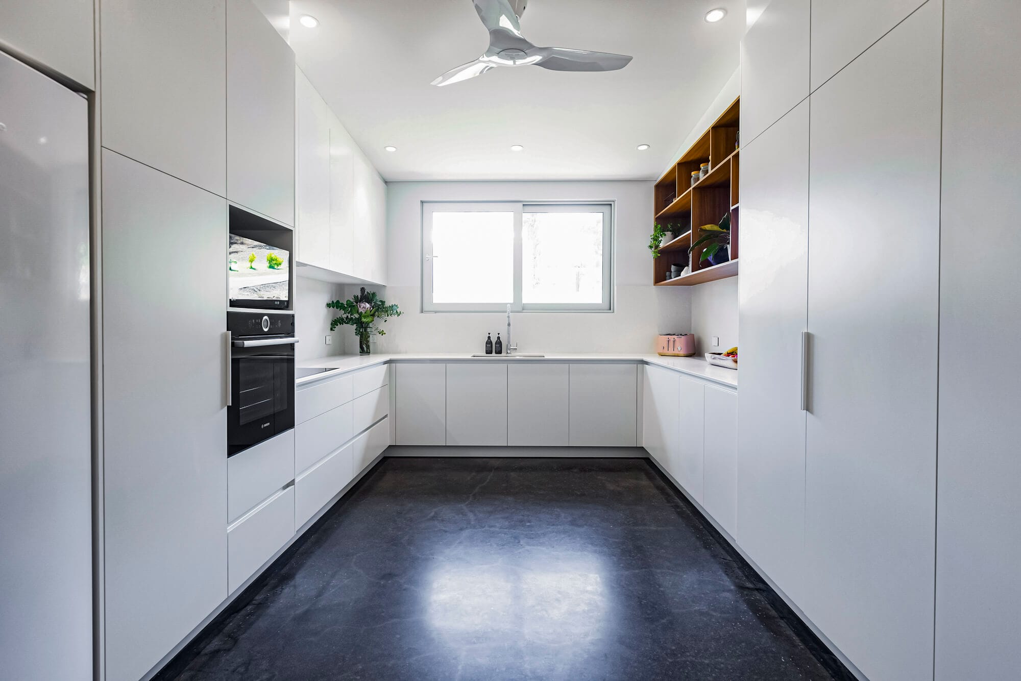 The silky smooth pure matte finish of the VENETTE cabinetry compliments the stunning rammed earth walls in this home. Prime Oak cabinetry on the island enhances the kitchen with natural grain features and the Caesarstone Pure White benchtops create a striking feature against the dark concrete floors. This space lets in a ton of natural light, so the dark flooring and cabinetry are beautiful contrast points in this kitchen.