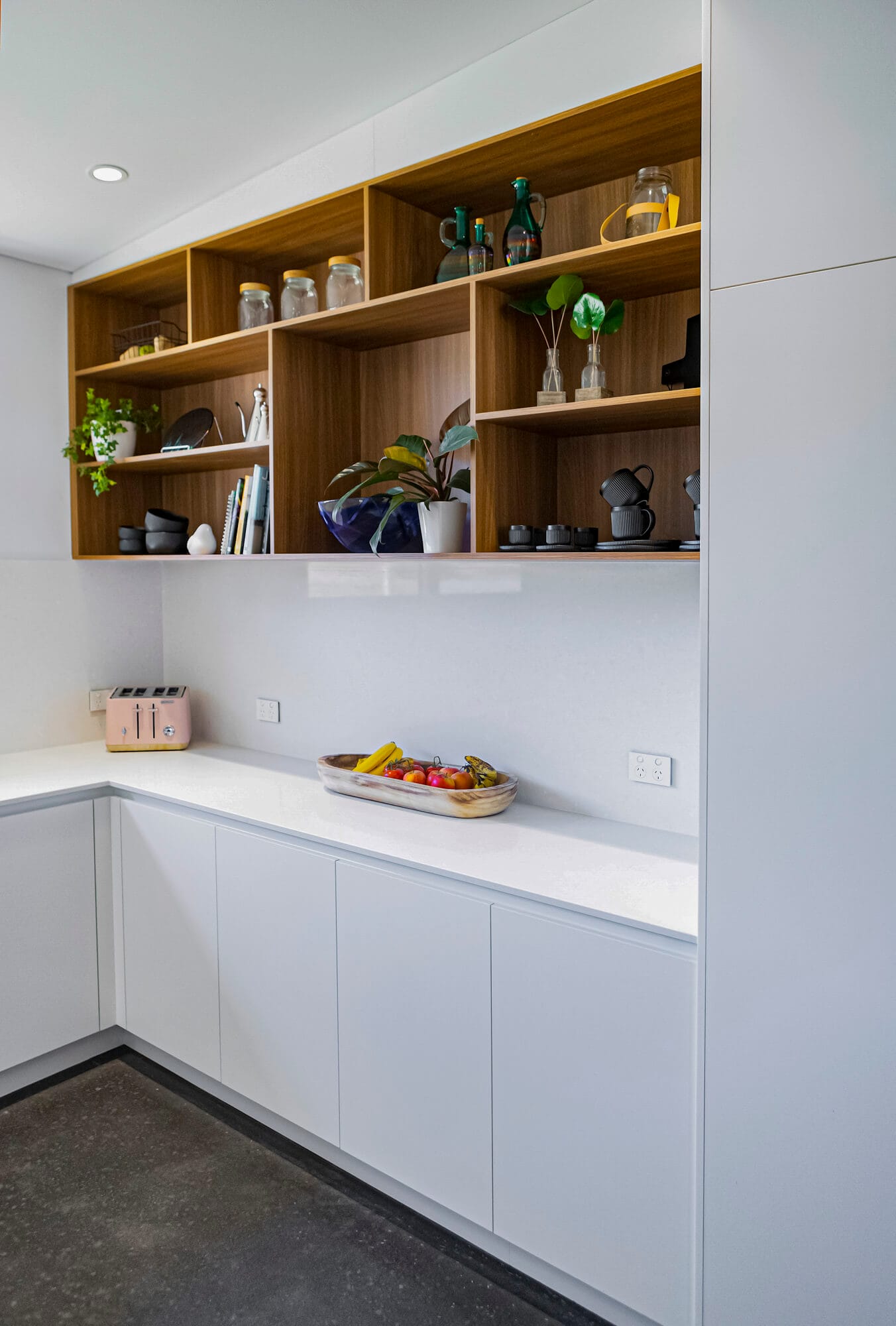 This kitchen also features the luxe element of a butler’s kitchen, located in easy access to the side of the main kitchen. In a stark contrast to the main kitchen – the butler’s kitchen in this home is all white with a large feature shelving area contrasting in Prime Oak. This second kitchen is where the majority of food preparation takes place and as such has a cooktop, a second oven, microwave, fridge, freezer, pantry areas, sink and extra cupboards for ample storage space.