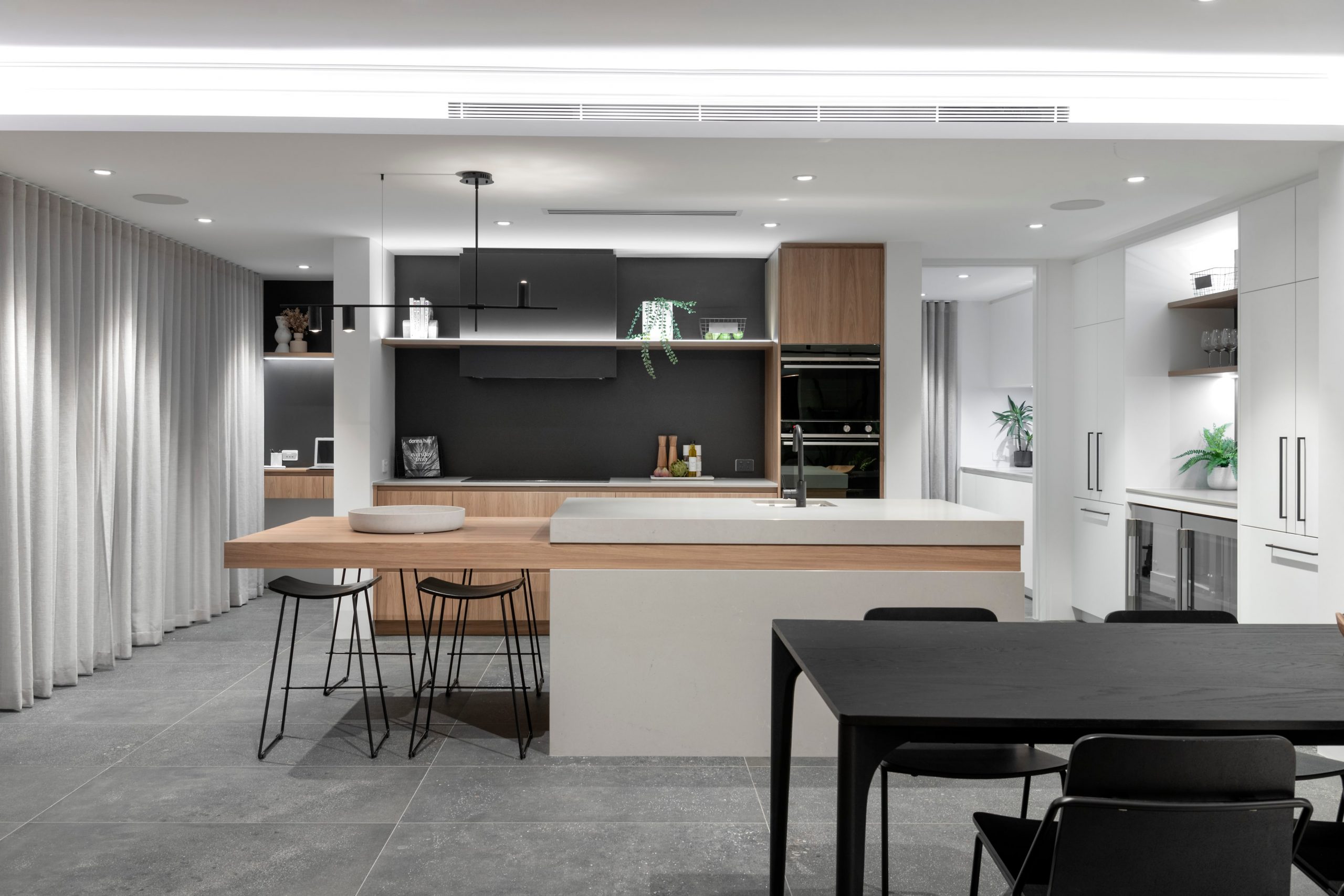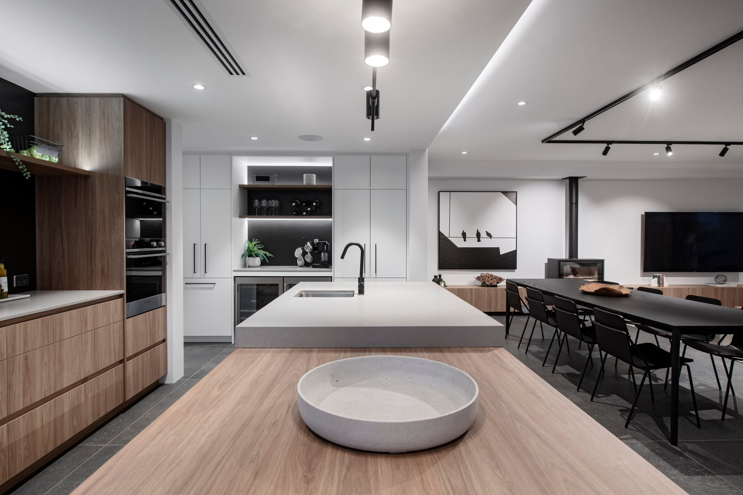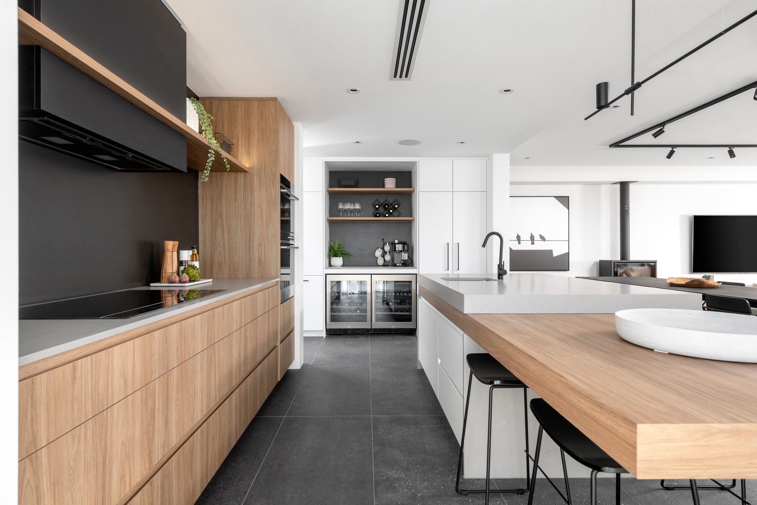 The island showcases a striking two tone design that combines Polytec Prime Oak Woodmatt with Caesarstone Raw Concrete. The Prime Oak split level splices through the stone adding extra visual interest to the cantilever section.