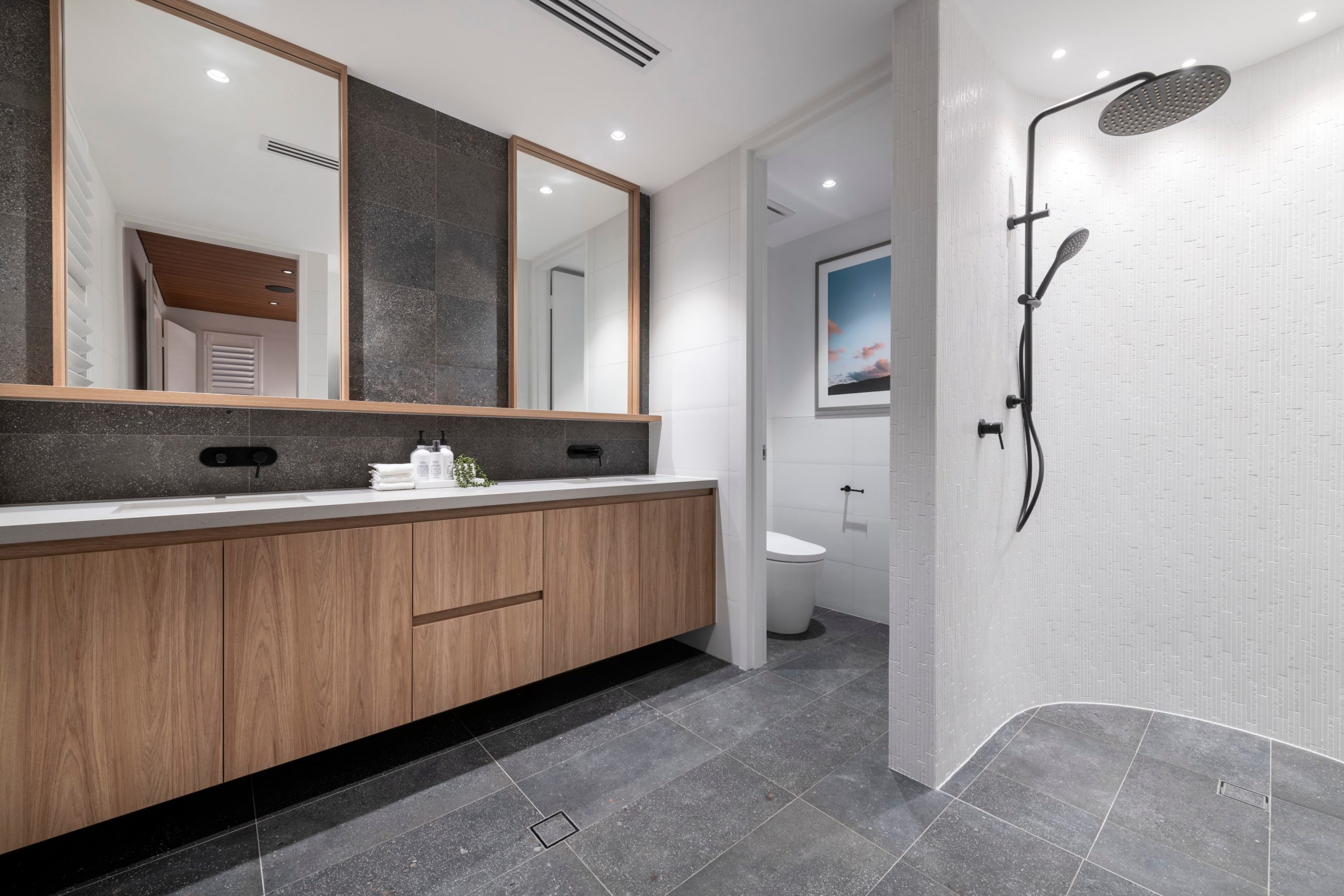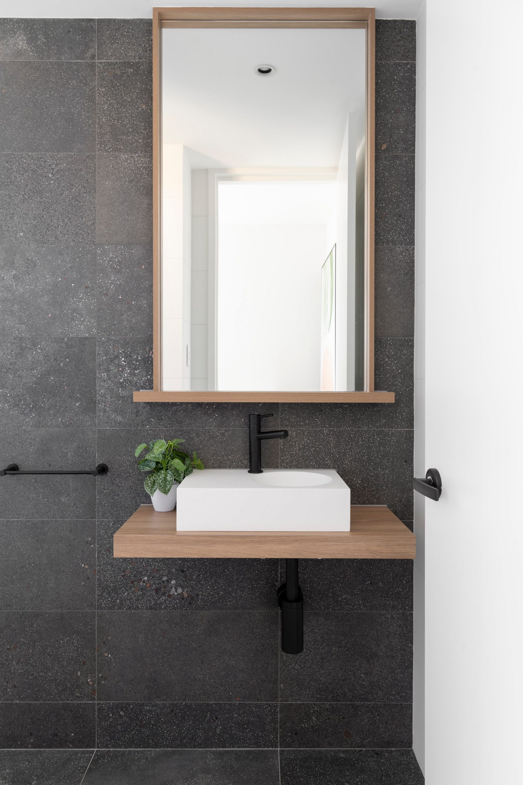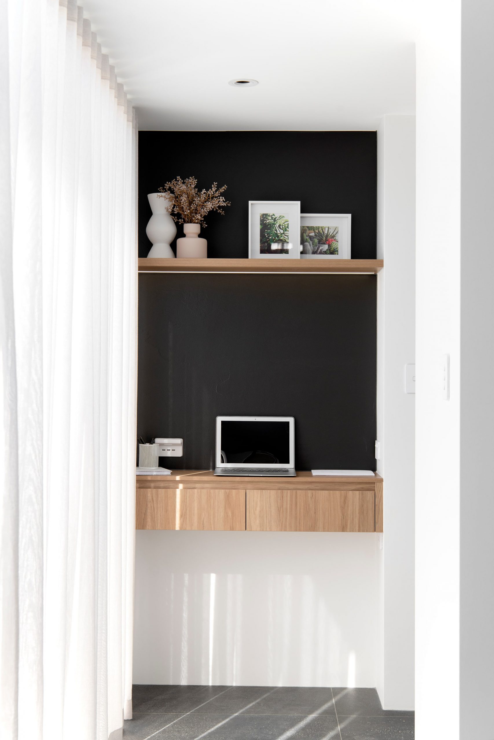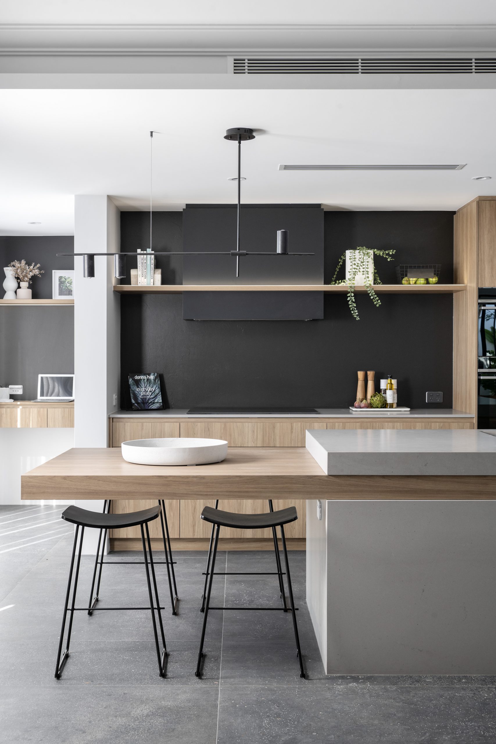 The island showcases a striking two tone design that combines Polytec Prime Oak Woodmatt with Caesarstone Raw Concrete. The Prime Oak split level splices through the stone adding extra visual interest to the cantilever section.