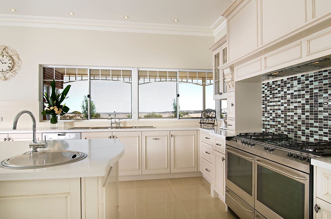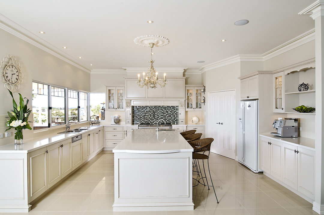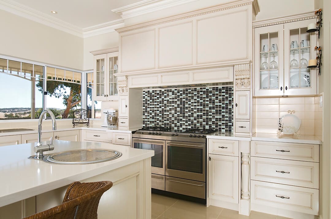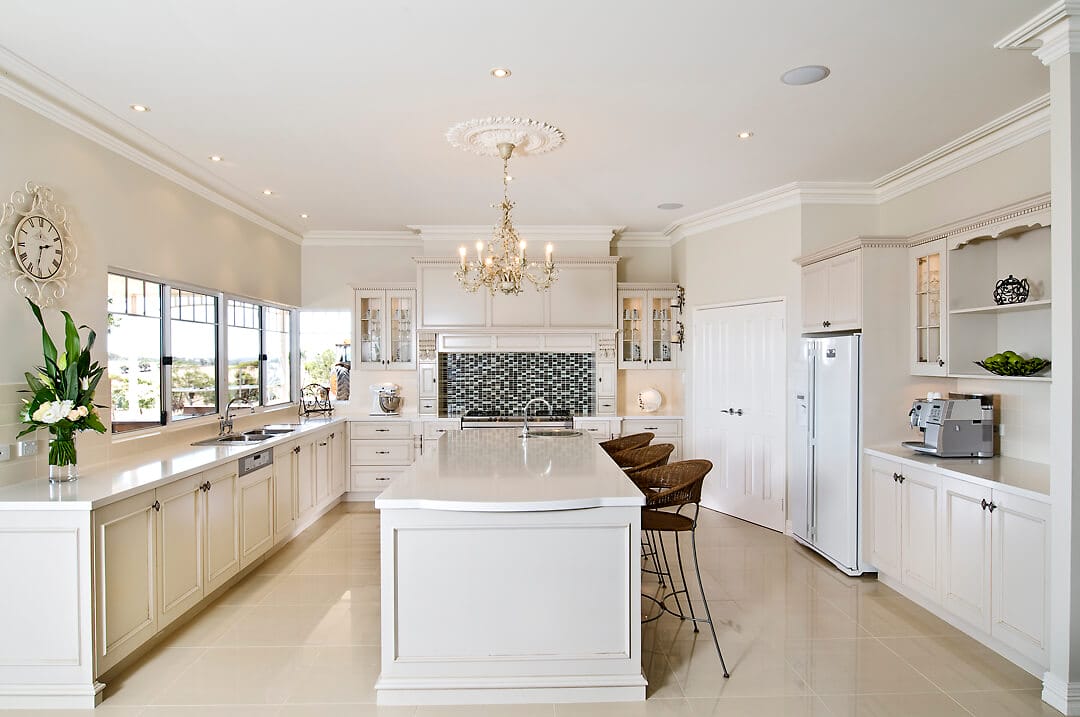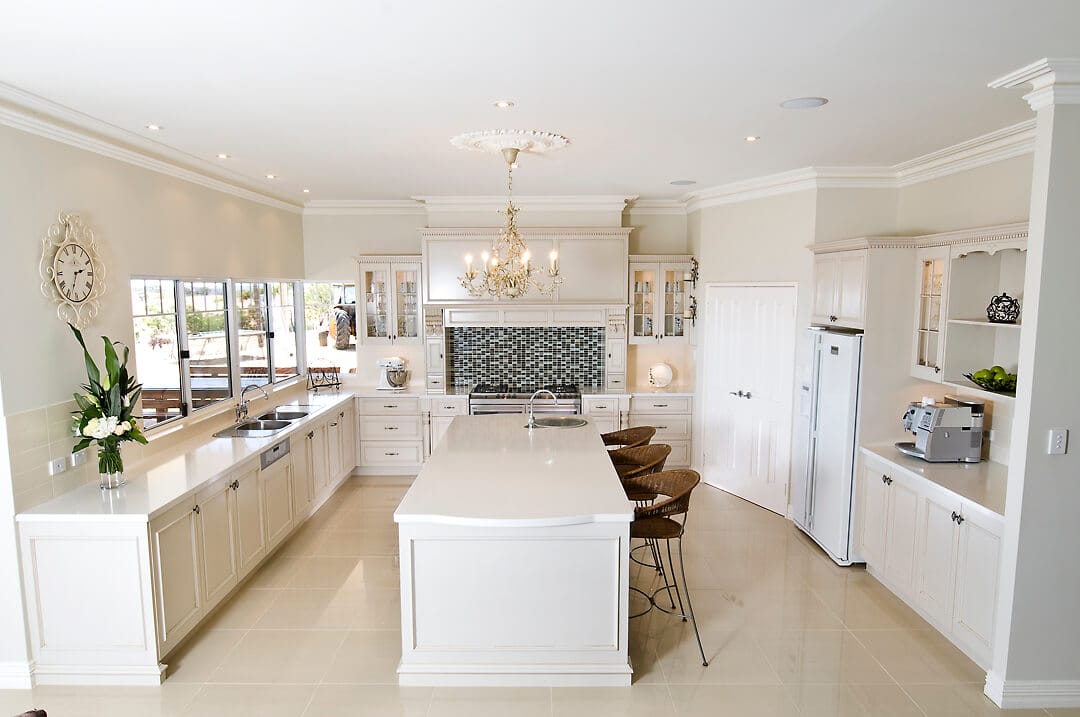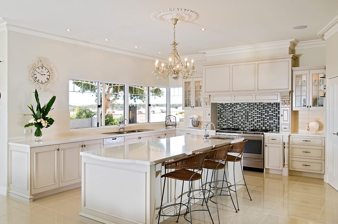 When visiting kitchen showrooms in Perth, examples of traditional kitchens are often featured and this design showcases how traditional kitchens can easily be modified to create a new dimension. A refreshing and light colour palette has been applied to this kitchen to give a sense of brightness and the space for seating and open walk ways makes this highly functional area for cooking and entertaining.