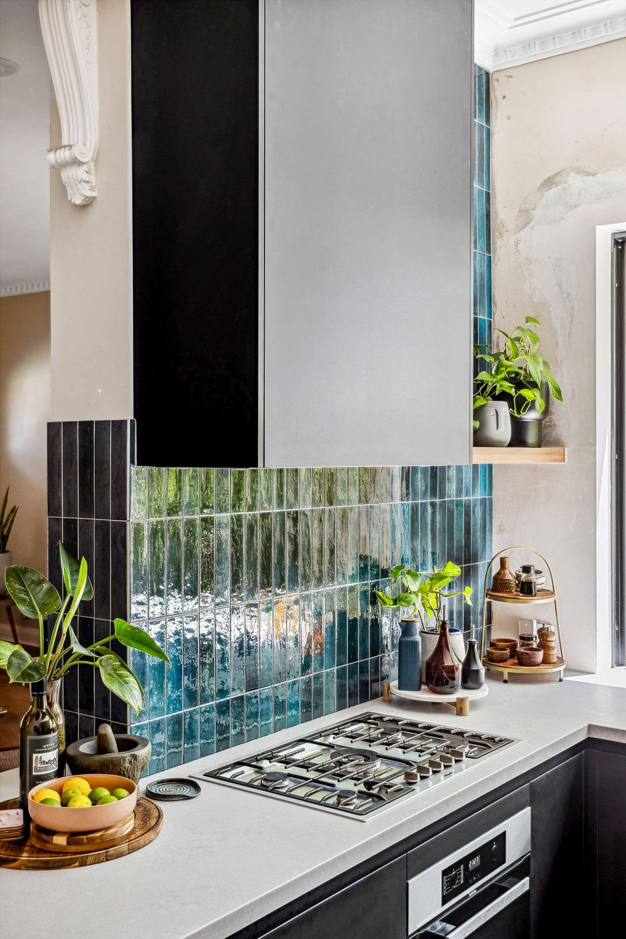 The cooking zone features a custom rangehood design that matches the tall cabinetry in their kitchen with an integrated rangehood and feature floating shelf to one side. This kitchen was designed to work with contrasting glazed tiles in that striking blue.