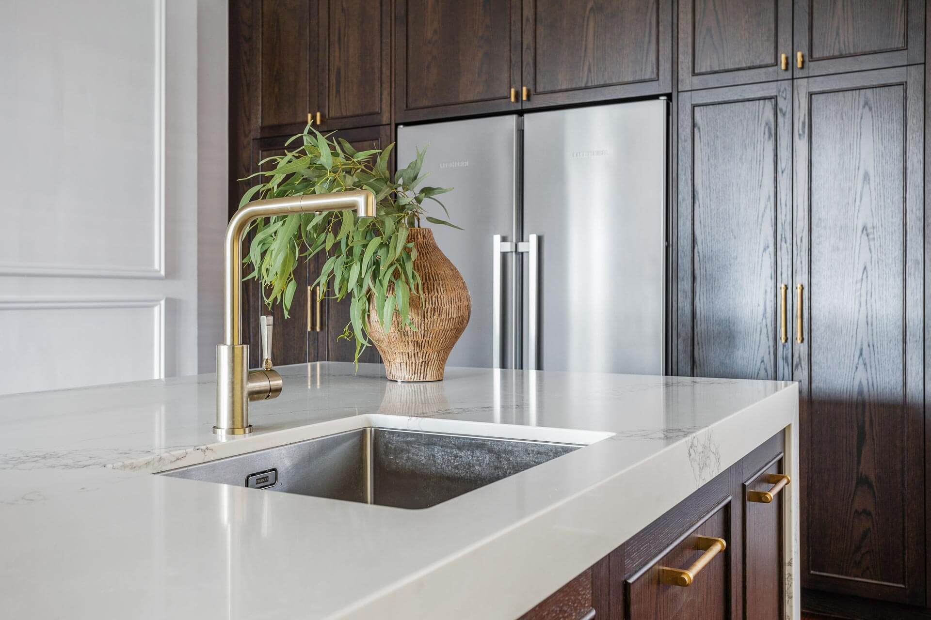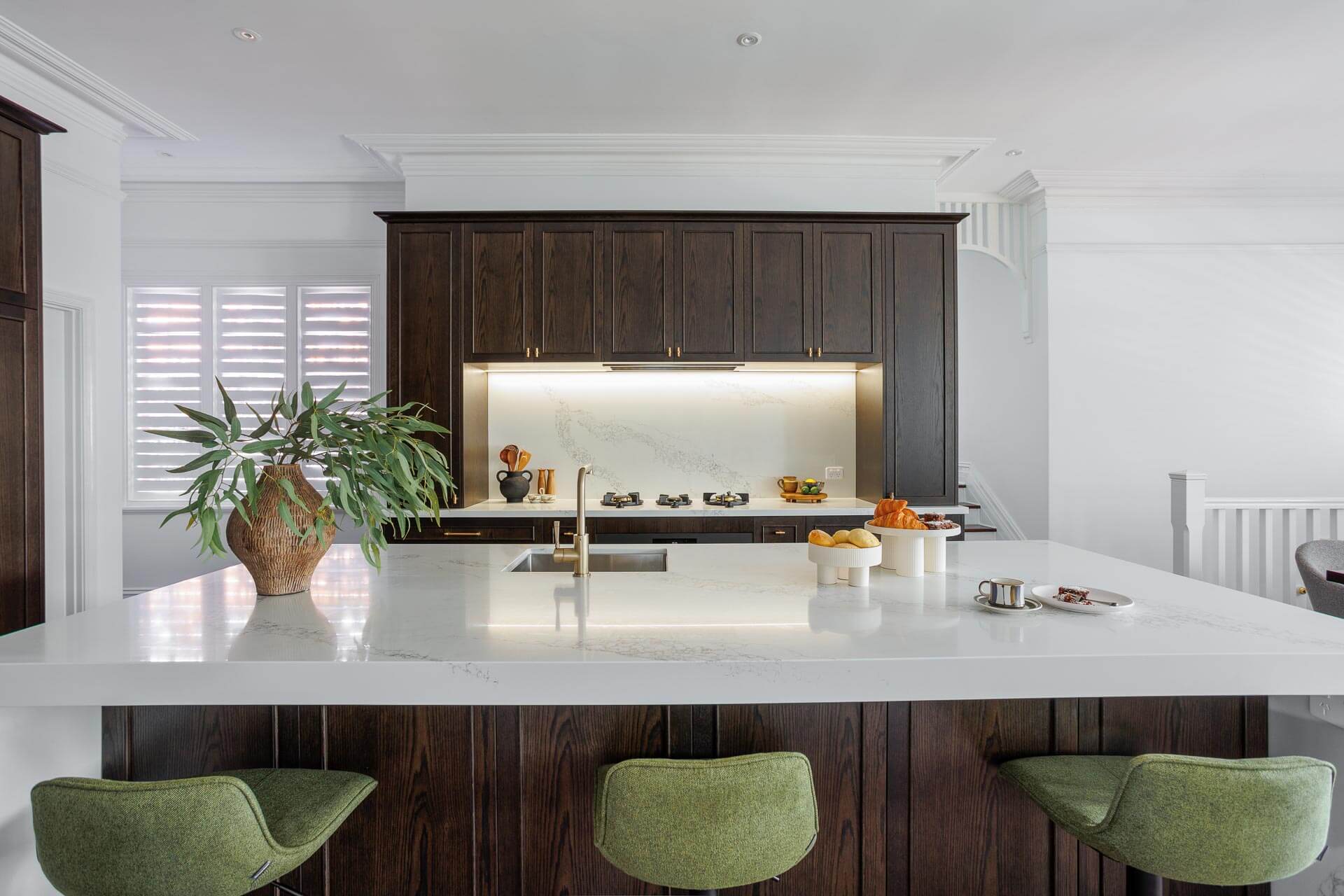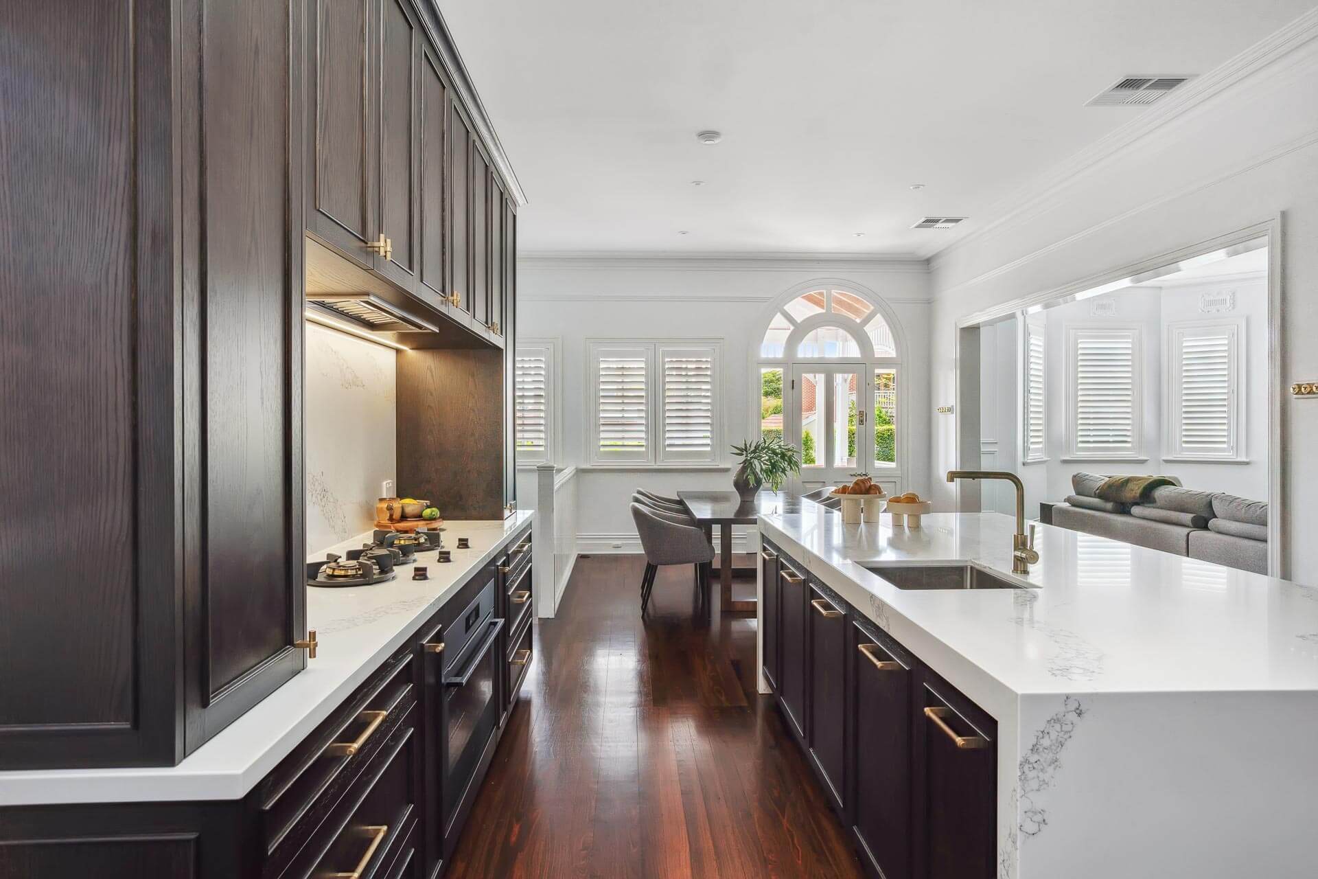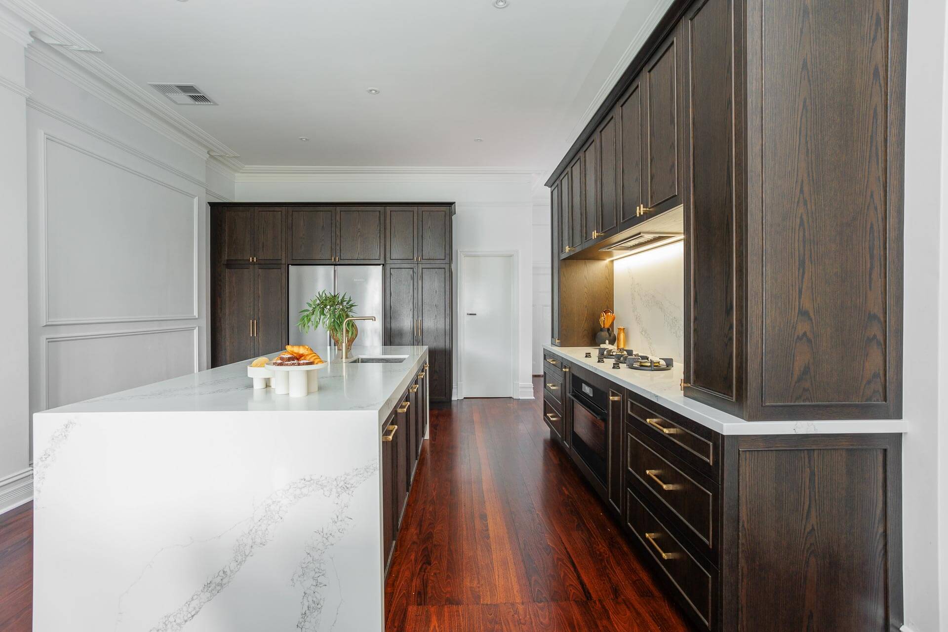 The cabinetry selection for this custom kitchen design is luxury Farmers Handmade Virginia Weathered Oak profile with Black Japan stain. This modern yet classic American style profile features a delicate moulding and a natural recessed centre panel. Farmers Handmade is a luxury Australian cabinetry brand that manufactures its doors and panels by hand, making every kitchen one of a kind.