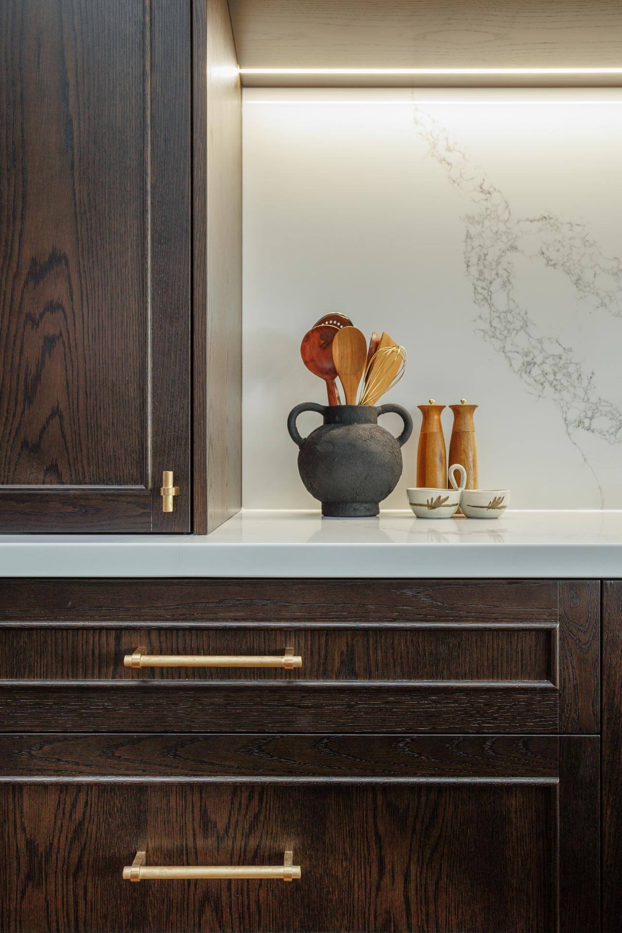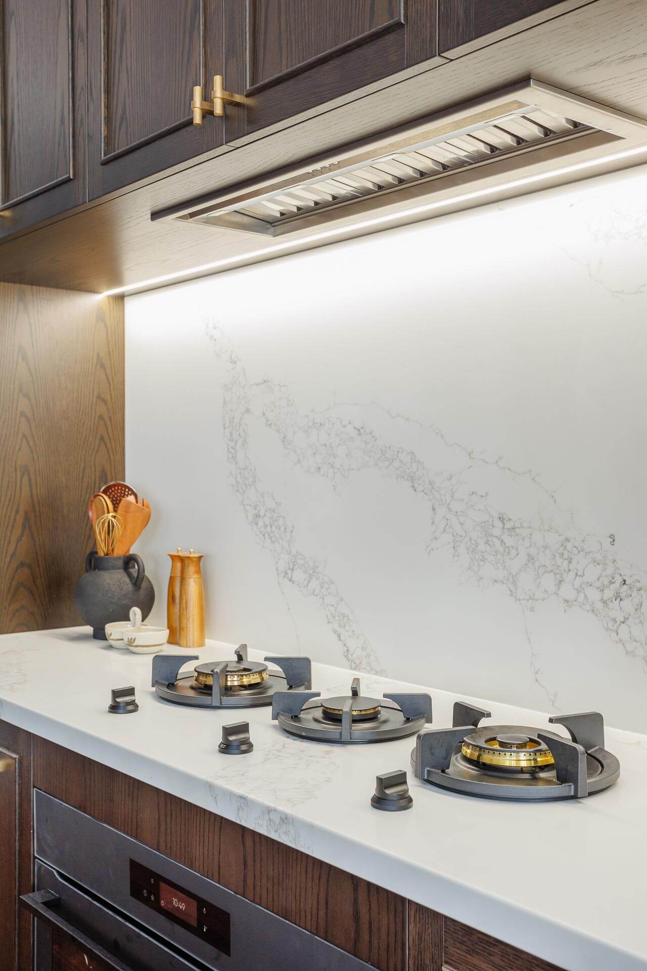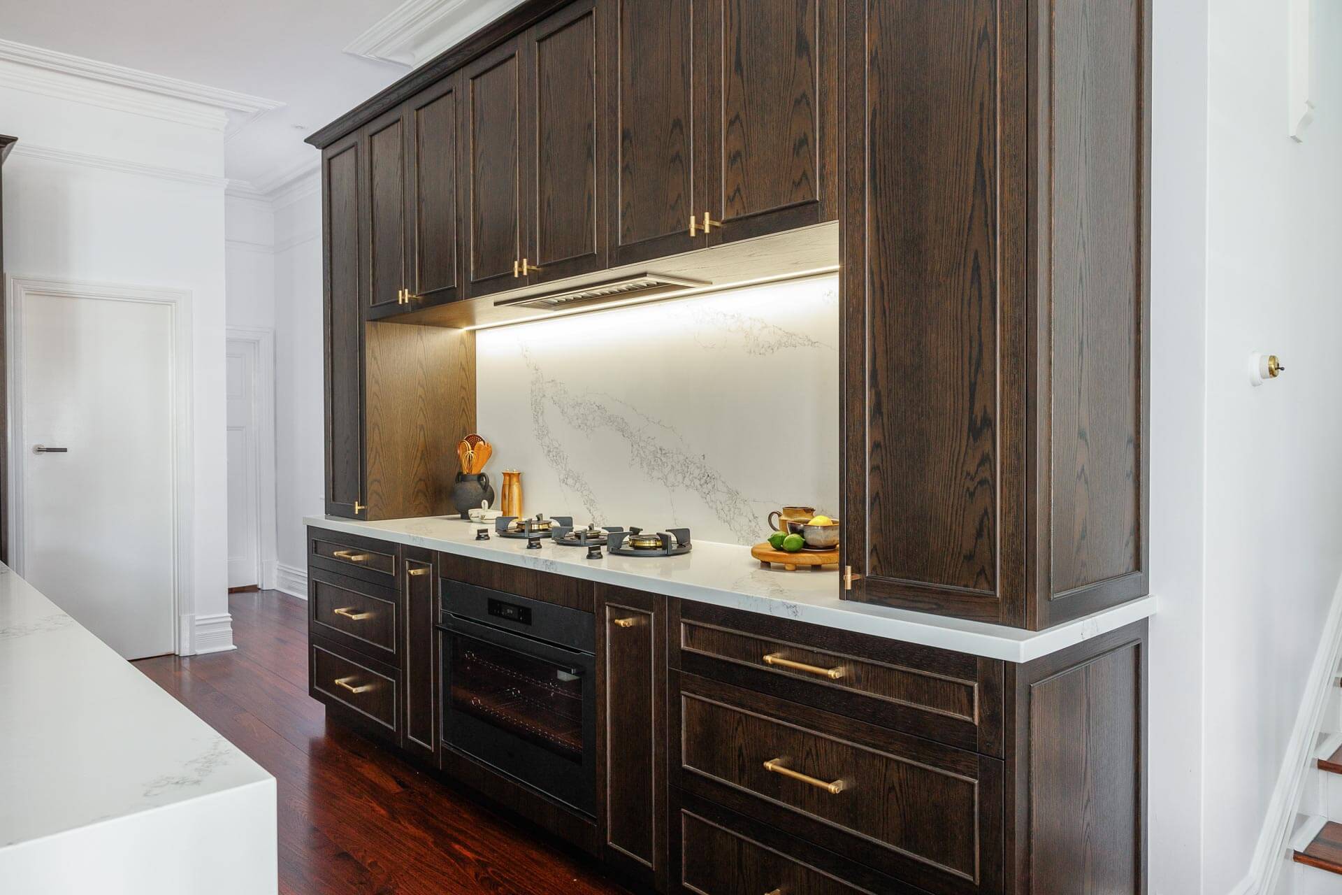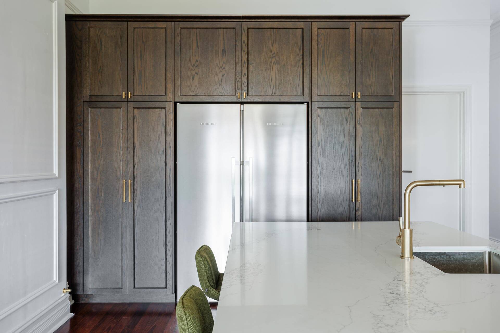 Tall cabinetry design with a Tuscan capping crown trim at the top of the cupboards beautifully showcases the texture and profile of this high-end cabinetry selection. Symmetry plays a significant role in the layout of the cabinetry design, creating striking lines throughout this kitchen design.