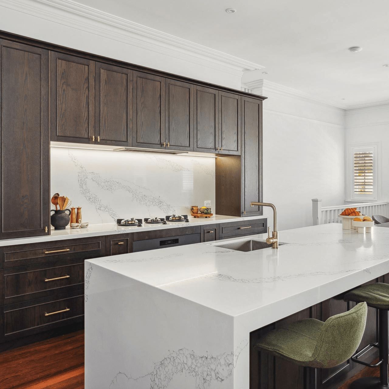 The kitchen island in this design makes a bold statement with 80mm thick Stone Ambassador Calacatta Signature benchtops with double waterfall edges. An elegant design choice allows this stone selection’s broad grey veins to flow up the sides and across the top of this island.
