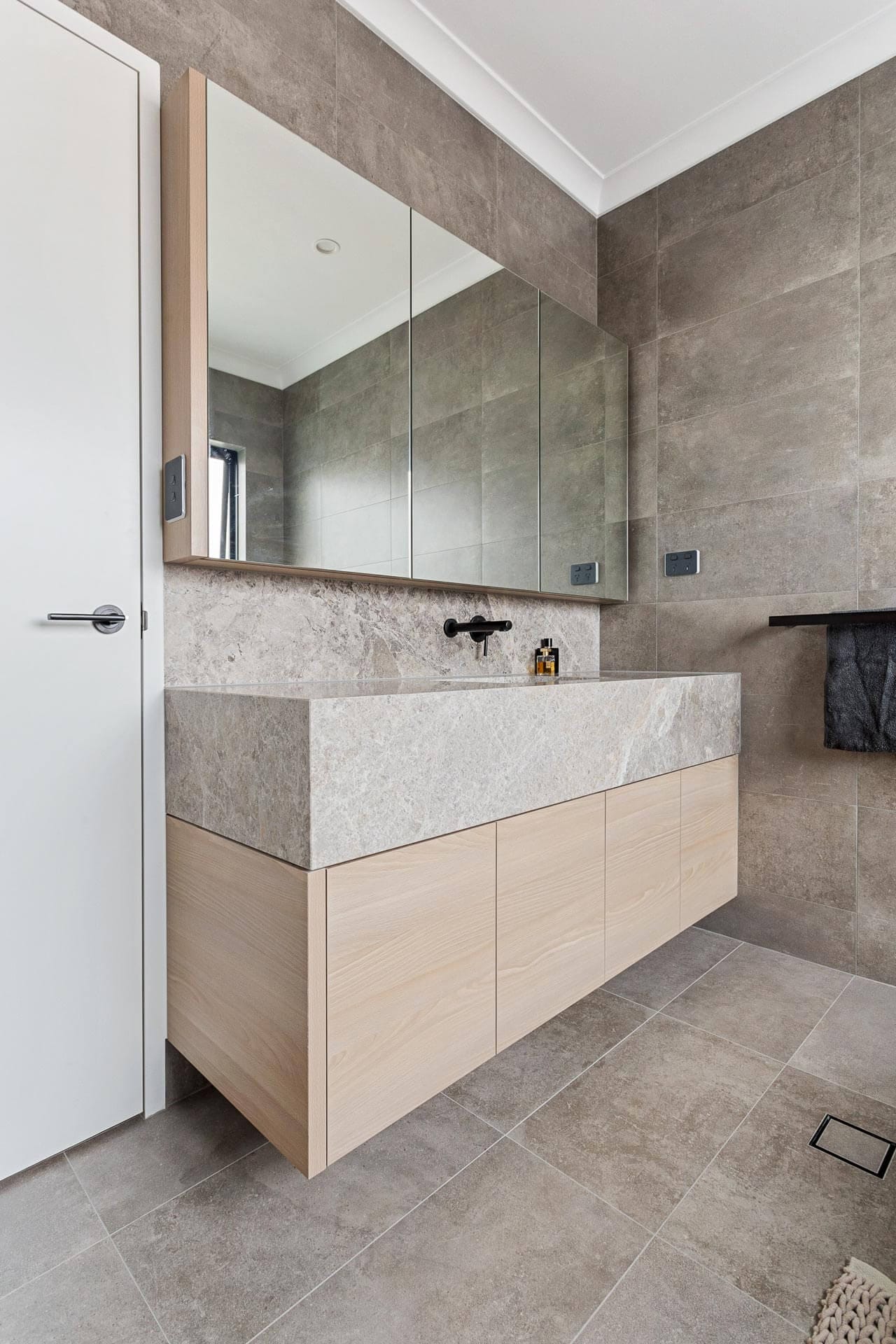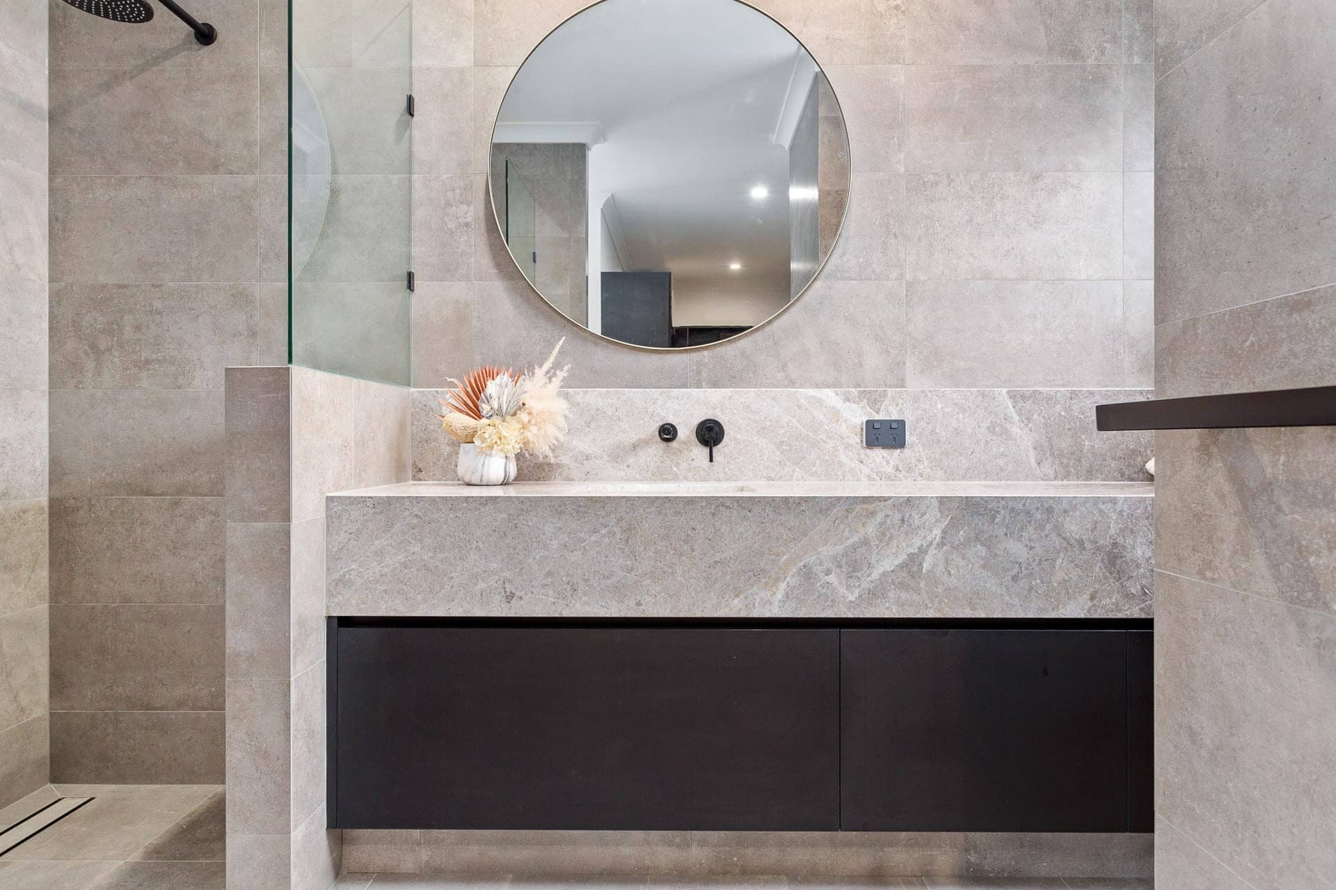 In the bathrooms beautiful marble was selected in which we created striking vanities with thick use of stone and striking stone splashbacks as the feature.
