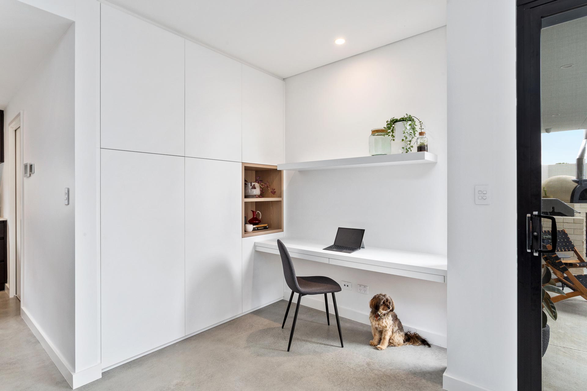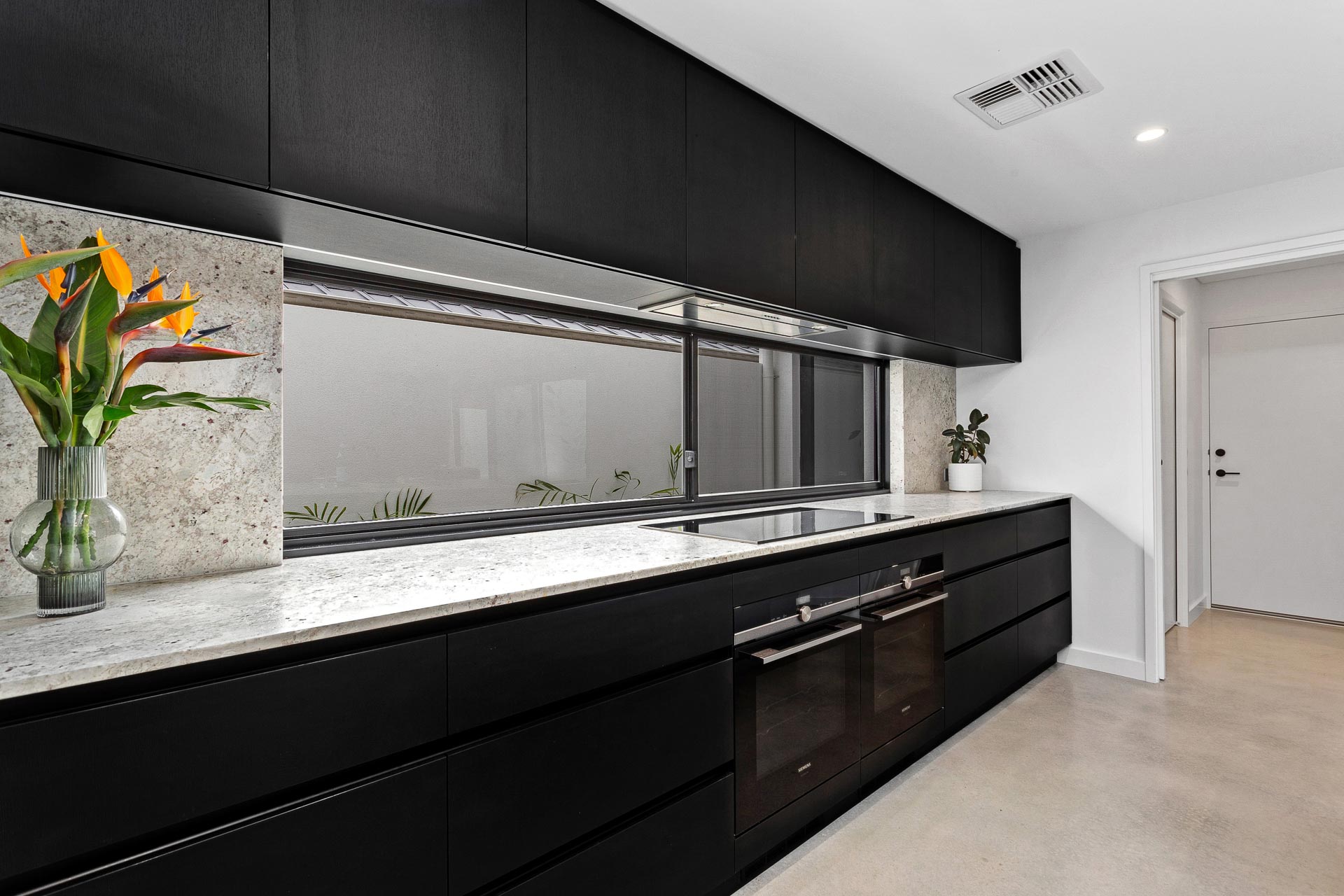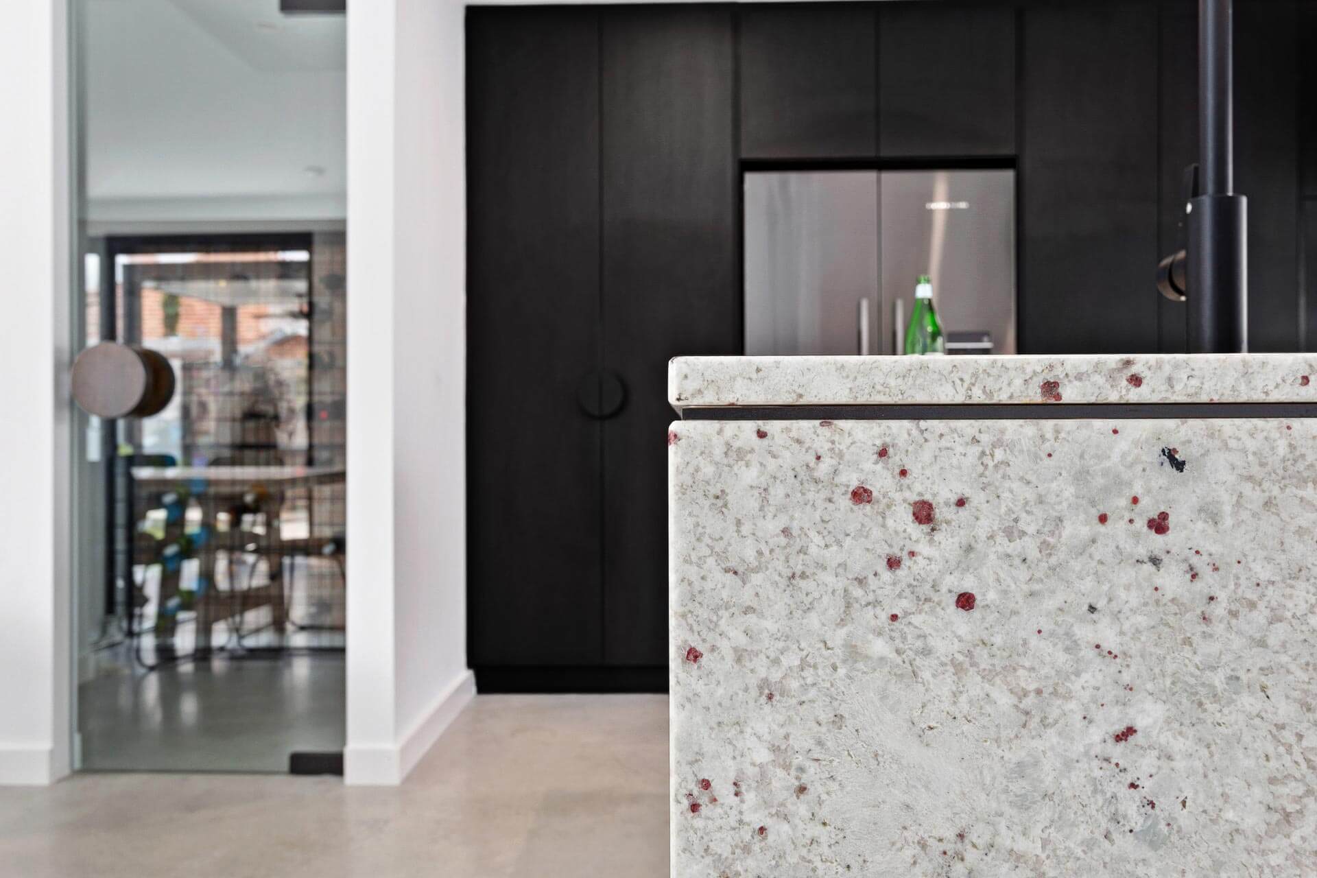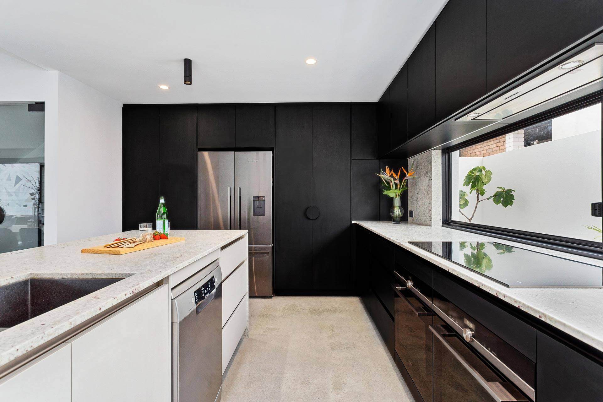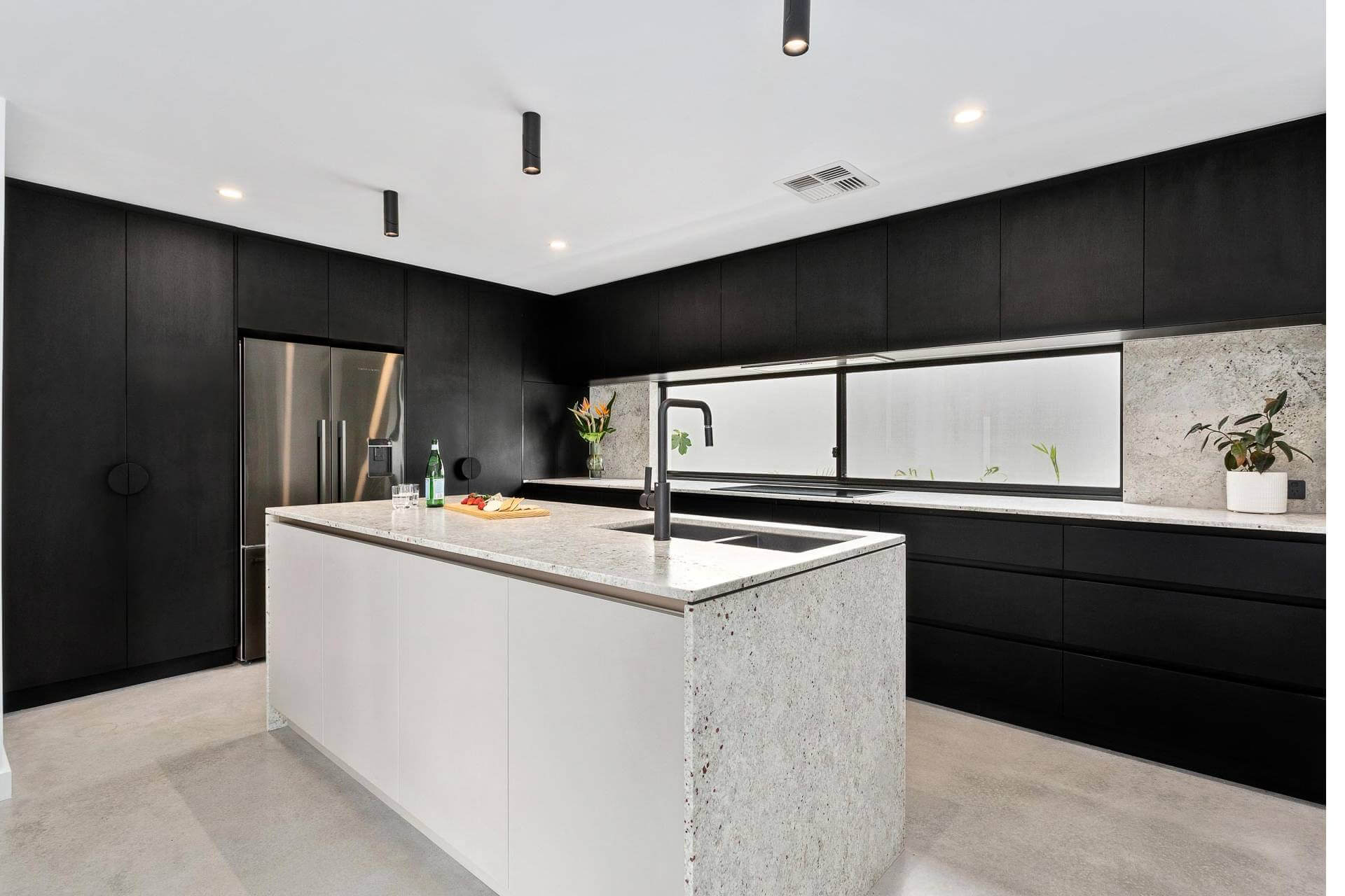 Natural granite stone benchtops and splashback break through this dark design with the island featuring a waterfall edge and negative detail. The island cabinetry uses Polytec Bespoke Legato creating a nice design feature and with a glass splashback window we have allowed for plenty of natural light to compliment the dark colour scheme.