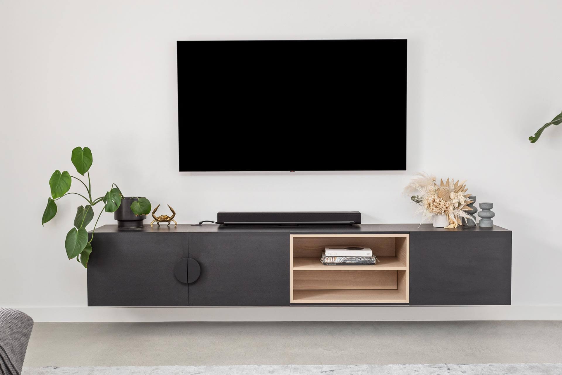 Floor to ceiling cabinetry in Polytec Black Woodmatt creates a sleek and luxurious style for this kitchen. Designed with black finger rails on the drawers and stunning matte black round handles as a subtle yet striking design detail.