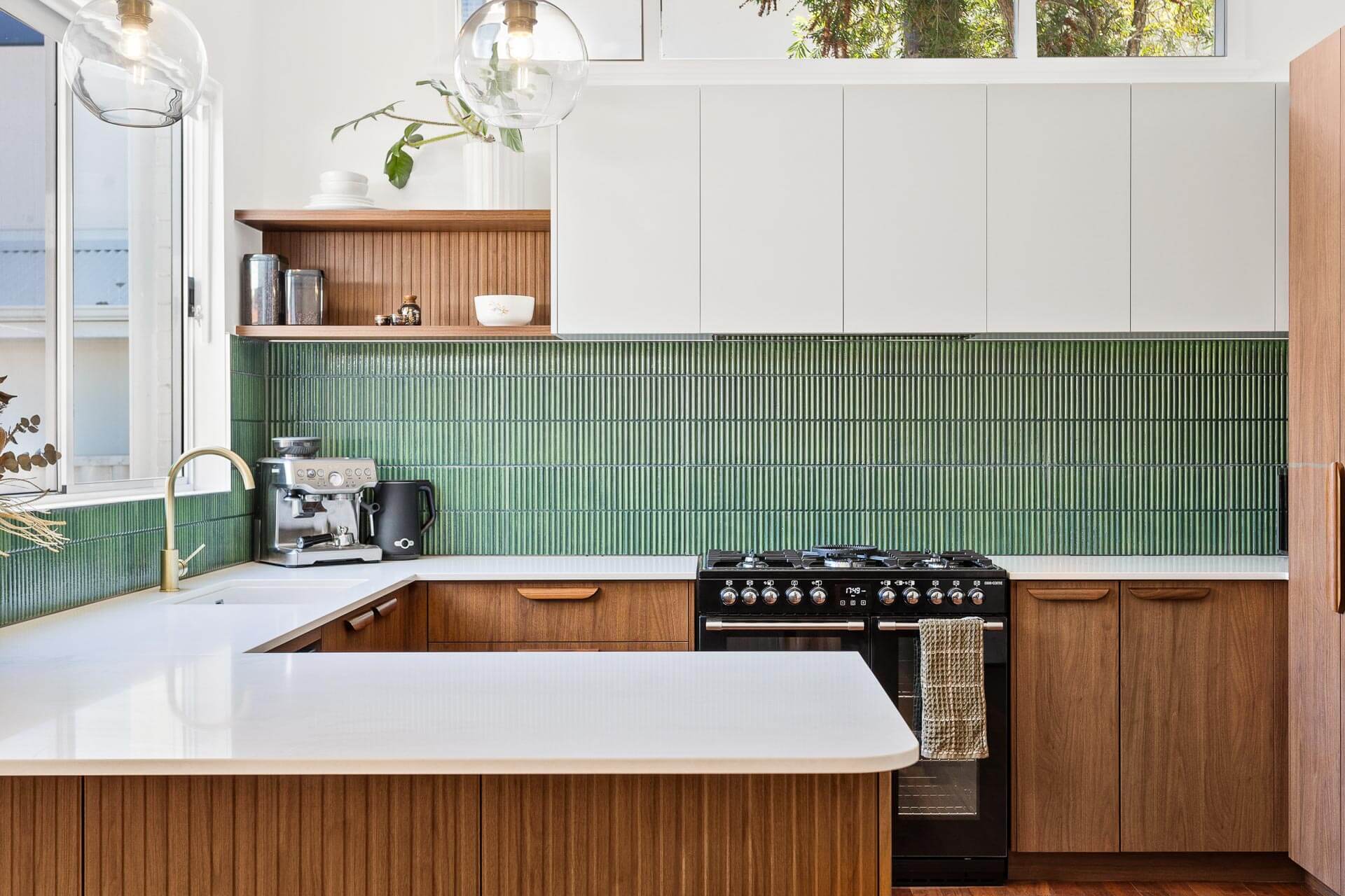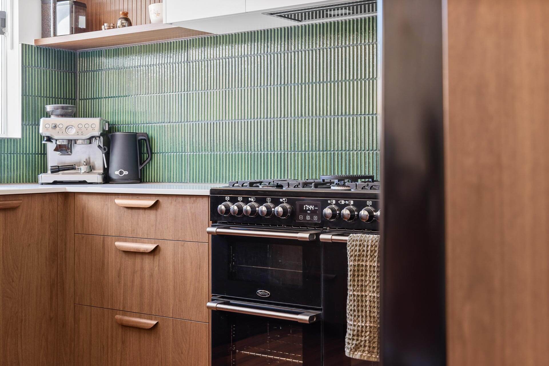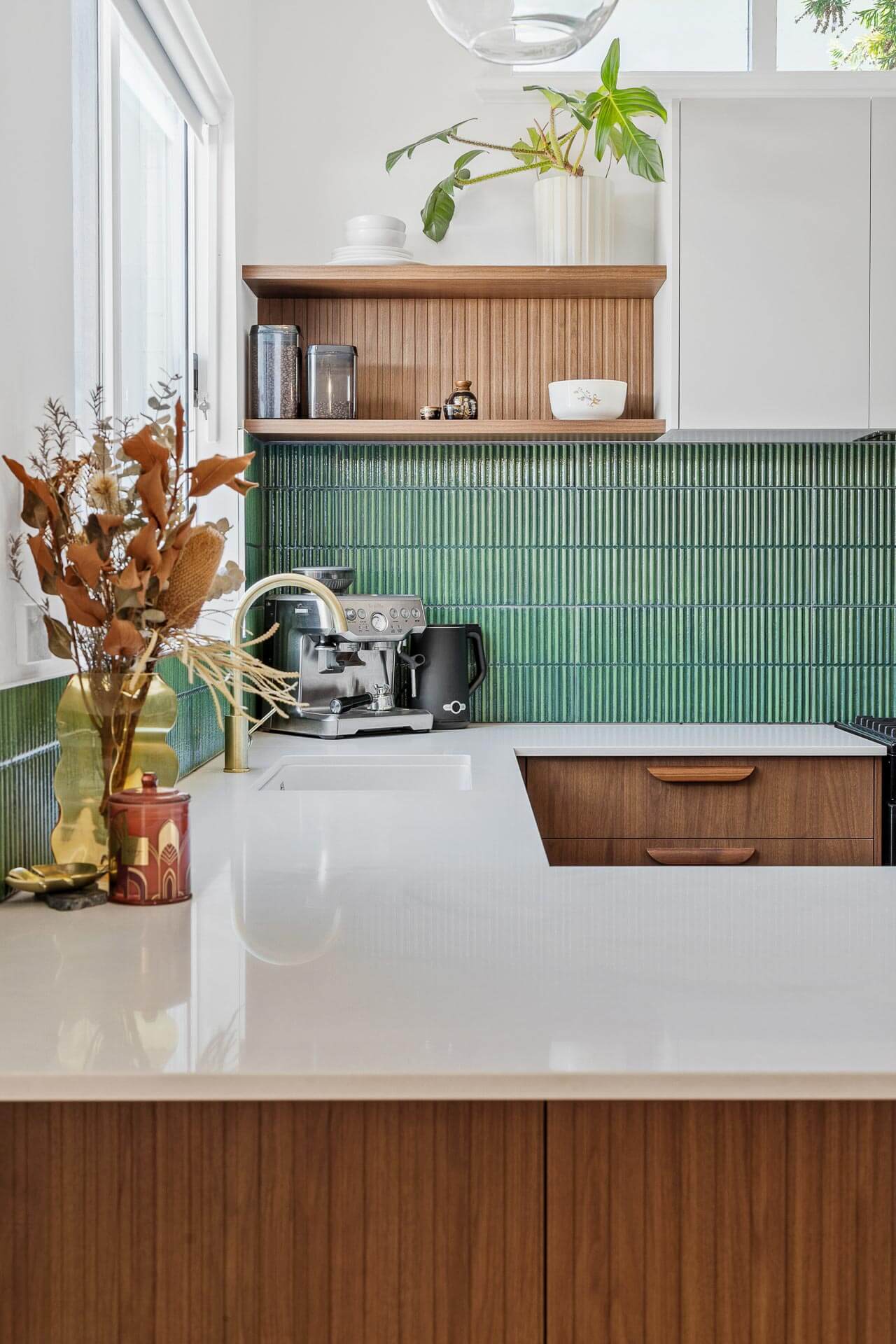 Retro style wooden handles were selected to tie in with the mid-century aesthetic.The elegant jewel-toned green kitkat tiles add a brilliant pop of colour. The walnut colours throughout this design coordinate beautifully with the home’s existing Jarrah hardwood floors.