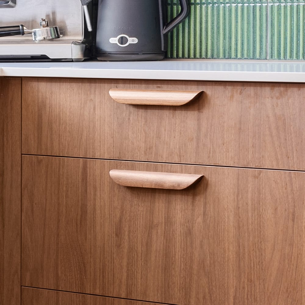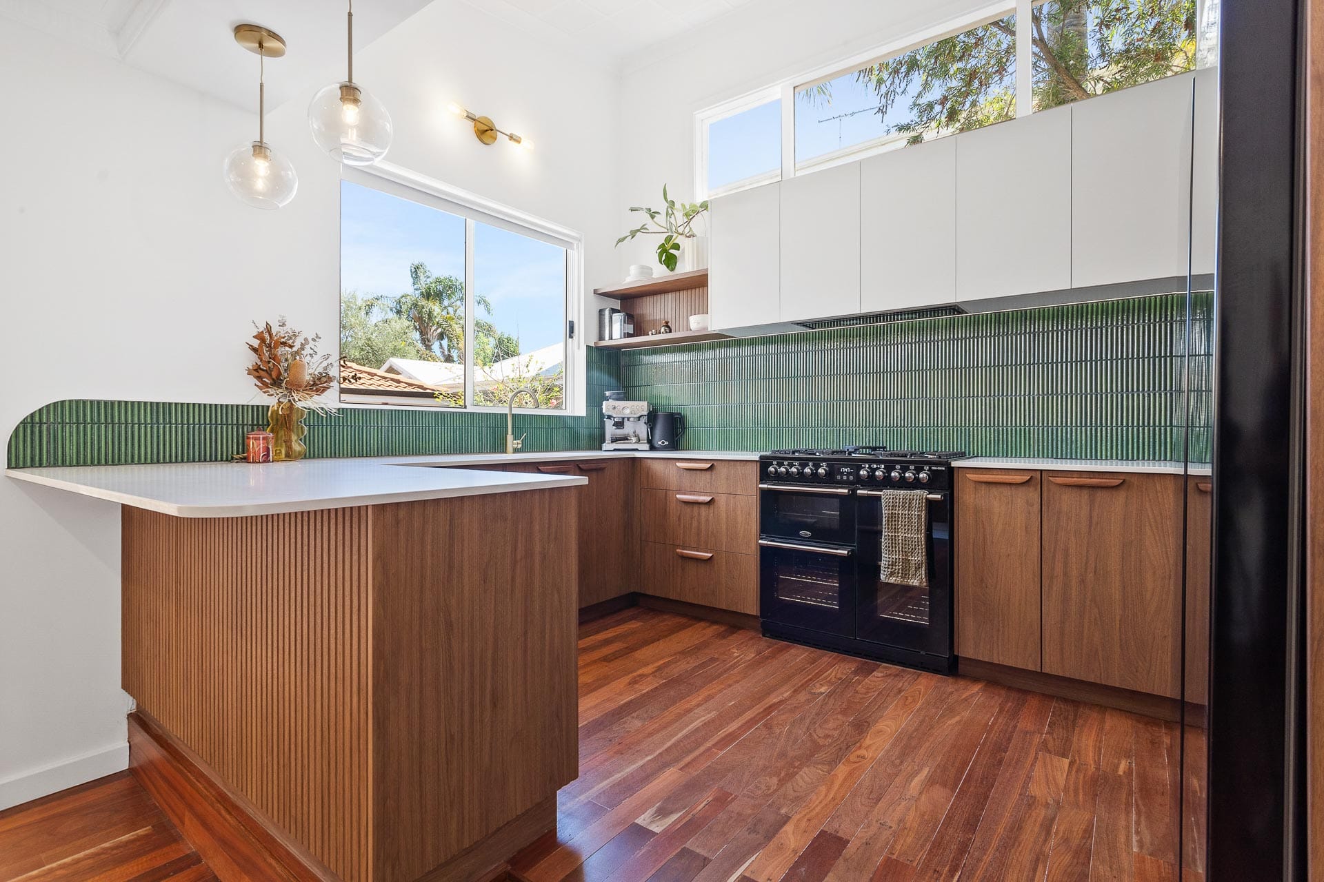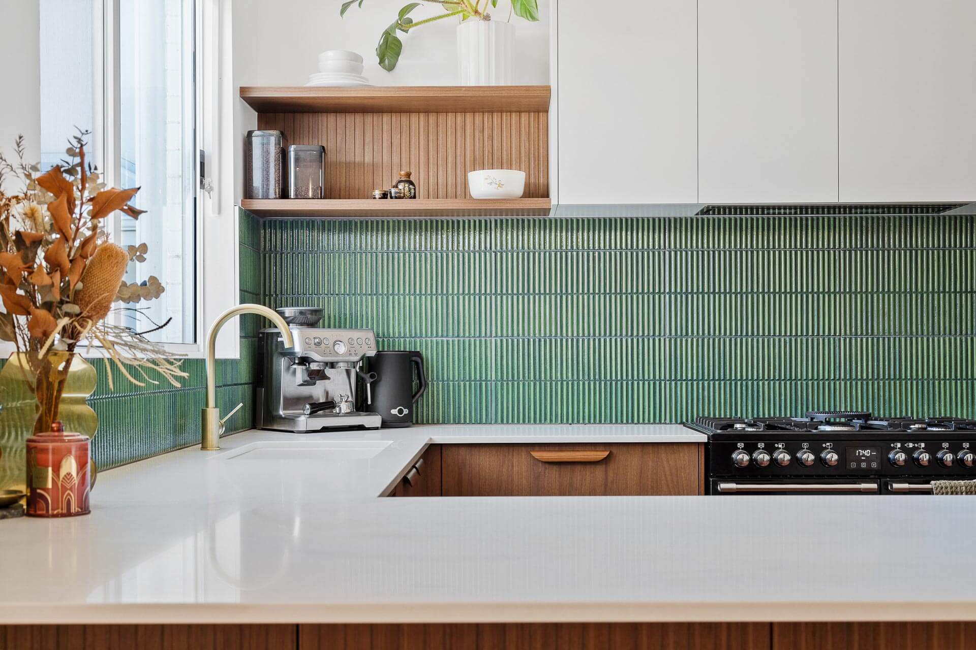 Retro style wooden handles were selected to tie in with the mid-century aesthetic.The elegant jewel-toned green kitkat tiles add a brilliant pop of colour. The walnut colours throughout this design coordinate beautifully with the home’s existing Jarrah hardwood floors.