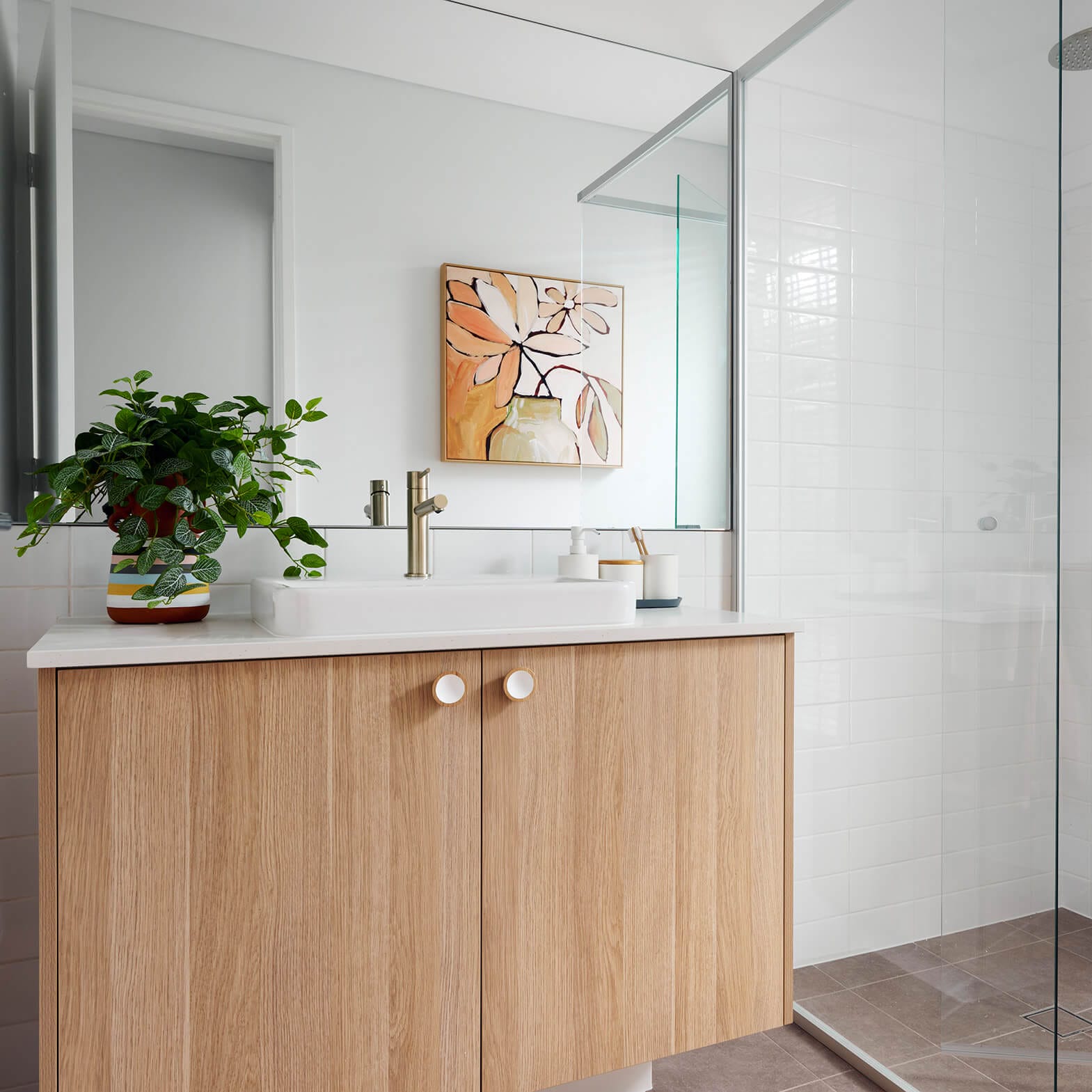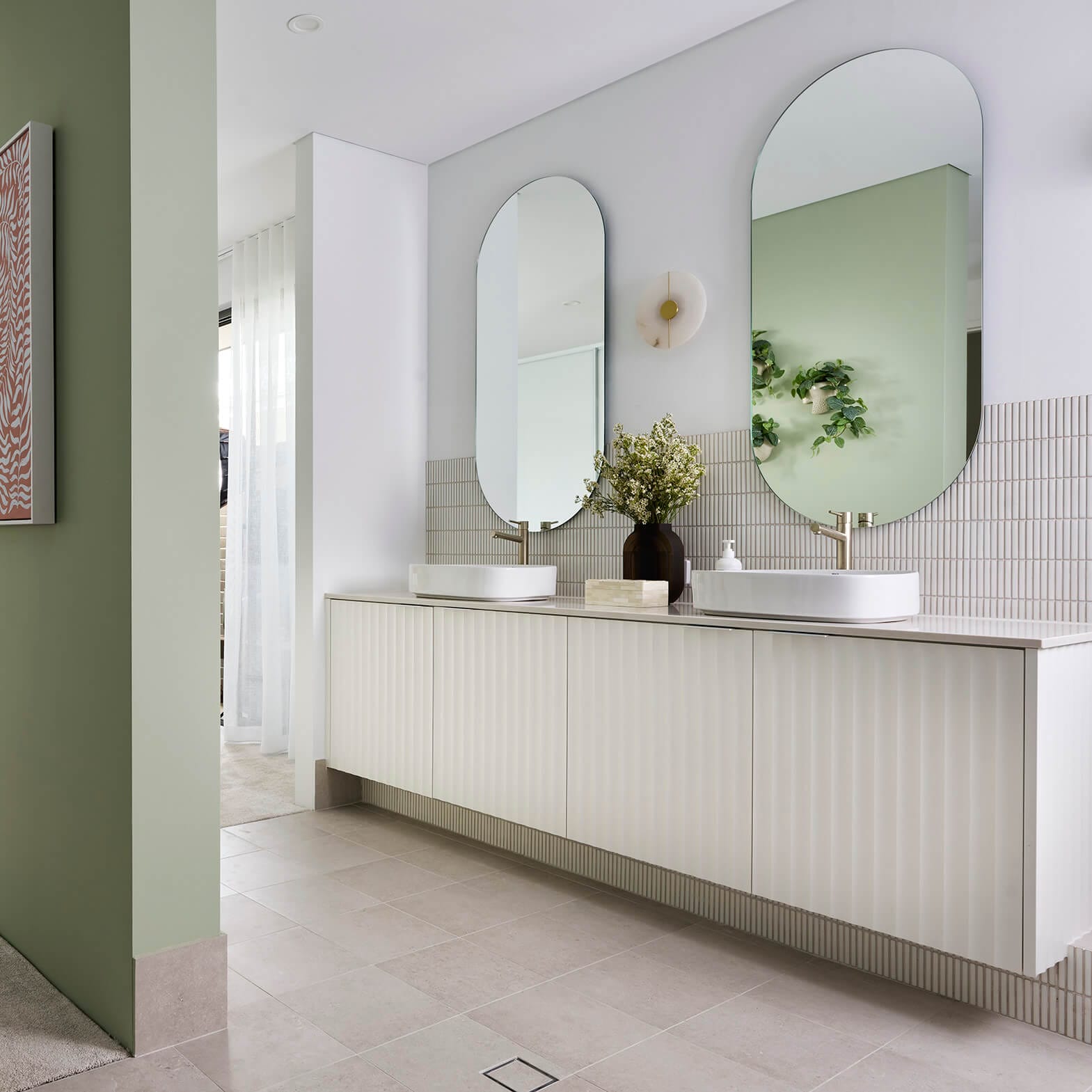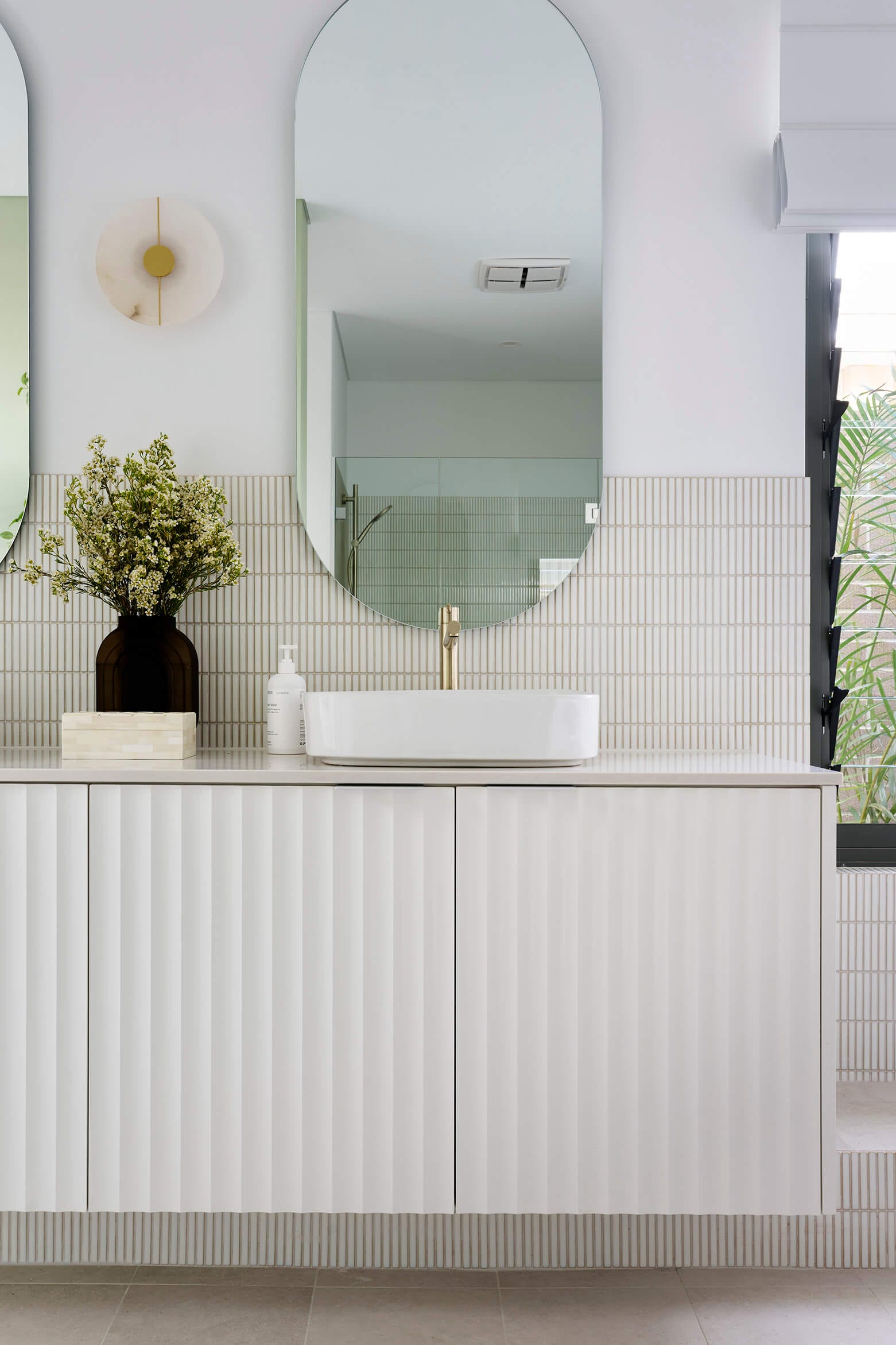 In this home’s ensuite, we have also used the Blossom White Smooth Cove 50 profile cabinetry, which adds texture and detail to an all-white design.