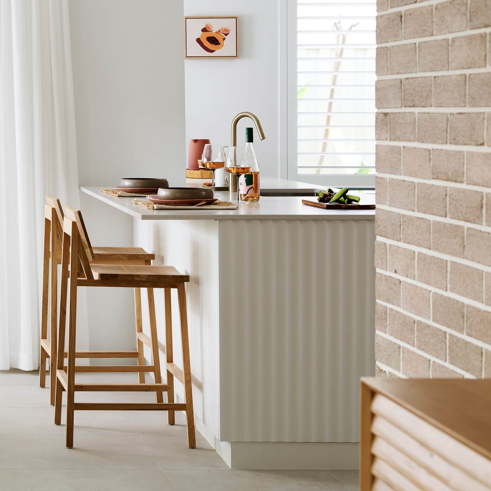 The cabinetry colours in this kitchen are Polytec Blossom White Smooth and Natural Oak Ravine. The Blossom White Smooth selection gives this kitchen a sleek flat surface texture and combines the Cove 50 profile panels, adding a concave curve to the kitchen peninsula. The Natural Oak Ravine cabinetry contrasts against this and has an embossed woodgrain surface adding another layer of texture to the design.