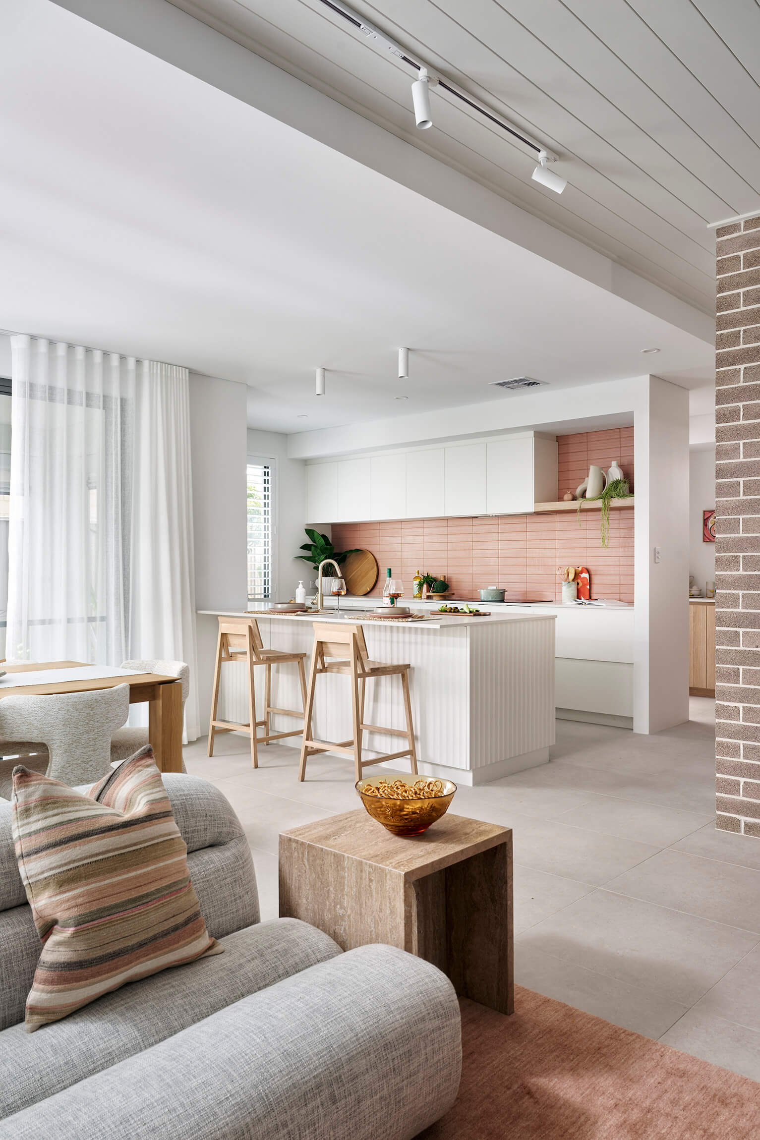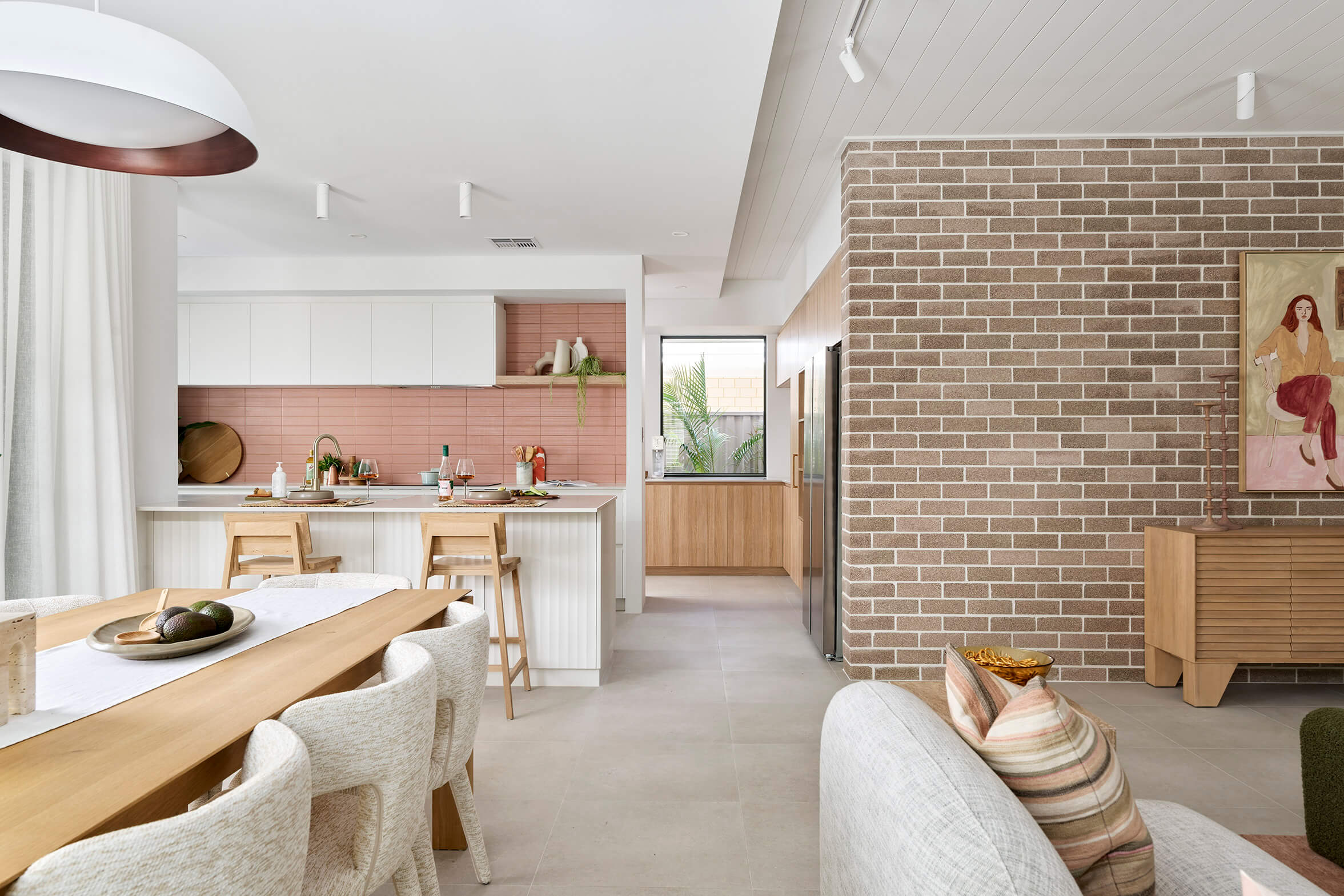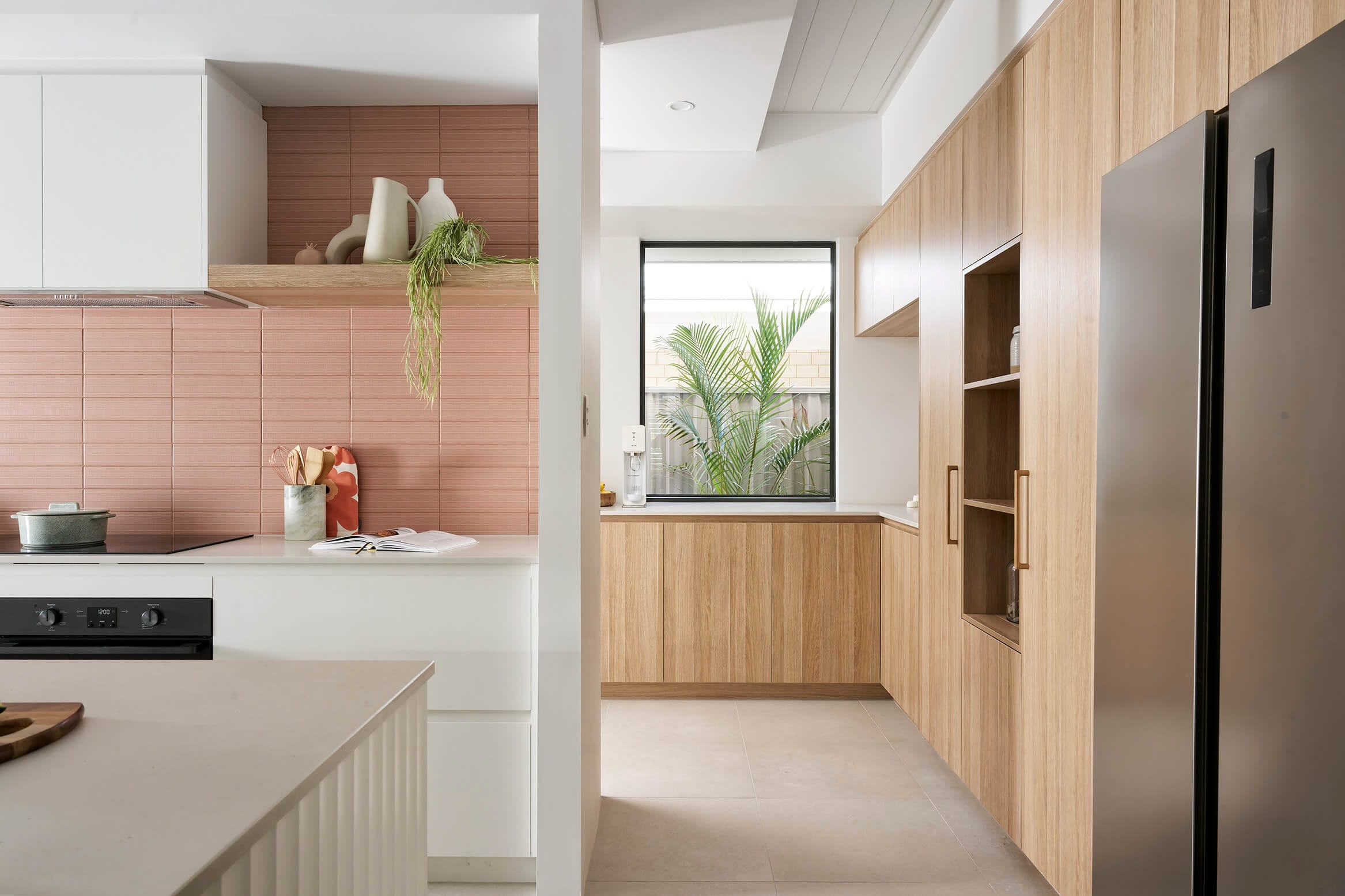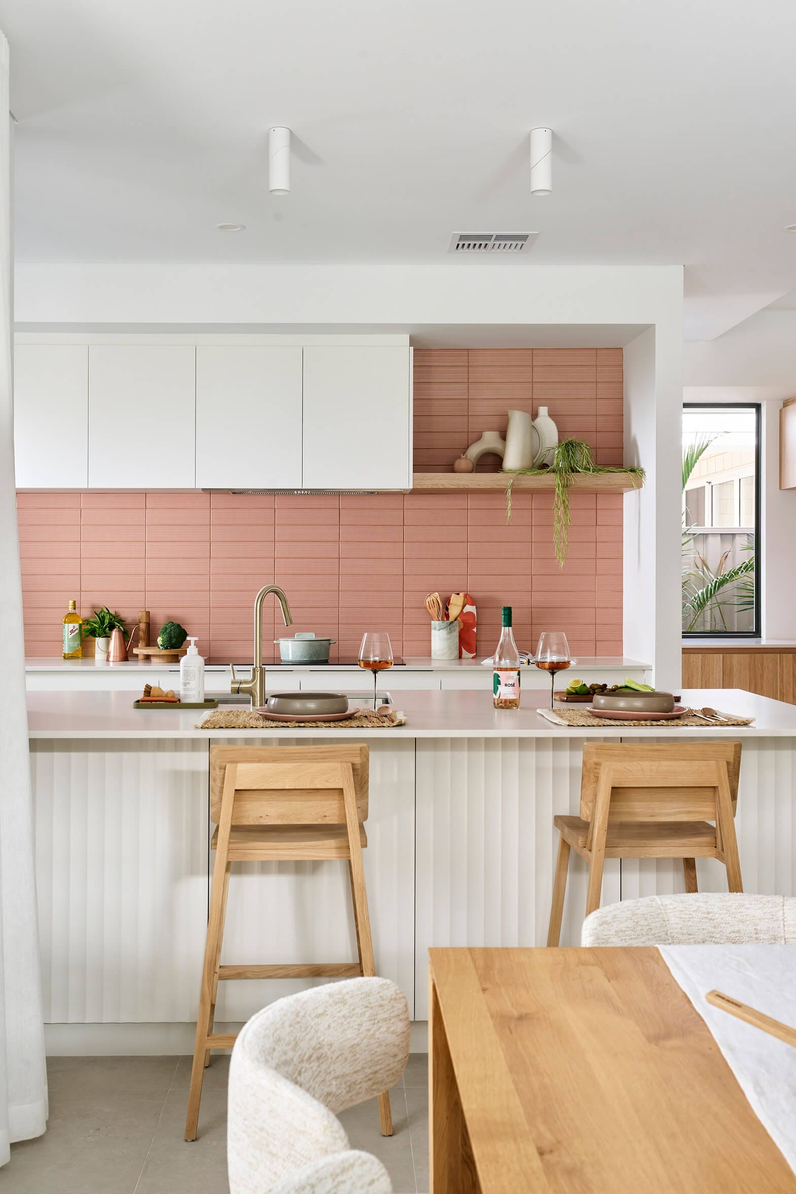 Colour in kitchens is trending right now, and this design packs a punch with a striking pink tiled splashback selection.