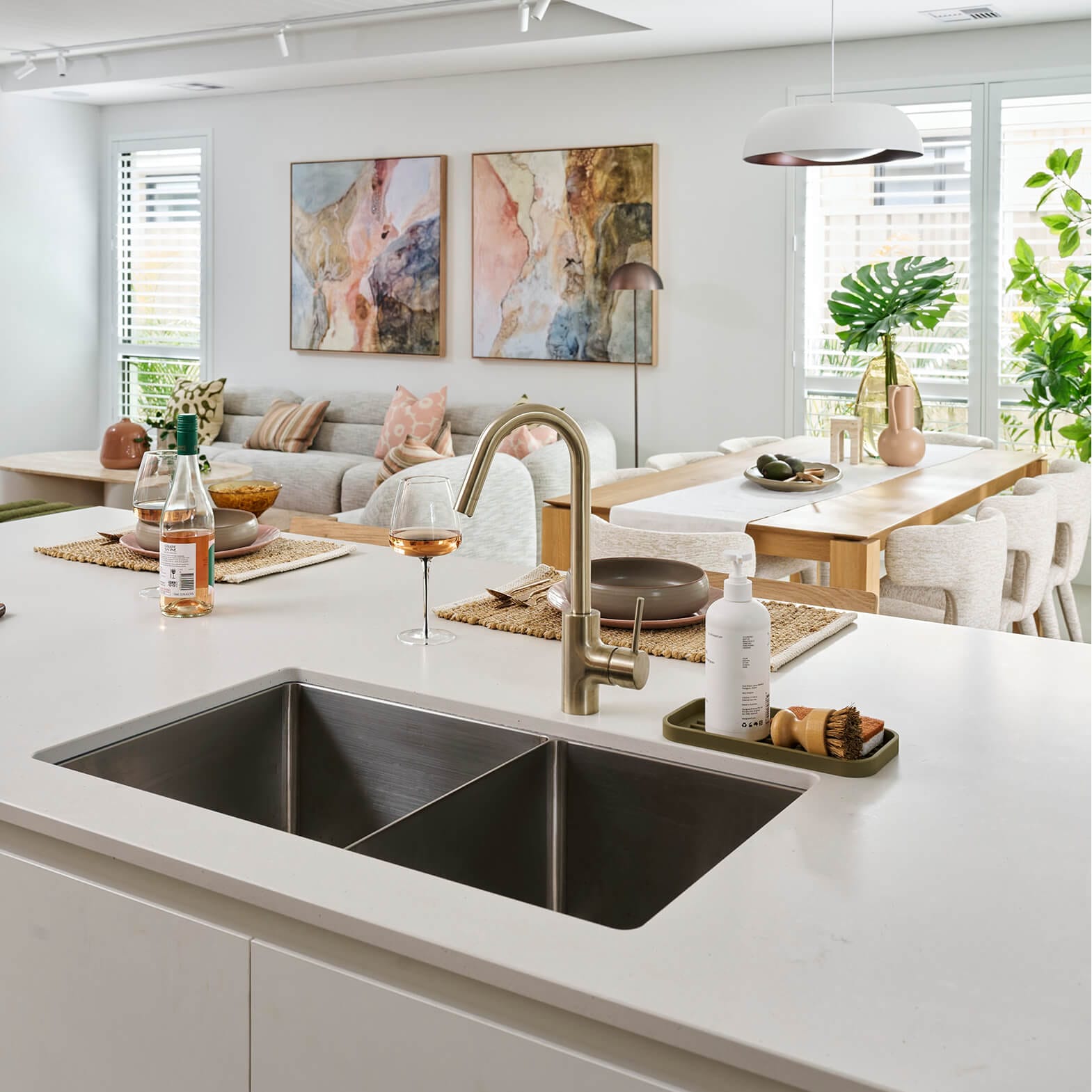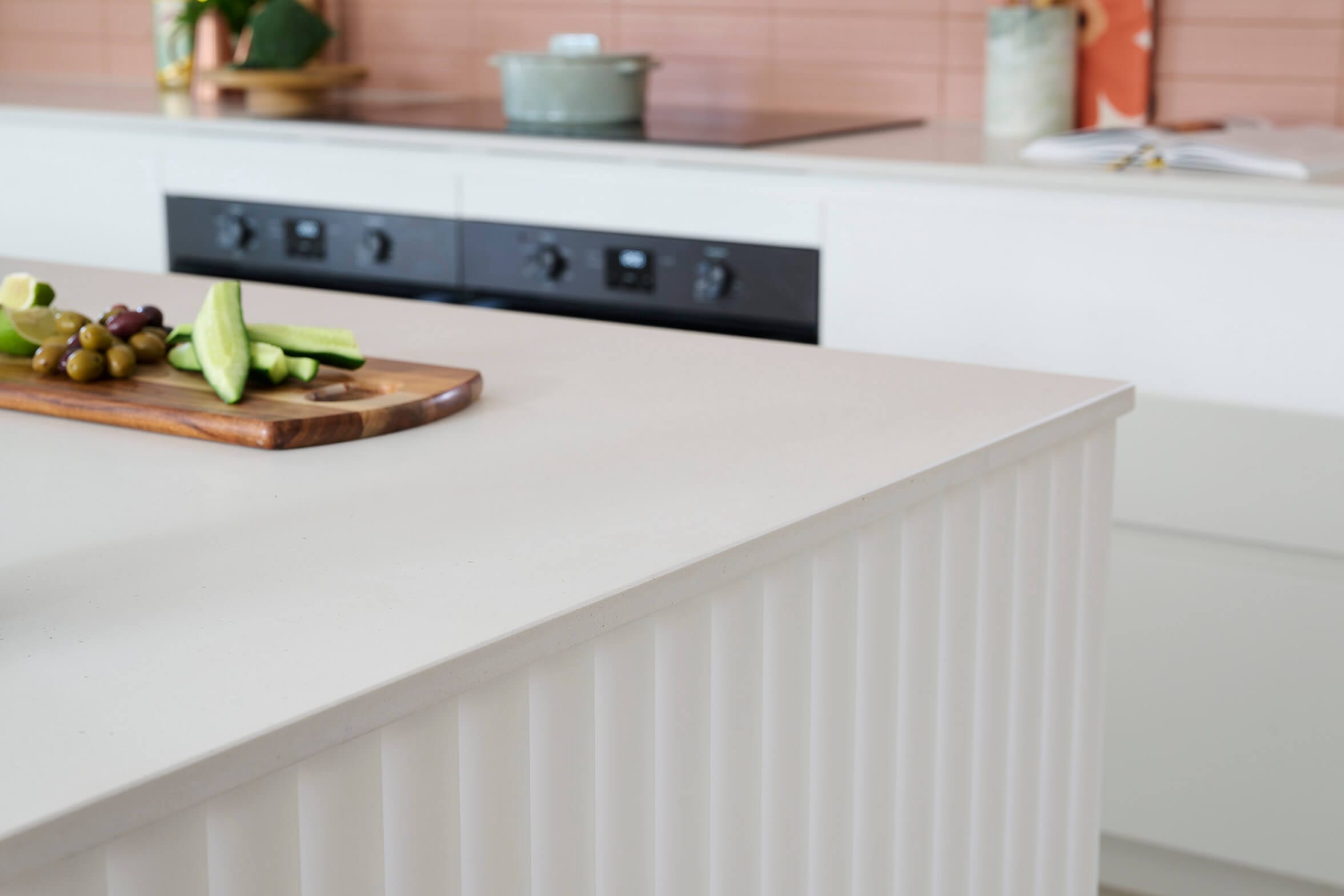 The benchtops are Caesarstone Fresh Concrete, which gives the look of a modern, crisp white concrete finish with subtle grey flecks throughout.