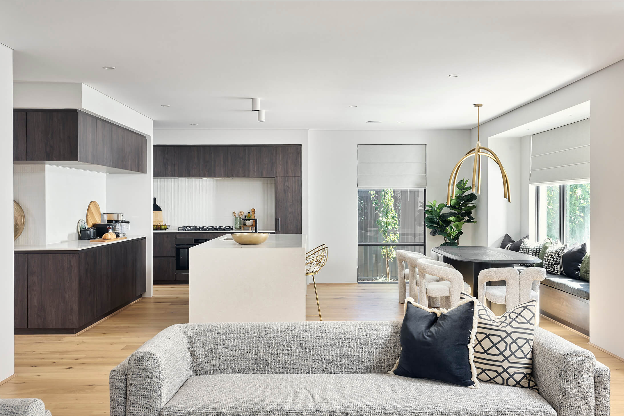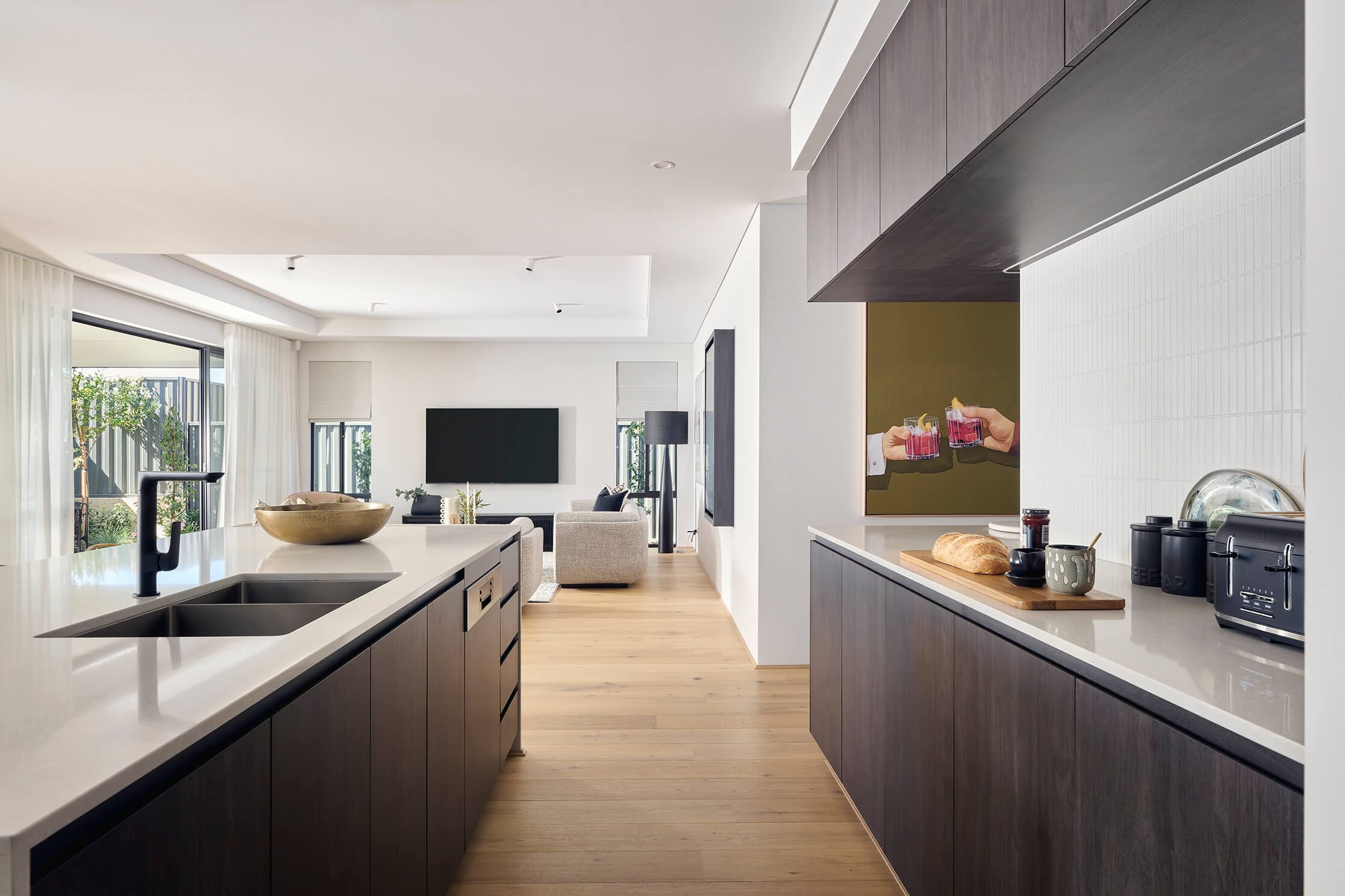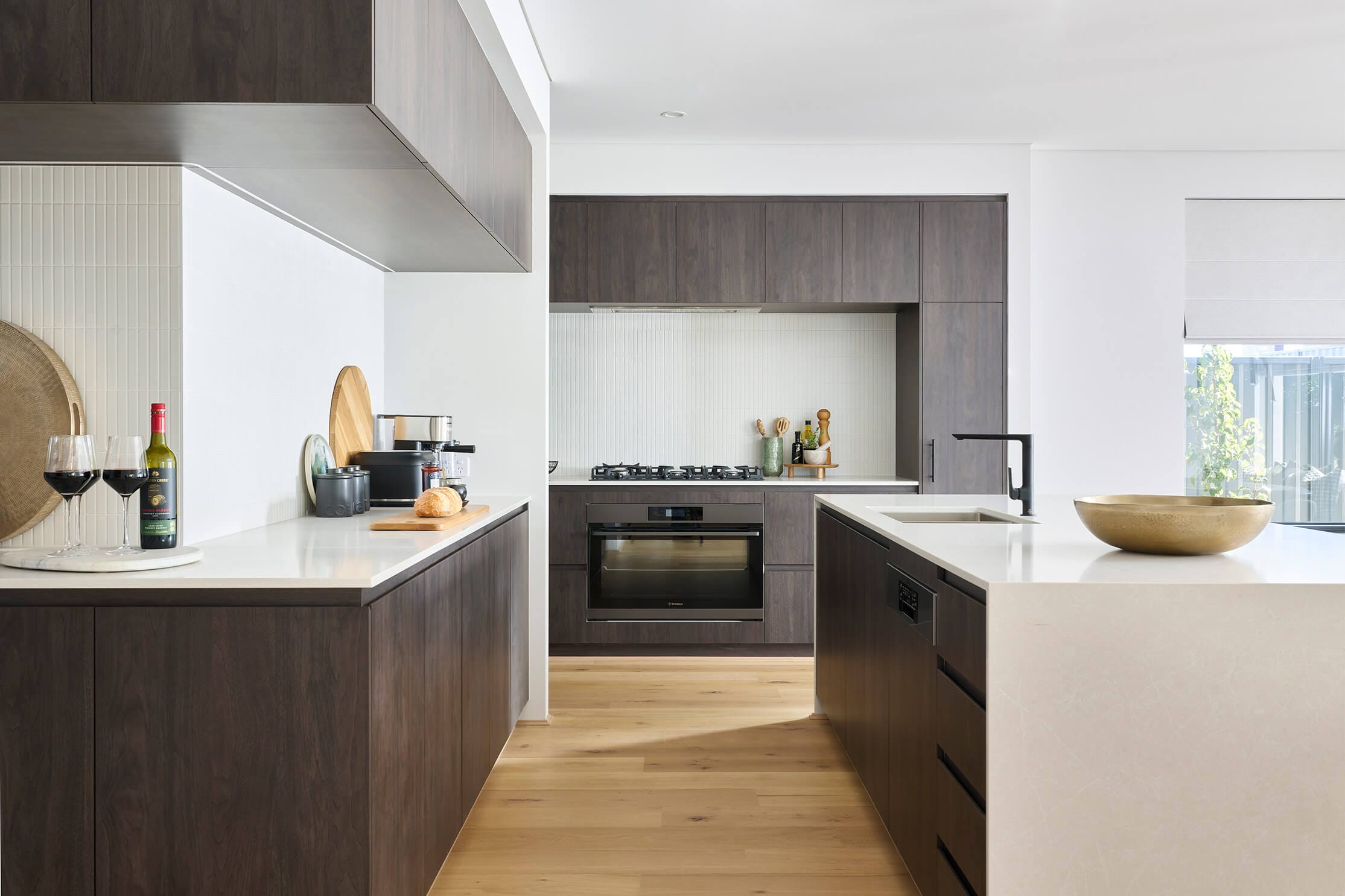 The dark Perugian Walnut Woodmatt Polytec cabinetry sets the tone for this kitchen, creating a sophisticated, moody backdrop. Its rich timber print in smoky grey and deep brown tones adds texture and depth, while handleless designs and clean lines maintain a modern, seamless look. Integrated LED strip lighting highlights the benchtops and accentuates the sleek profile of the cabinetry, adding both function and contemporary flair.