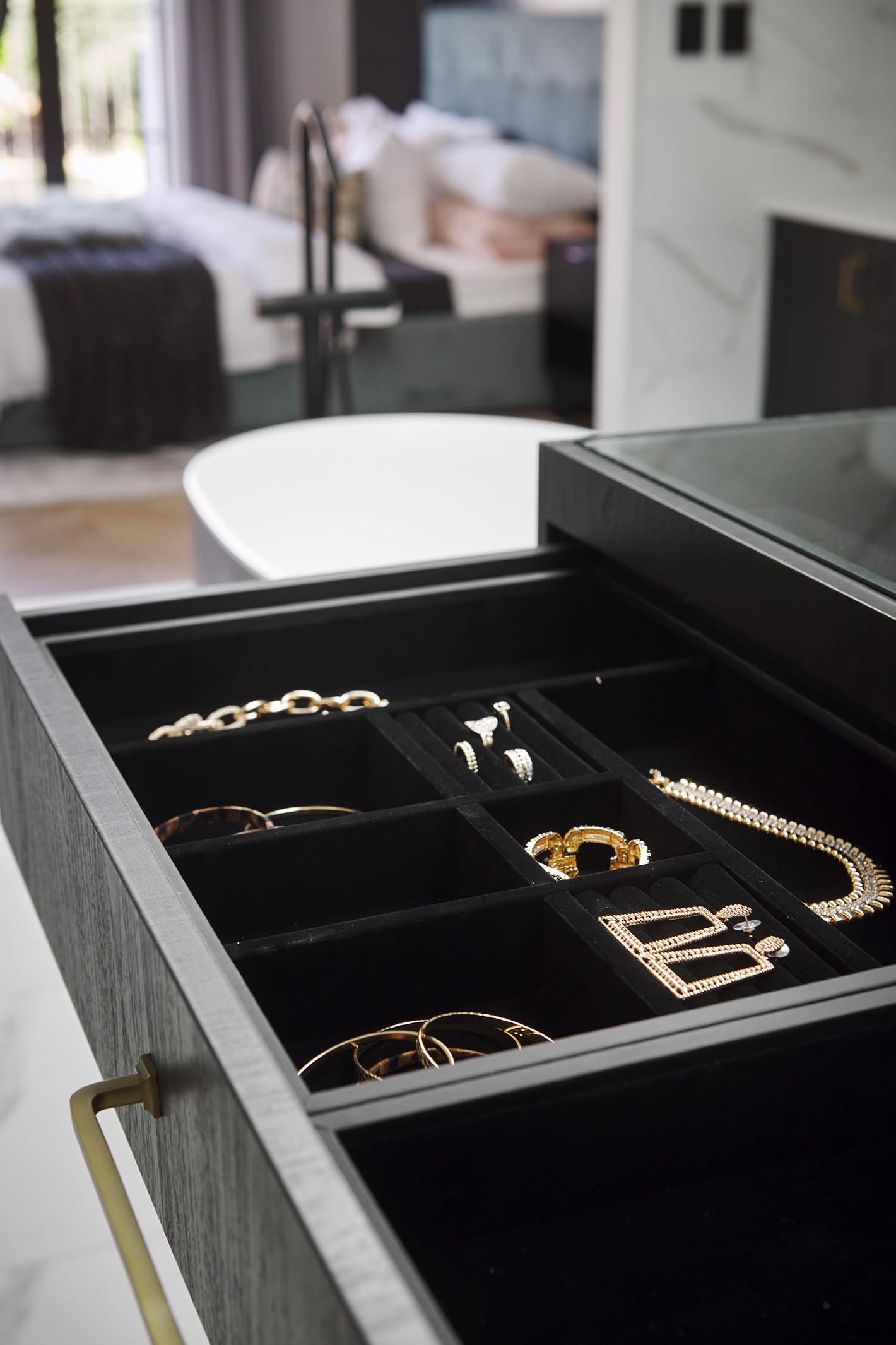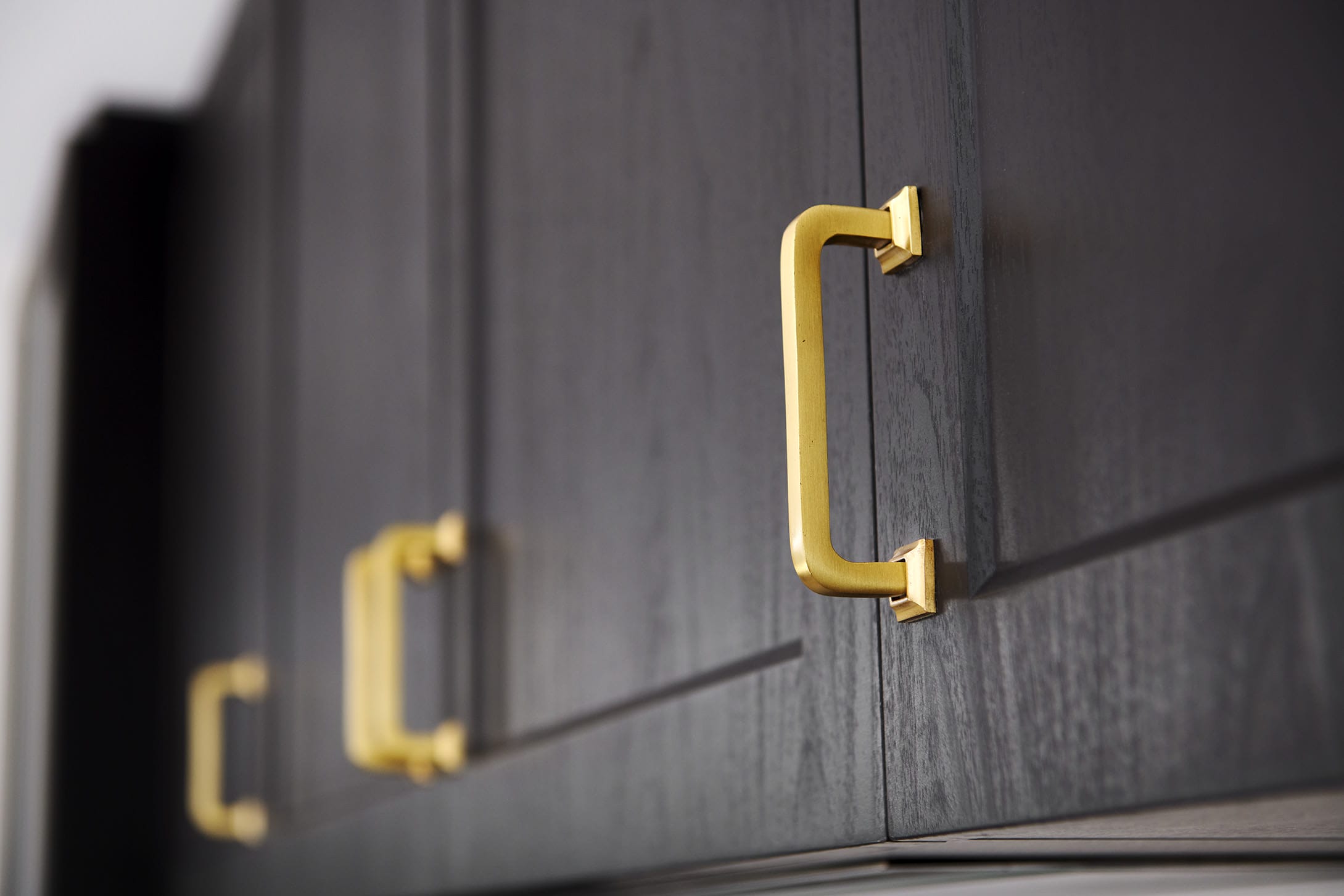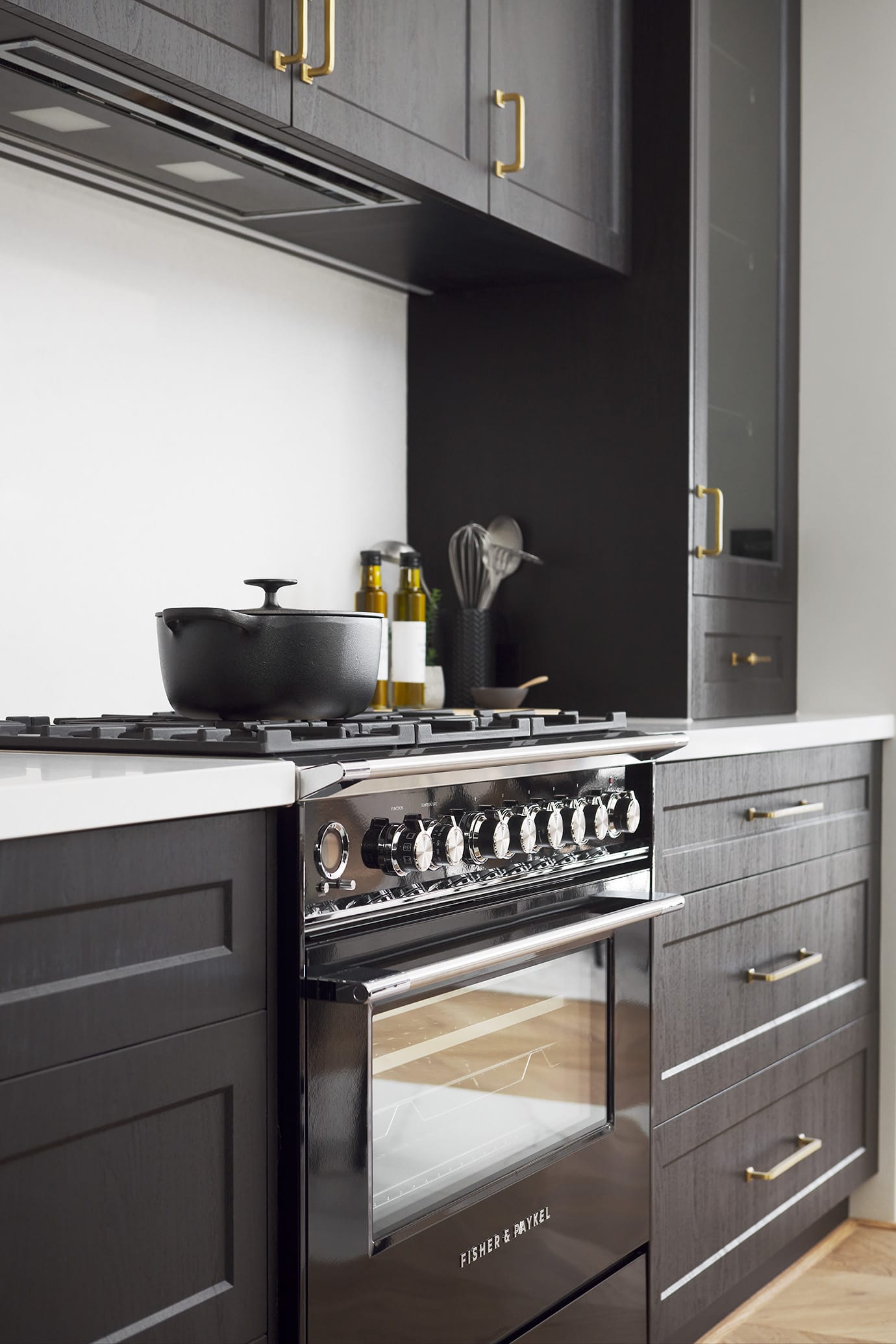 We chose stylish Casino Profile cabinetry in a moody charcoal to set the theme in the kitchen and throughout the custom cabinetry in the entire home. The kitchen cabinetry offers ample storage, including glass display cabinets; with all cabinetry internals completed in charcoal for that luxxe appeal.