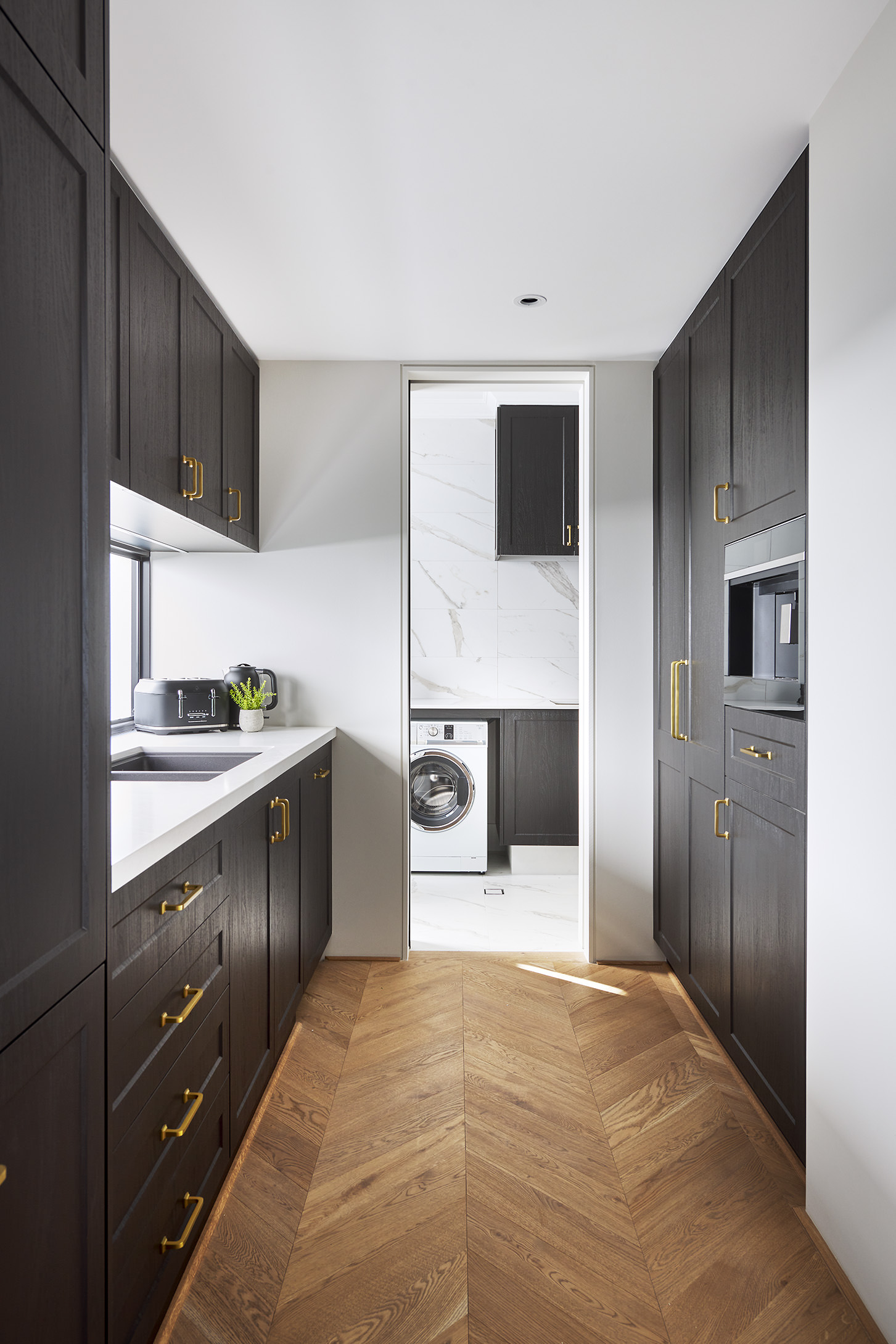 The star of the kitchen is the stunning cantilever island table. We chose a striking Organic White Caesarstone to offset the dark tones in this monochromatic design. Touches of brass are given special attention in this kitchen in the cabinetry handles and the inlay to the marble flooring against the Chevron timber floors.