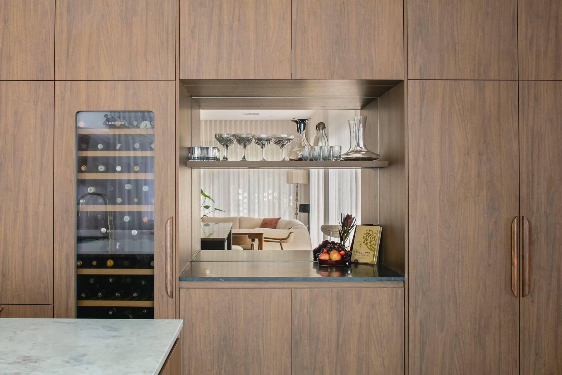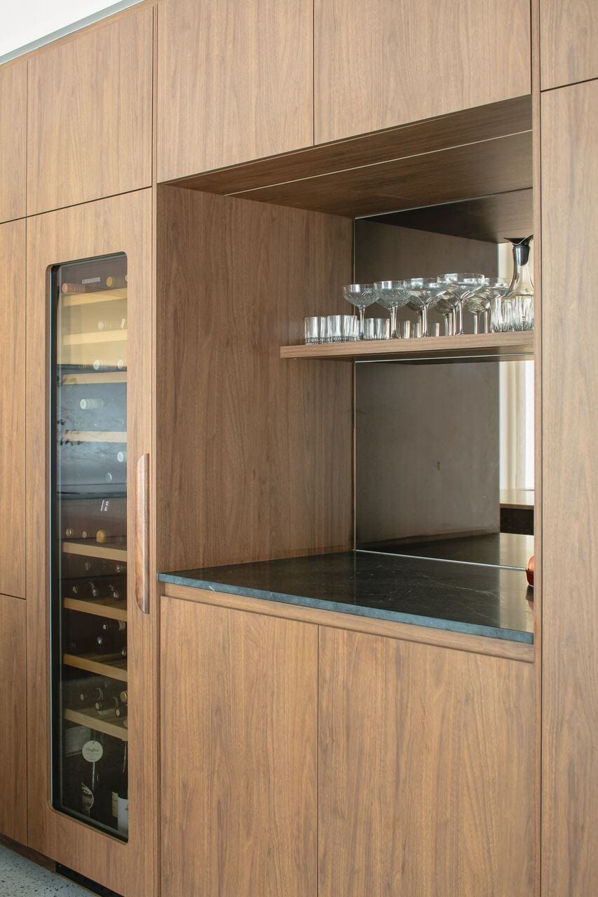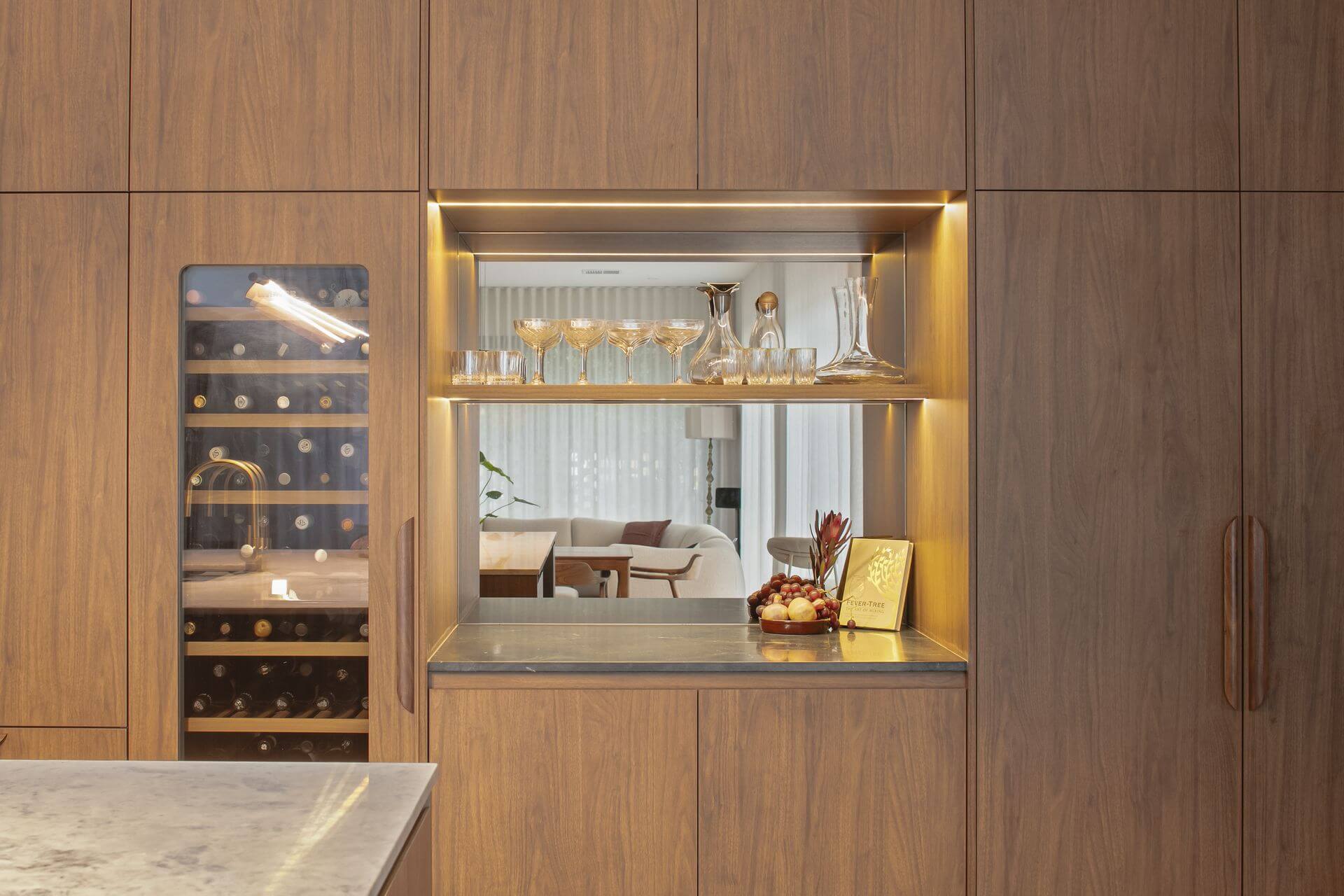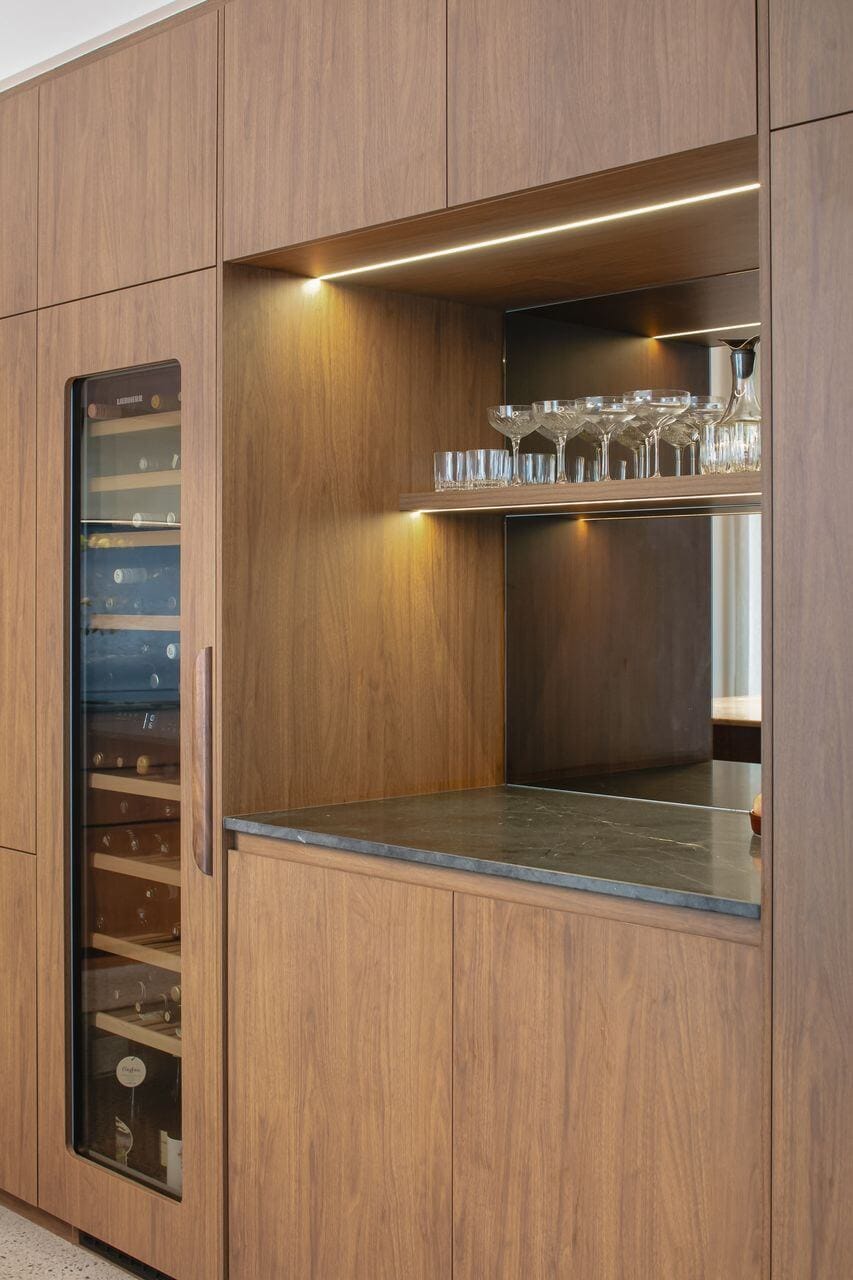 Fully integrated appliances maintain the clean lines of the cabinetry, including a French door fridge, dishwasher, and built-in cooking appliances. A stacked microwave and oven combination provides practical everyday use, while the induction cooktop delivers a sleek, modern surface. A concealed appliance cupboard with sensor lighting provides additional storage, keeping everyday items neatly hidden away while maintaining the streamlined aesthetic. Next to the bar area, a Liebherr integrated dual wine cellar with a glass-front finish adds both luxury and functionality.