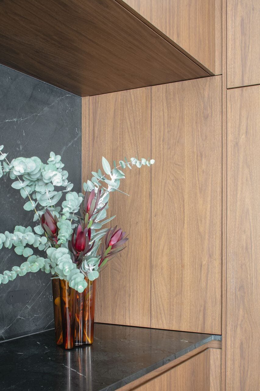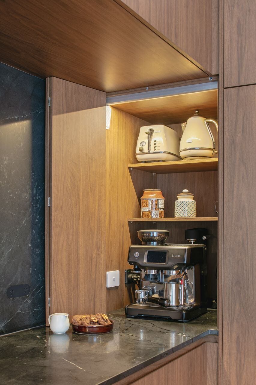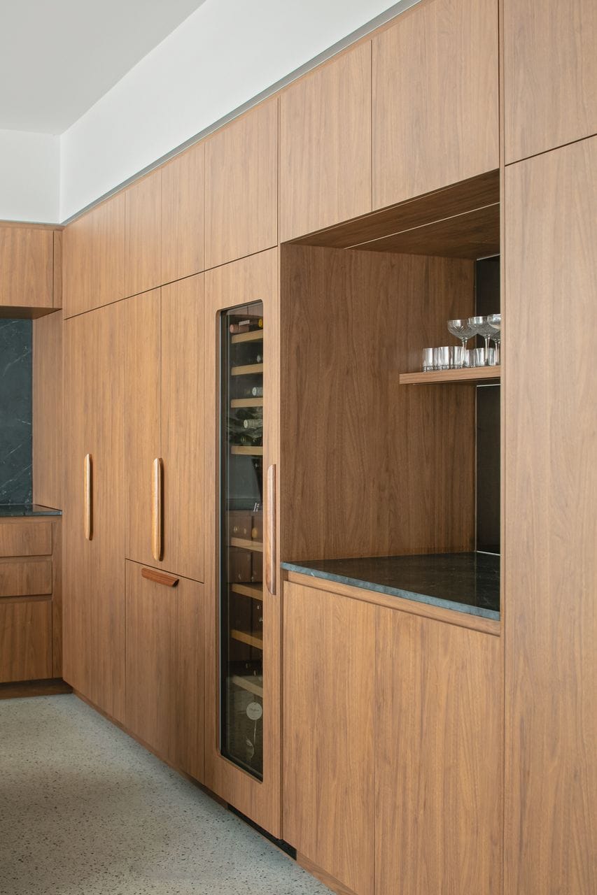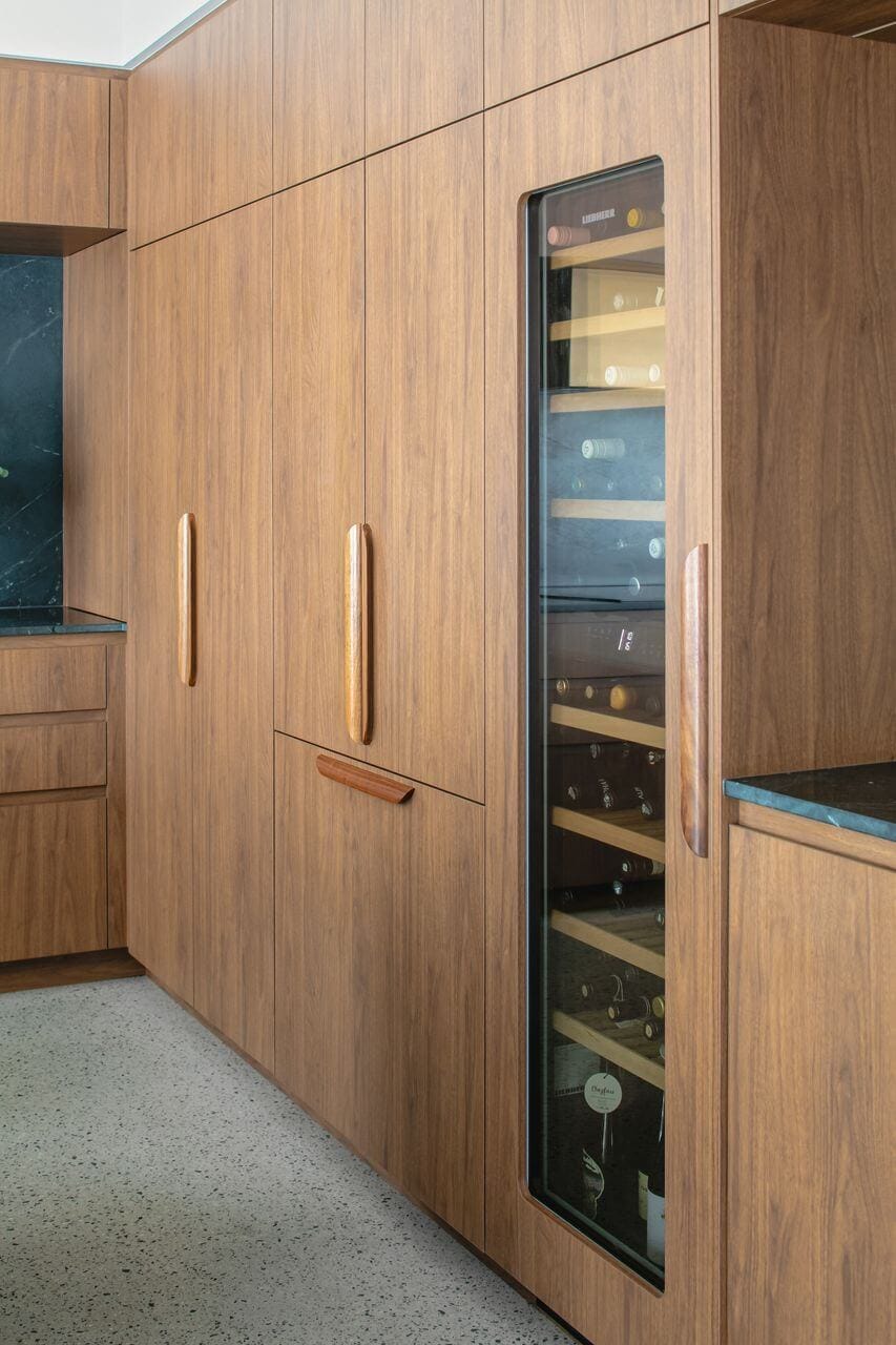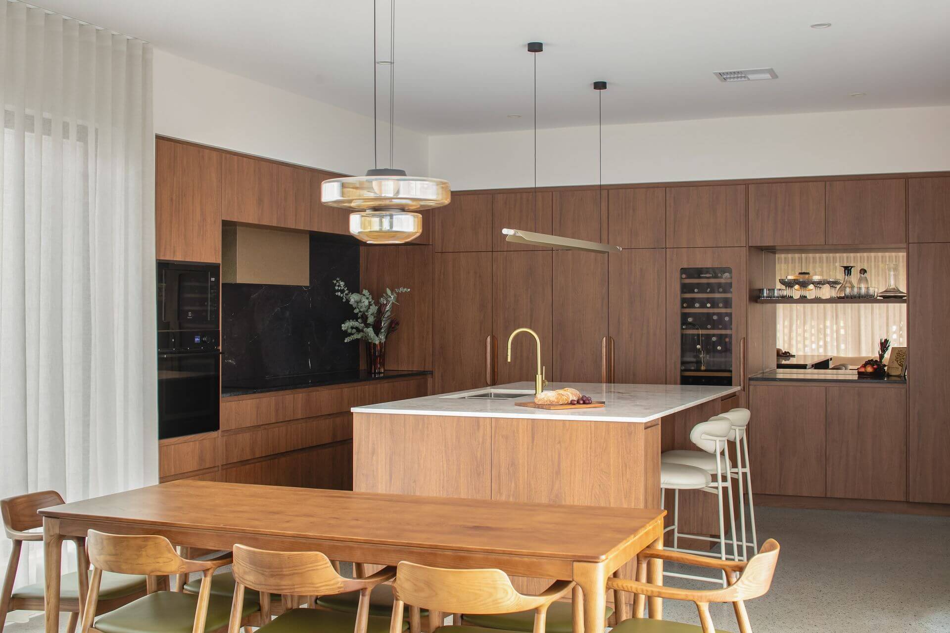 Polytec’s Florentine Walnut cabinetry anchors the design with its deep chocolate brown tone and natural timber grain. Used throughout the kitchen, including the open shelving in the bar area and appliance cupboard, it creates a cohesive and warm palette.