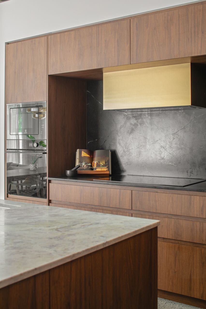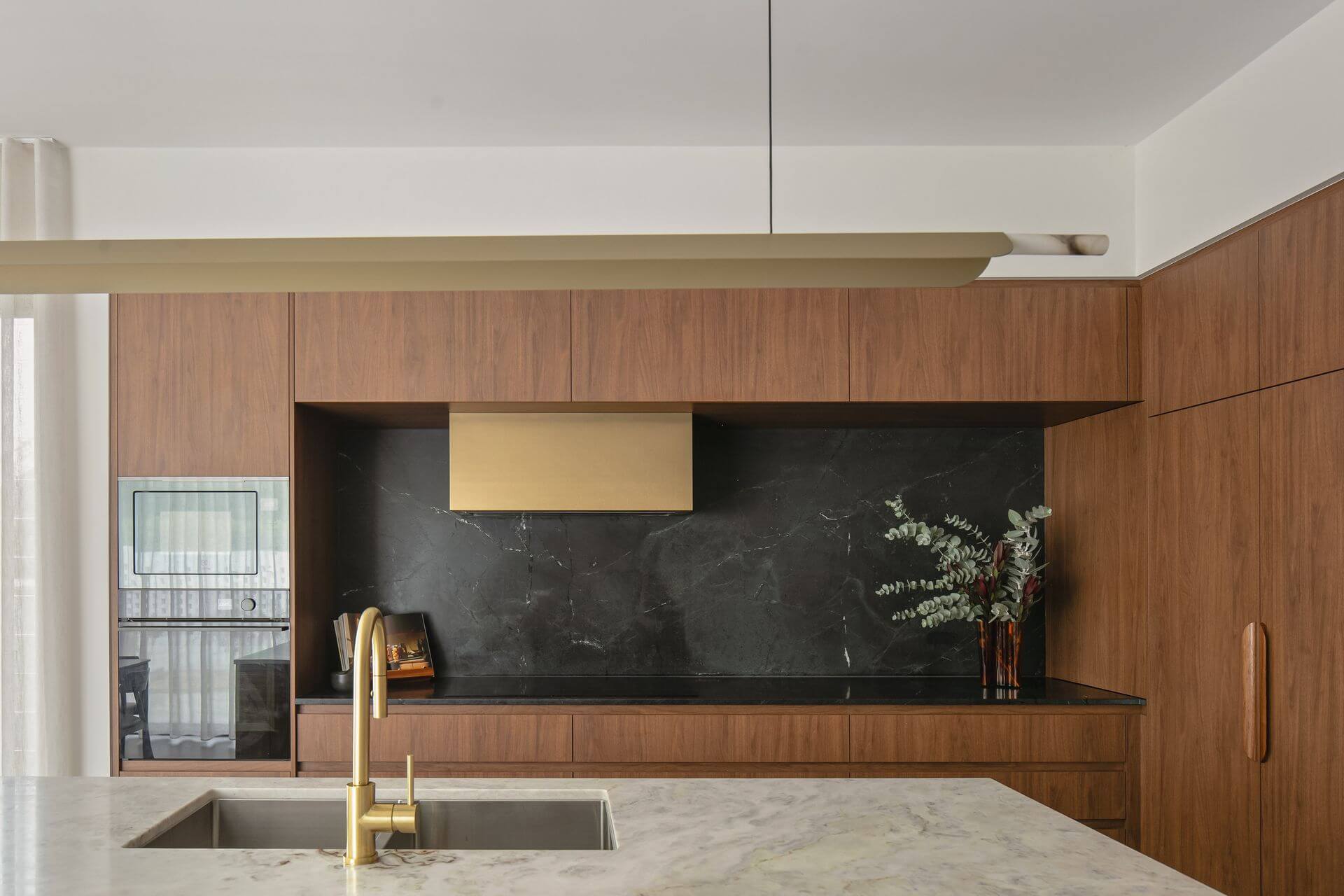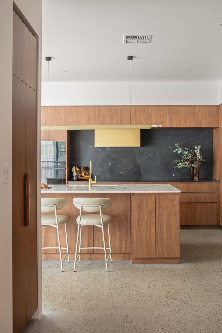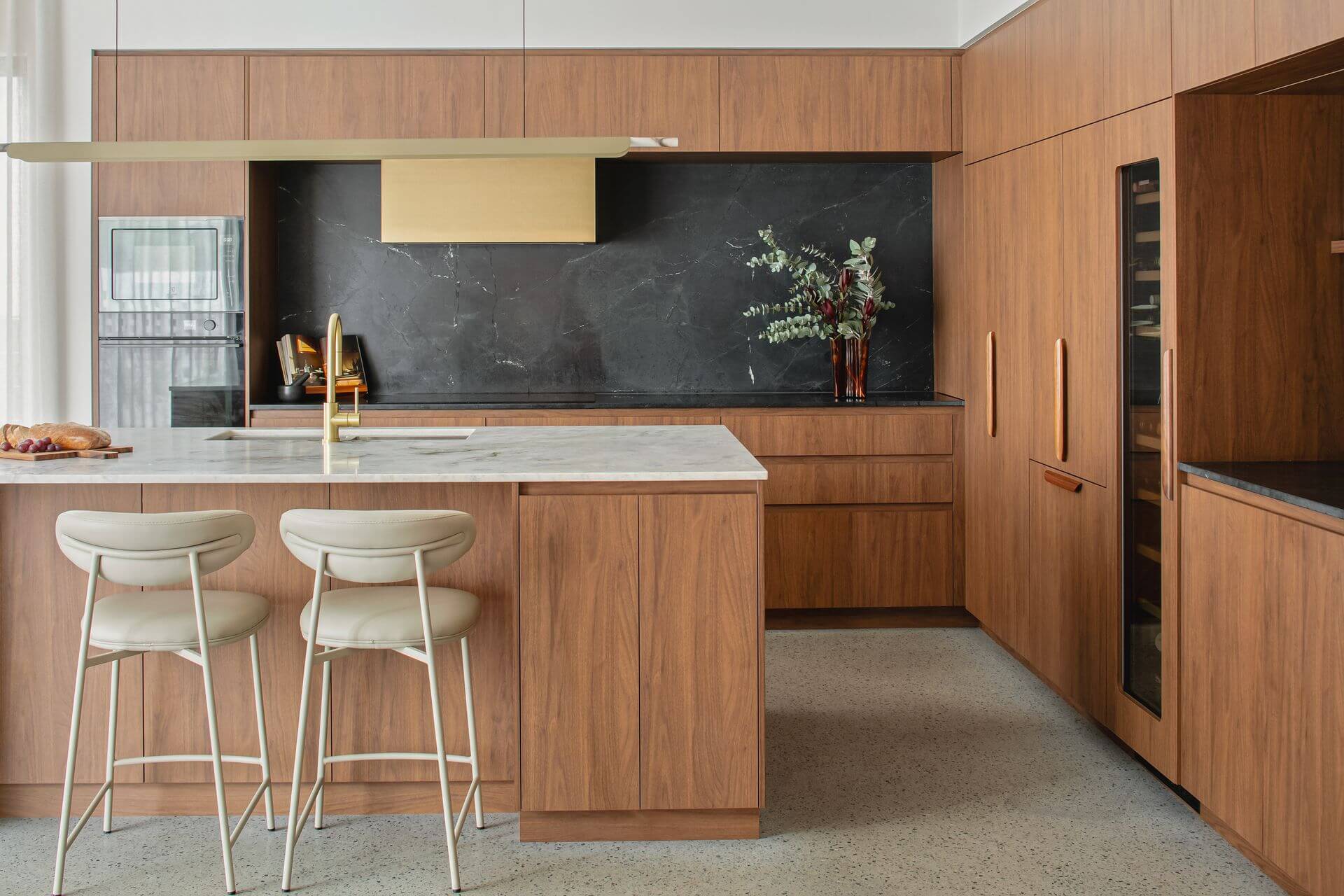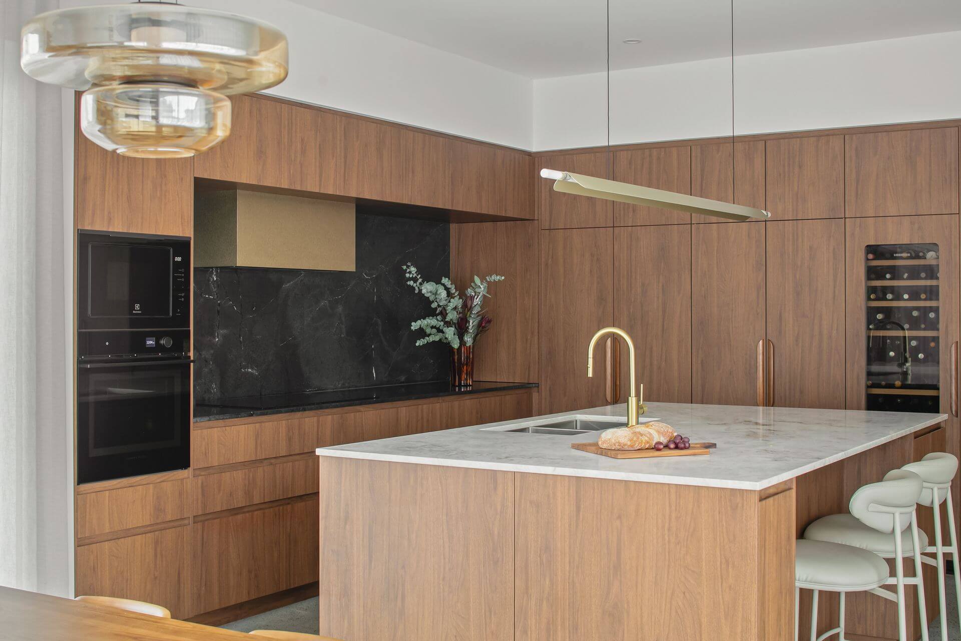This kitchen makes a statement through contrast – pairing deep walnut cabinetry with dramatic black stone and a softly toned, off-white island bench. The result is a space that feel sophisticated and architectural, yet warm and grounded.