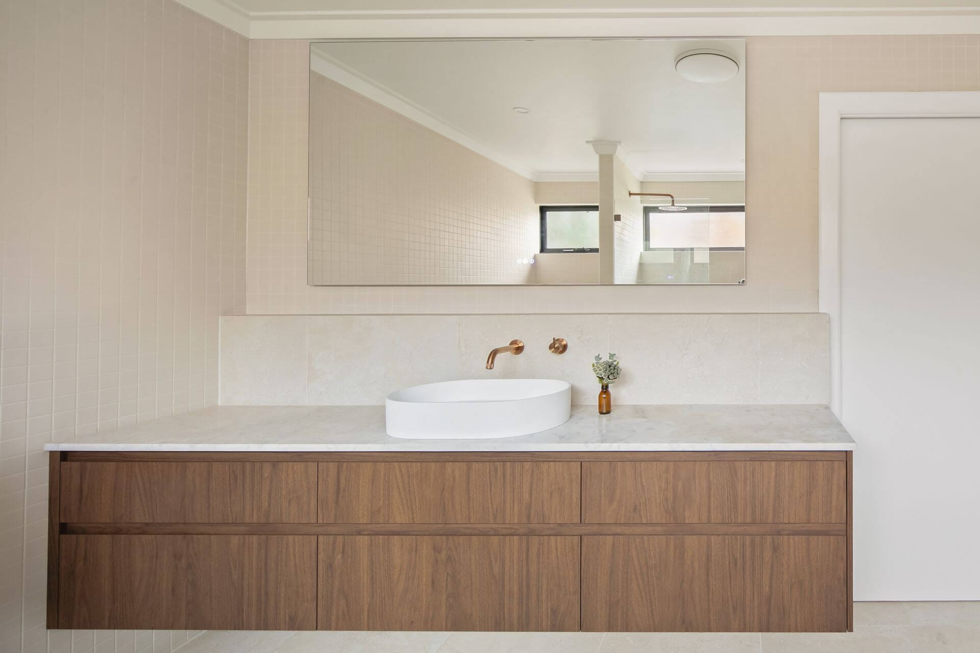 The ensuite carries through the home’s material palette, combining warm Florentine Walnut timber with the soft, luxurious Palazzo Dolomite stone. An above-bench basin creates a sculptural focal point, complemented by rich, brushed copper tapware.