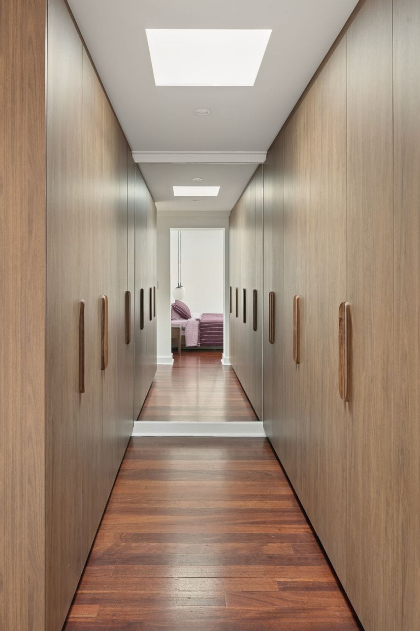 The walk-in robe continues the Florentine Walnut cabinetry in a Woodmatt finish, with tall cabinets featuring Kethy Timber Archive handles in walnut. LED strip lighting with door sensor switches in warm white adds practical, subtle illumination.