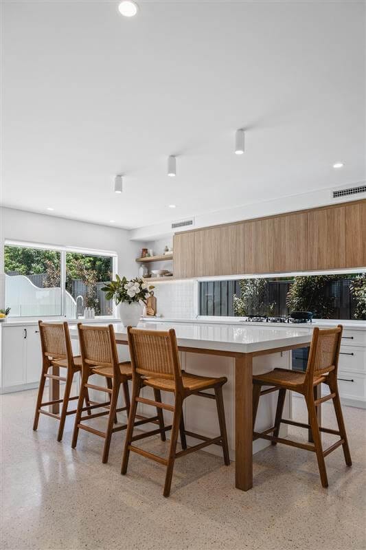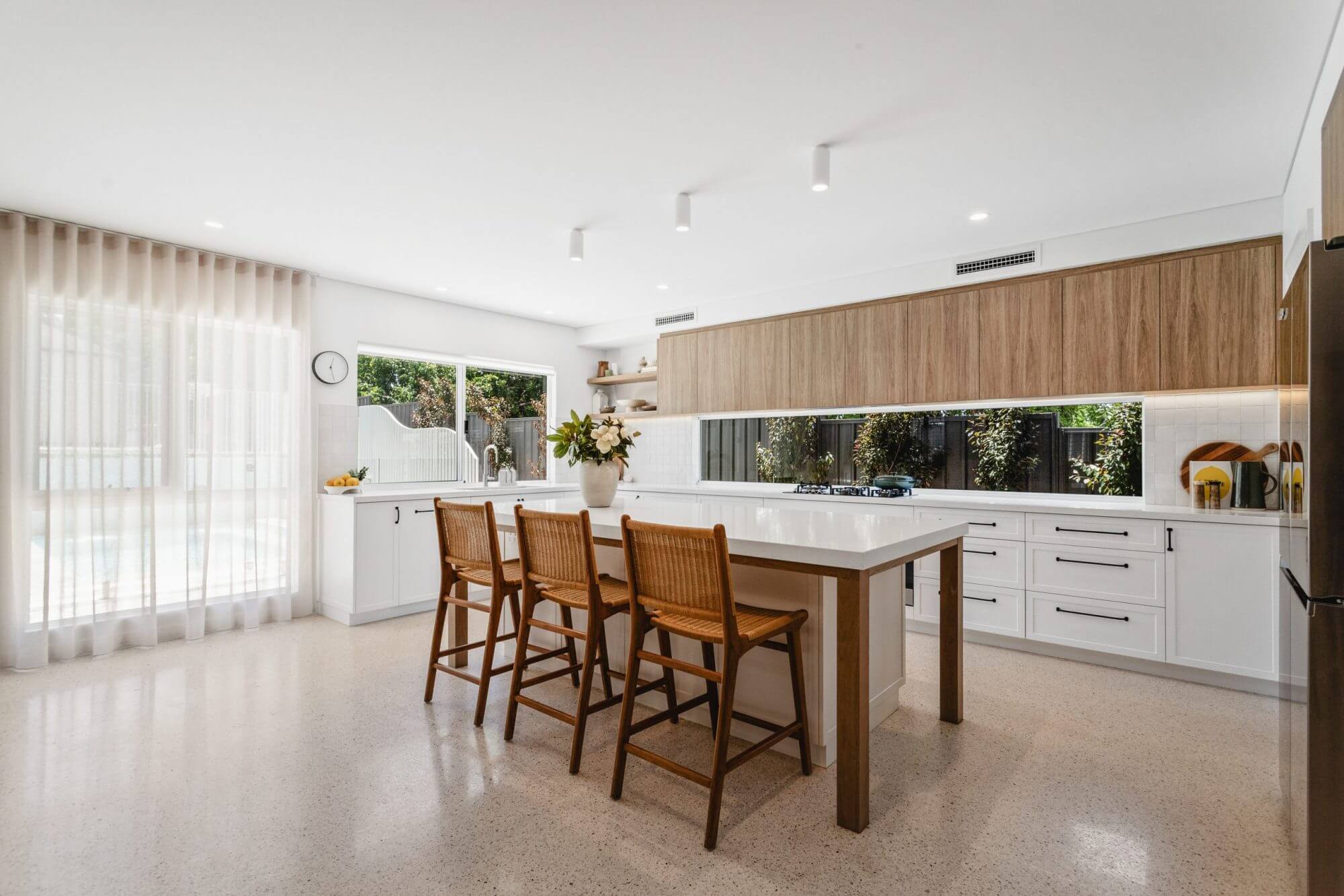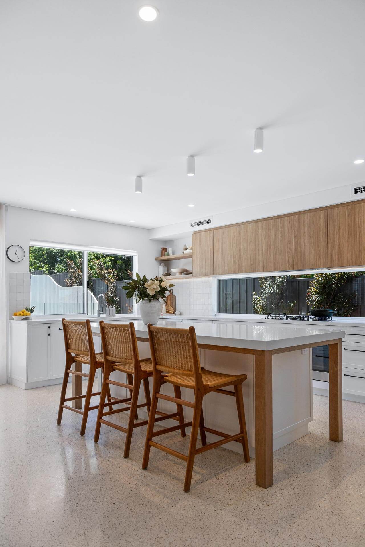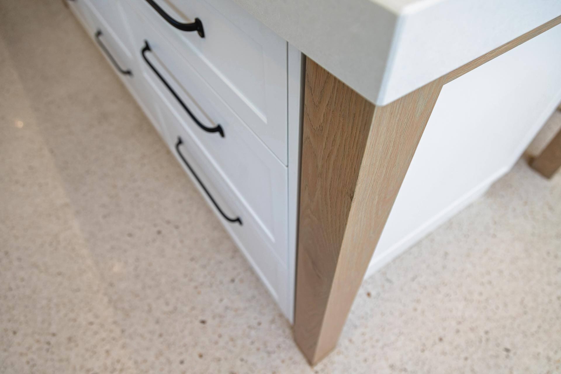 The feature kitchen island in this renovation project is unique with it’s framed style design that includes solid American Oak timber legs for detail interest and warmth. As part of the design process we were also to customise the seating layout of this island to also include an additional chair on the right hand side for when entertaining.