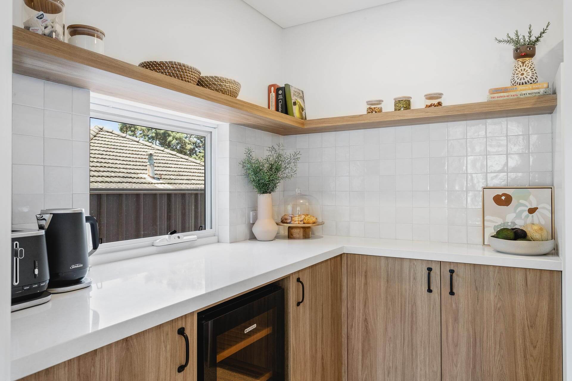 This contemporary kitchen design combines shaker profile with flat panel cabinetry; which is typical of the new Modern Shaker style kitchens that are on trend right now. Polytec Ascot cabinetry in Classic White is paired with Prime Oak handleless overhead cupboards; and an asymmetrical open shelf feature to break up the run of overhead cabinetry.
