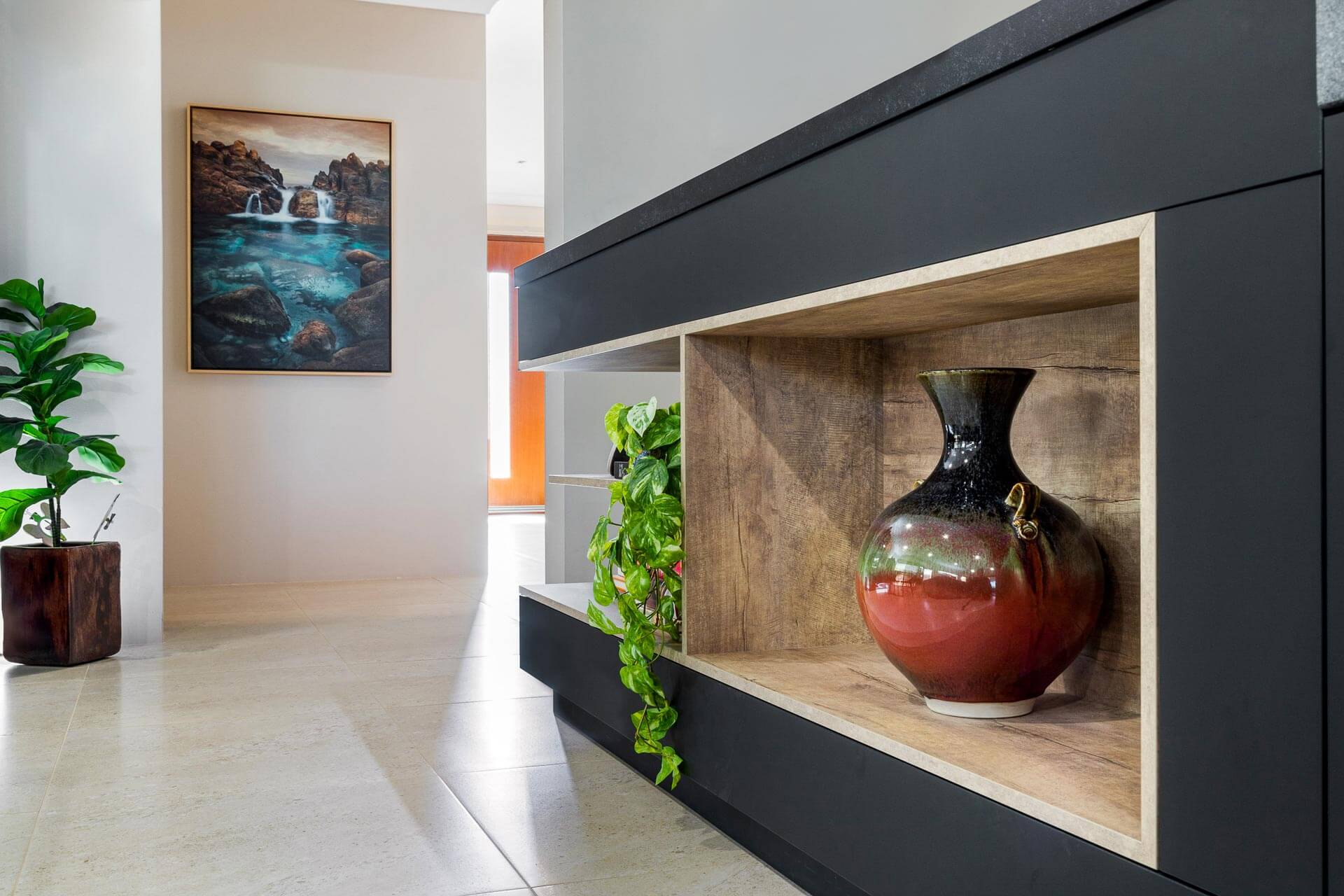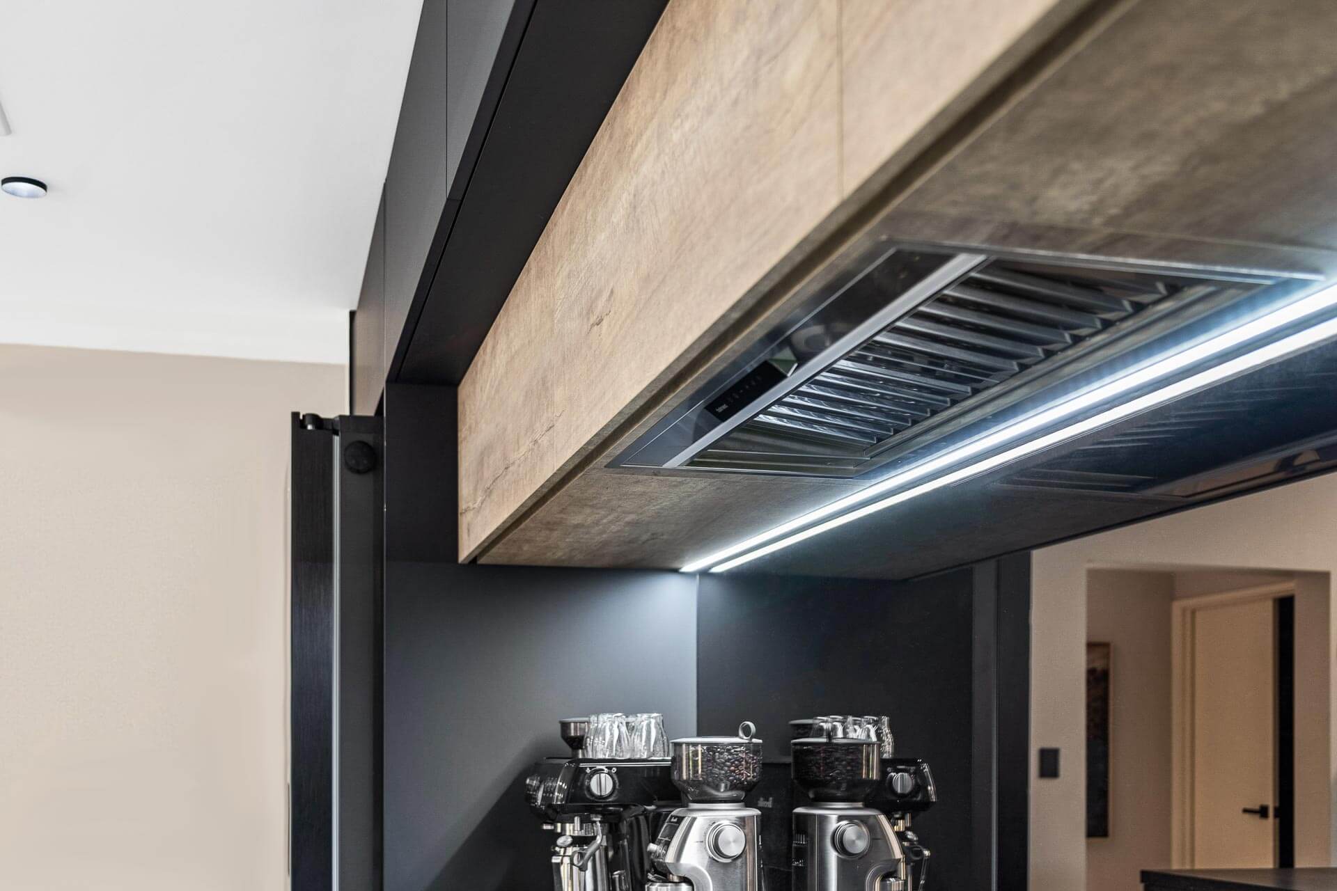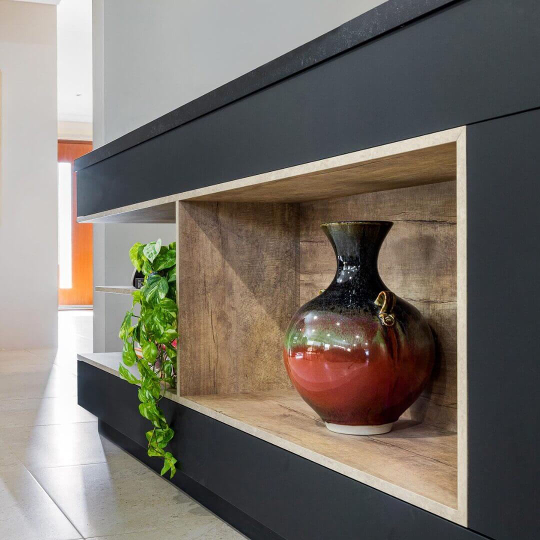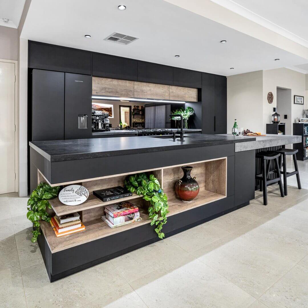 Polytec STECCAWOOD adds raw texture to the asymmetrical kitchen island design and makes functional cabinetry in this island design a striking feature. The tall cabinetry makes a statement to the design drawing your eye upward and the warm toned Laminex Artisan Beamwood softens the dark colour scheme to coordinate with the walls and floor of the home.
