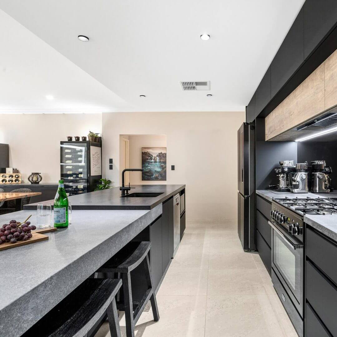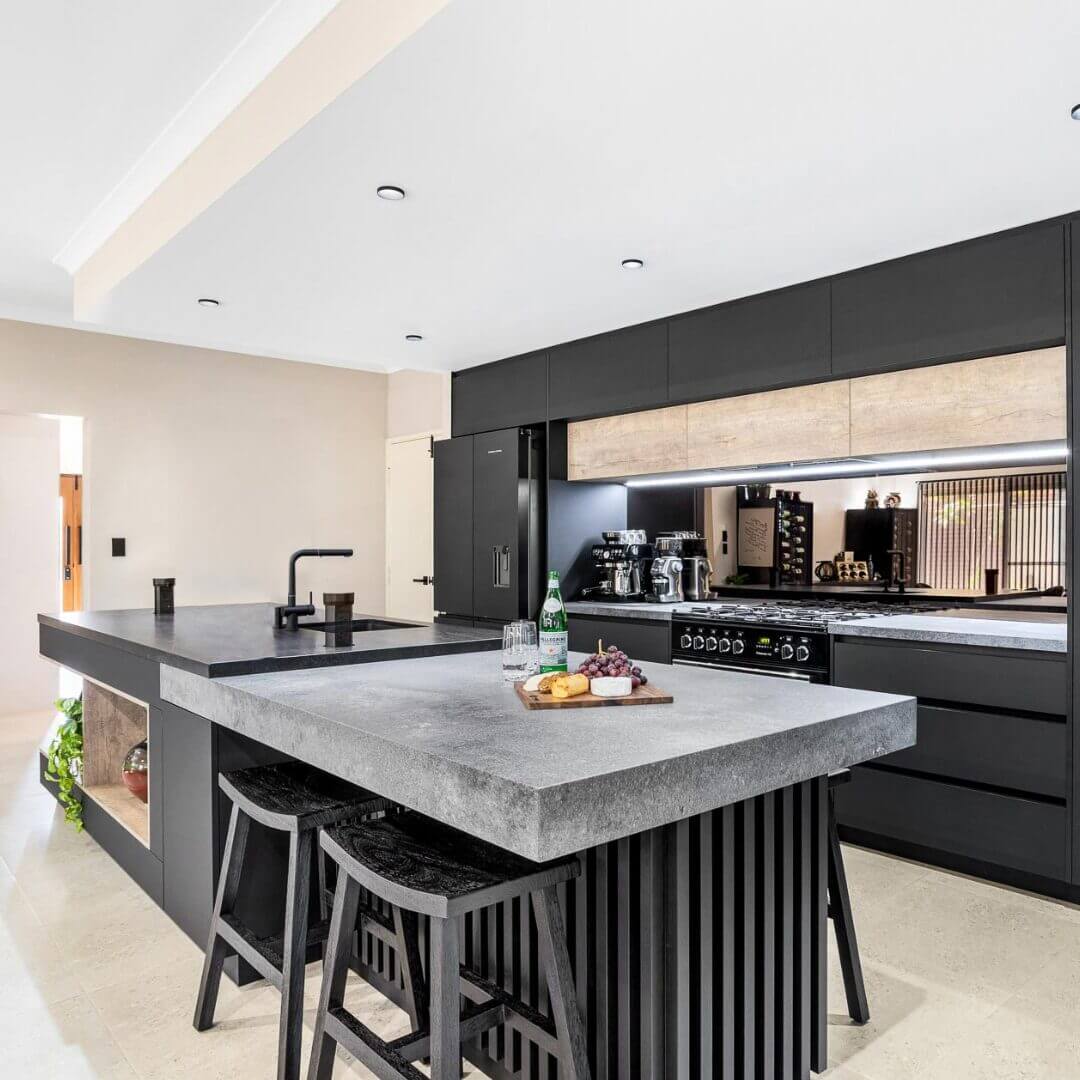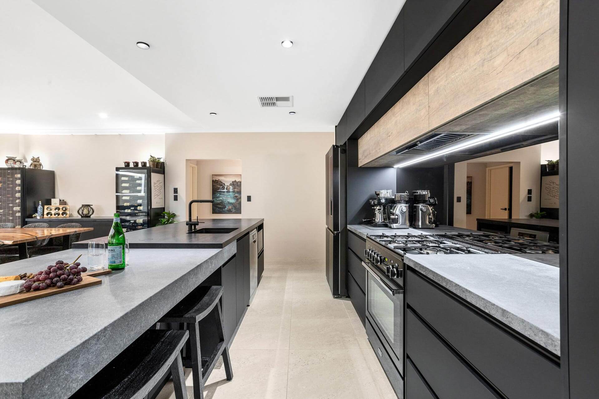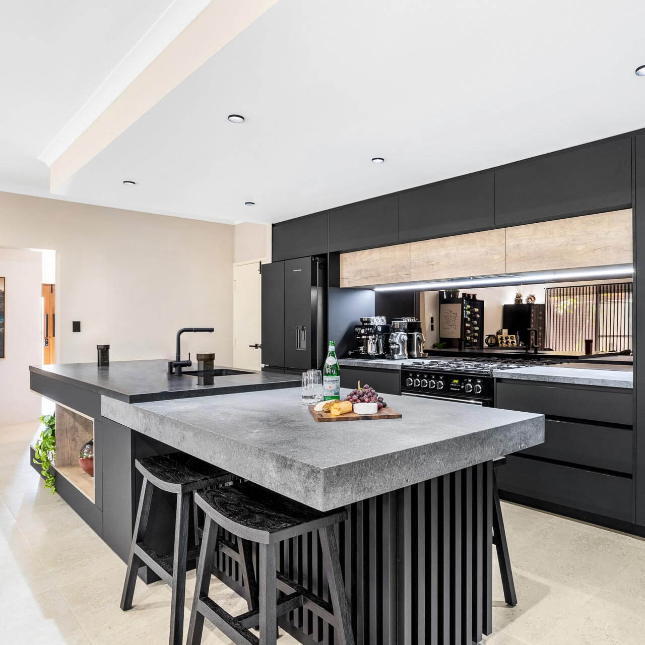 Simon and Manja had already purchased their luxury Falcon Nexus freestanding oven which stars as a central feature as part of this kitchen design. Caesarstone Black Tempal benchtops pair with Caesarstone Rugged Concrete in a super stylish layered kitchen island design.