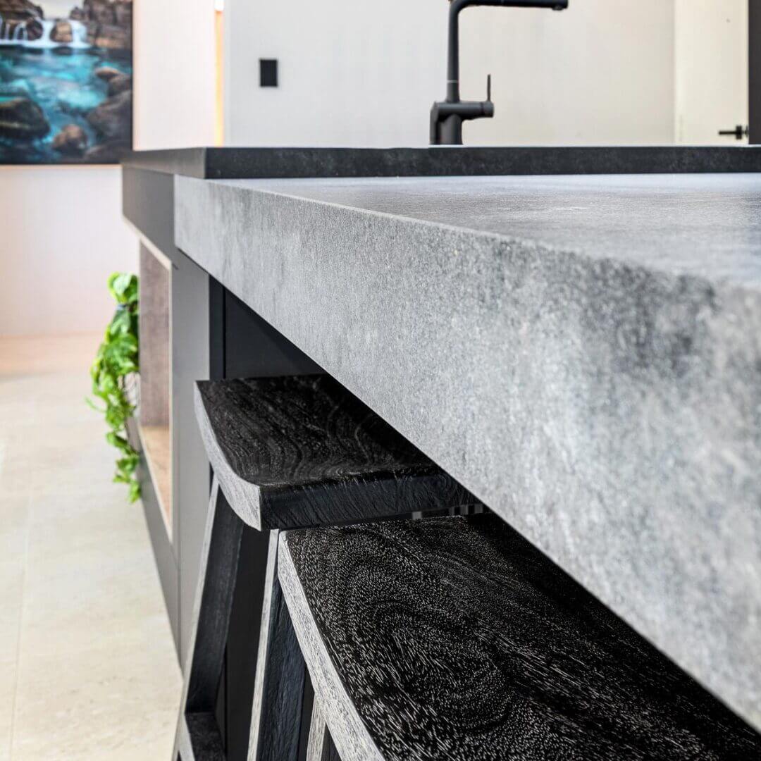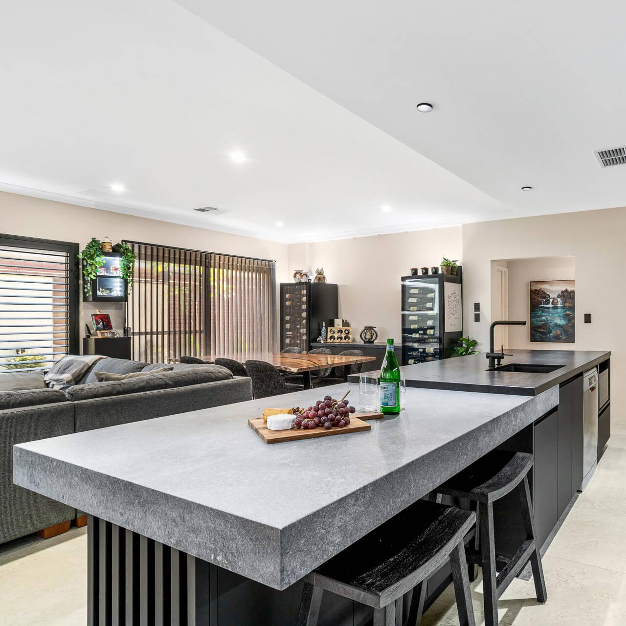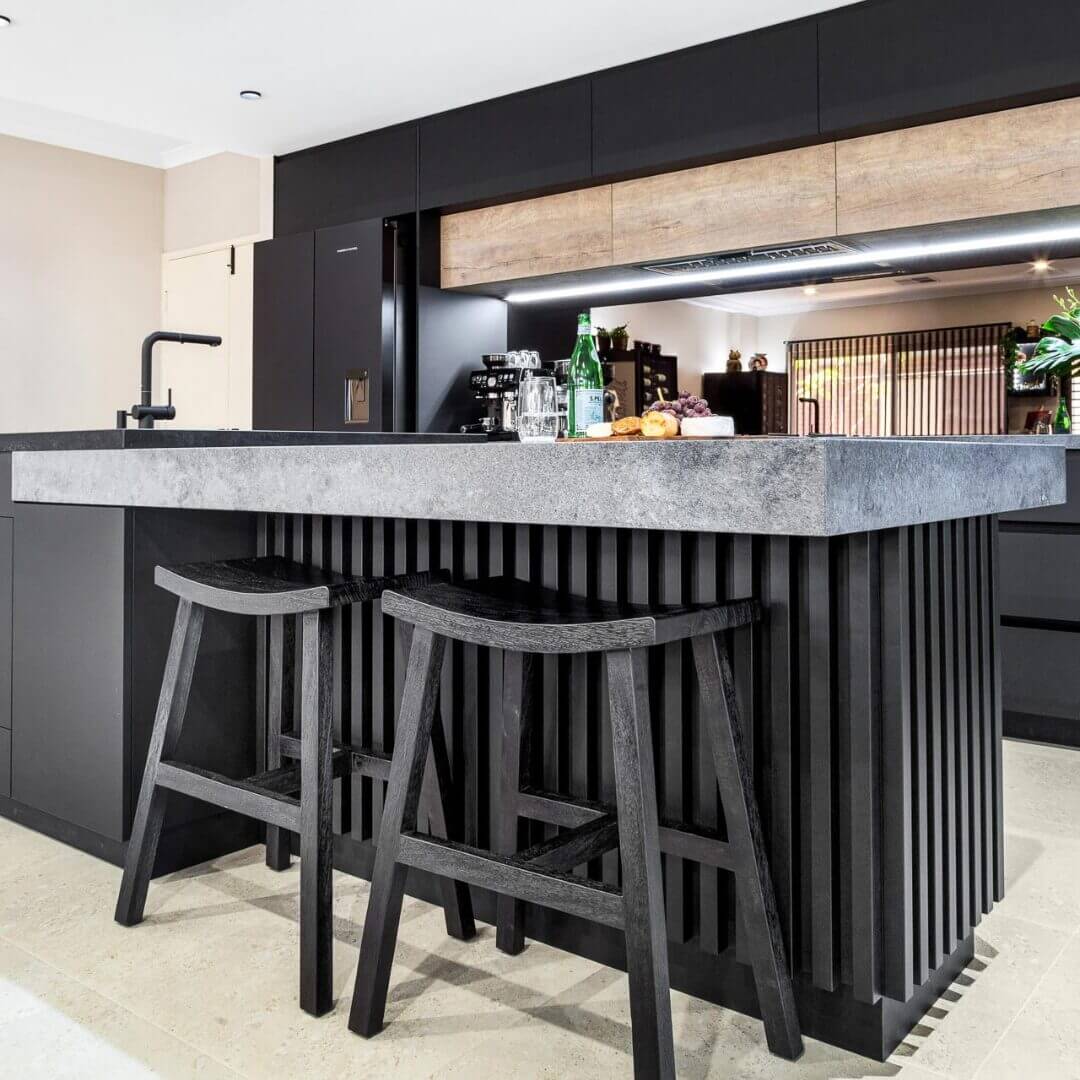 Simon and Manja had already purchased their luxury Falcon Nexus freestanding oven which stars as a central feature as part of this kitchen design. Caesarstone Black Tempal benchtops pair with Caesarstone Rugged Concrete in a super stylish layered kitchen island design.