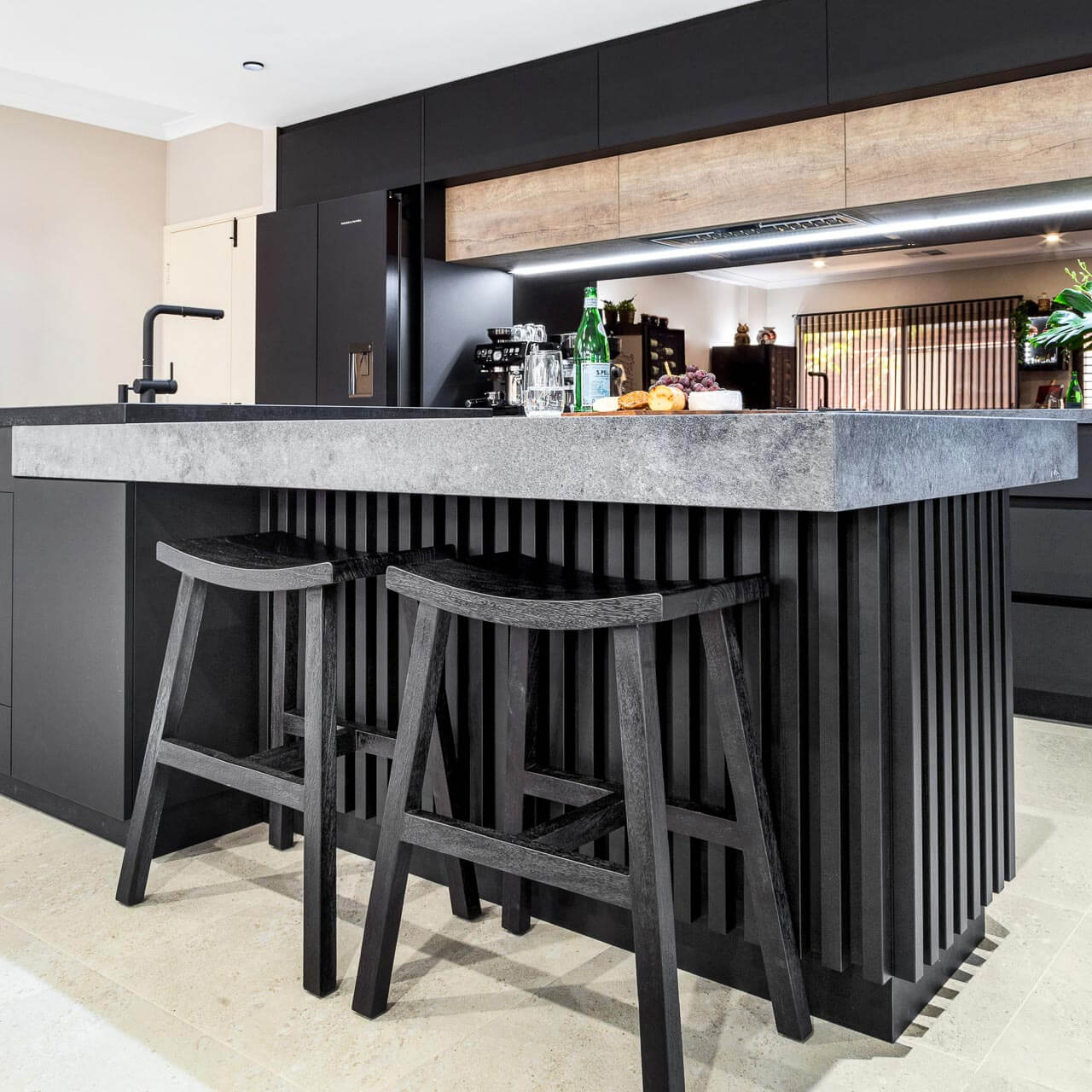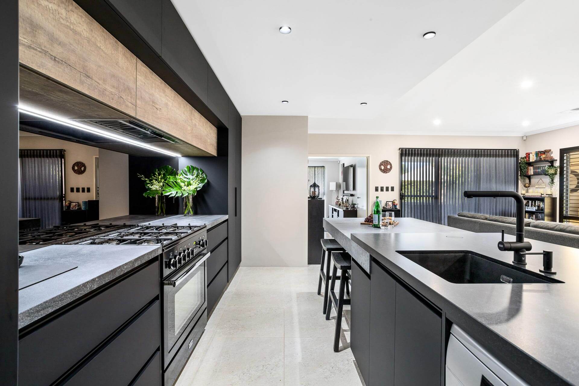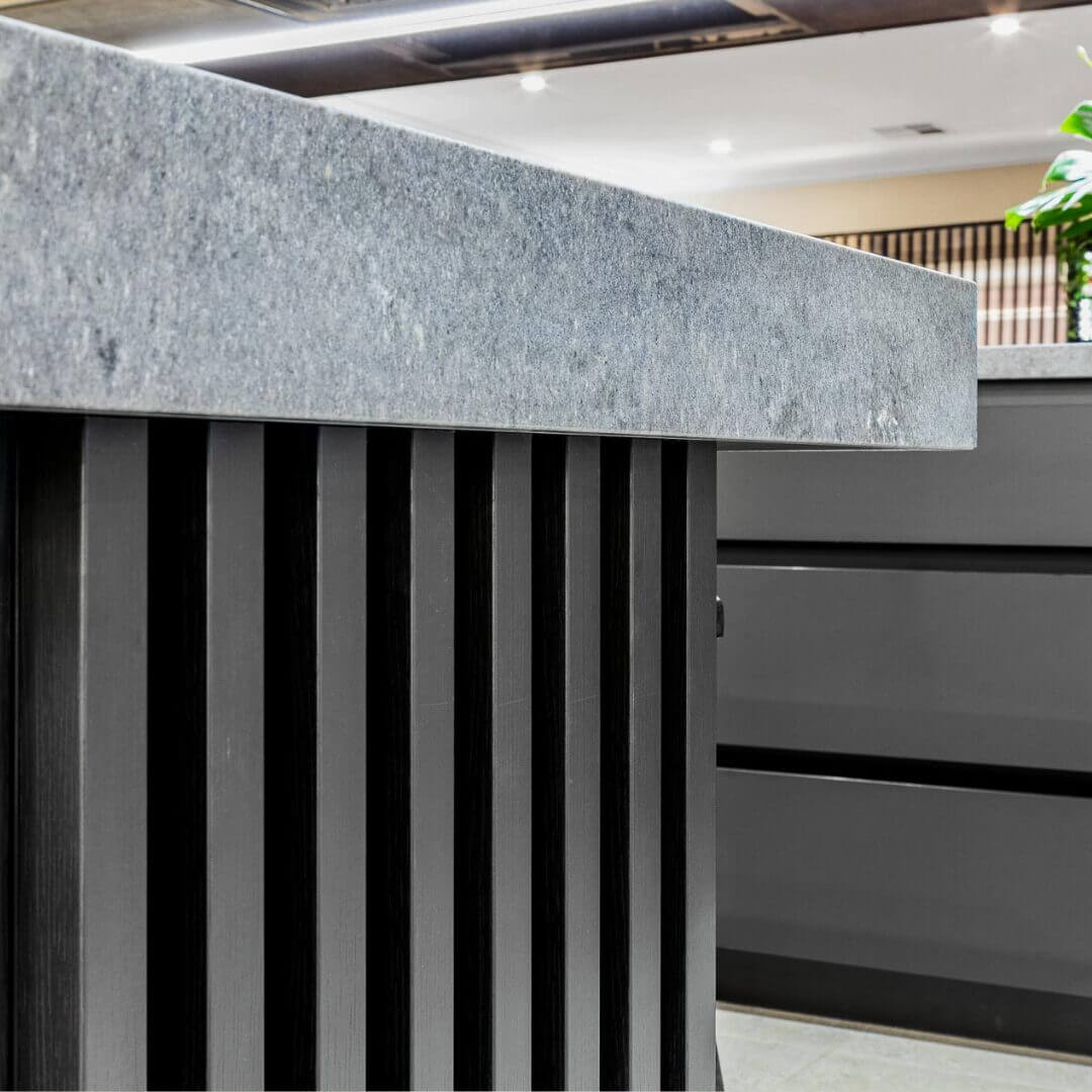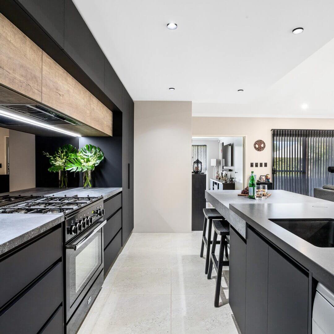 Simon and Manja had already purchased their luxury Falcon Nexus freestanding oven which stars as a central feature as part of this kitchen design. Caesarstone Black Tempal benchtops pair with Caesarstone Rugged Concrete in a super stylish layered kitchen island design.